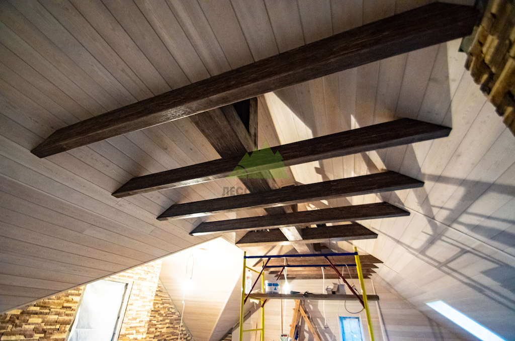 Наши специалисты, опираясь на многолетний опыт Лесобиржи-Спб в работе с древесиной и комплексными отделочными решениями, предложили клиенту оптимальные варианты материалов и технологий. Для потолка мансардного этажа была выбрана высококачественная вагонка "Штиль" из сибирской лиственницы сорта АВ(В). Выбор лиственницы не случаен – эта порода древесины идеально подходит для условий Санкт-Петербурга и Ленинградской области благодаря своей исключительной прочности, устойчивости к влаге и перепадам температур, а также великолепной текстуре, которая сохраняет свою красоту на долгие годы. Вагонка "Штиль" обеспечивает идеально ровную поверхность без видимых швов, создавая ощущение монолитности и благородства. Предварительная покраска вагонки осуществлялась в нашем собственном покрасочном цехе, где мы применили лаковую схему Teknos в глубоком и насыщенном цвете ТМ 1773. Это позволило добиться равномерного, долговечного покрытия и значительно ускорить процесс монтажа на объекте, минимизируя дискомфорт для заказчика.