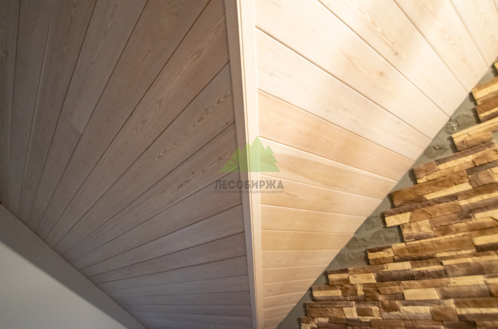 Монтаж вагонки производился с использованием усиленных кляймеров №5. Выбор этих крепежных элементов гарантирует не только надежное и прочное крепление каждой планки, но и полное отсутствие видимых шурупов или гвоздей, что создаёт идеально ровную и эстетически безупречную поверхность потолка. На стыках между отдельными участками вагонки были установлены аккуратные накладки из сосны шириной 30 мм, окрашенные в тот же цвет, что и основное покрытие. Это решение позволило не только скрыть места соединений, но и добавить элементам отделки завершенность и продуманность, подчеркивая внимание к деталям, которое присуще работе Лесобиржи-Спб.