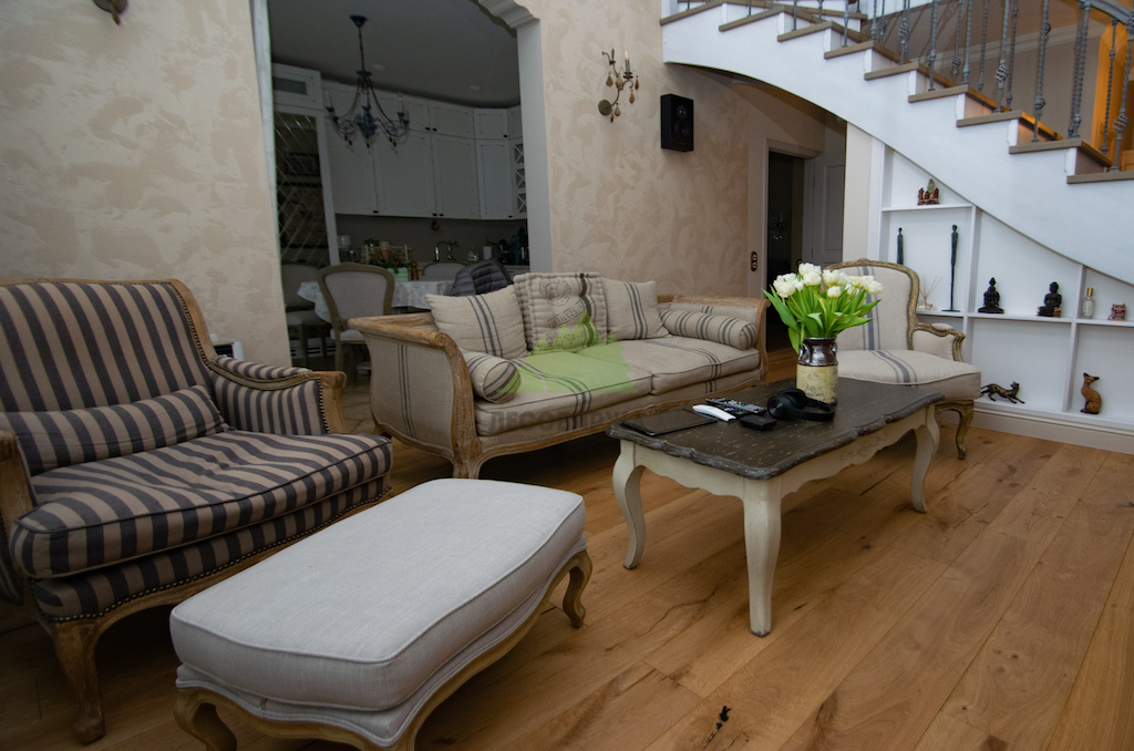 Для покраски лиственничного потолка мы применили белесый лак Teknos TEKNOCOAT AQUA 2550-02 (ТМ6943/06). Этот выбор обусловлен несколькими факторами: лак не только защищает древесину от внешних воздействий, но и сохраняет ее естественную текстуру, слегка осветляя поверхность и придавая ей тот самый "выцветший", нежный оттенок, характерный для стиля "Прованс". Специалисты нашего малярного цеха, обладающие глубокими знаниями и многолетним опытом работы с различными видами древесины и лакокрасочных материалов, добились идеального результата. Потолок приобрел легкий, воздушный вид, зрительно расширяя пространство гостиной и наполняя ее светом.