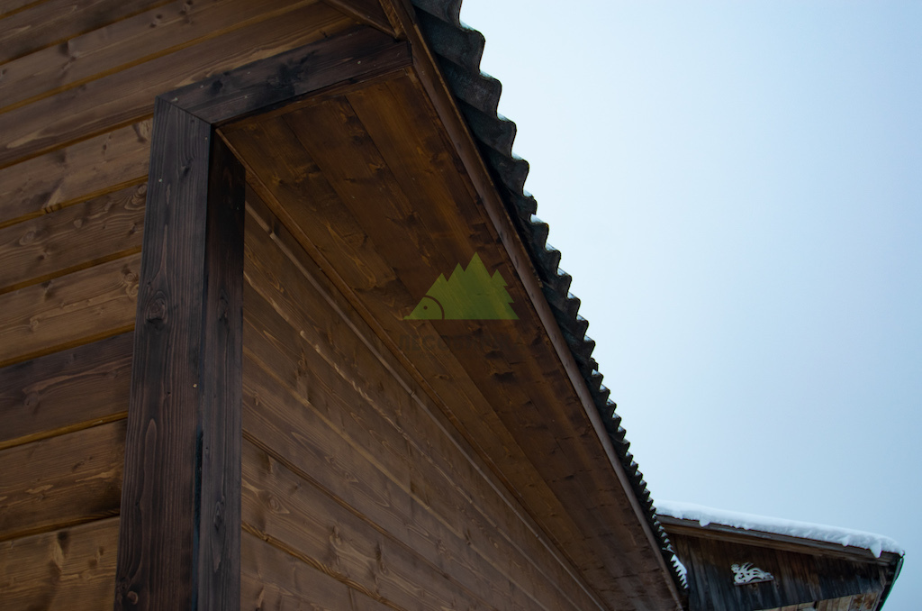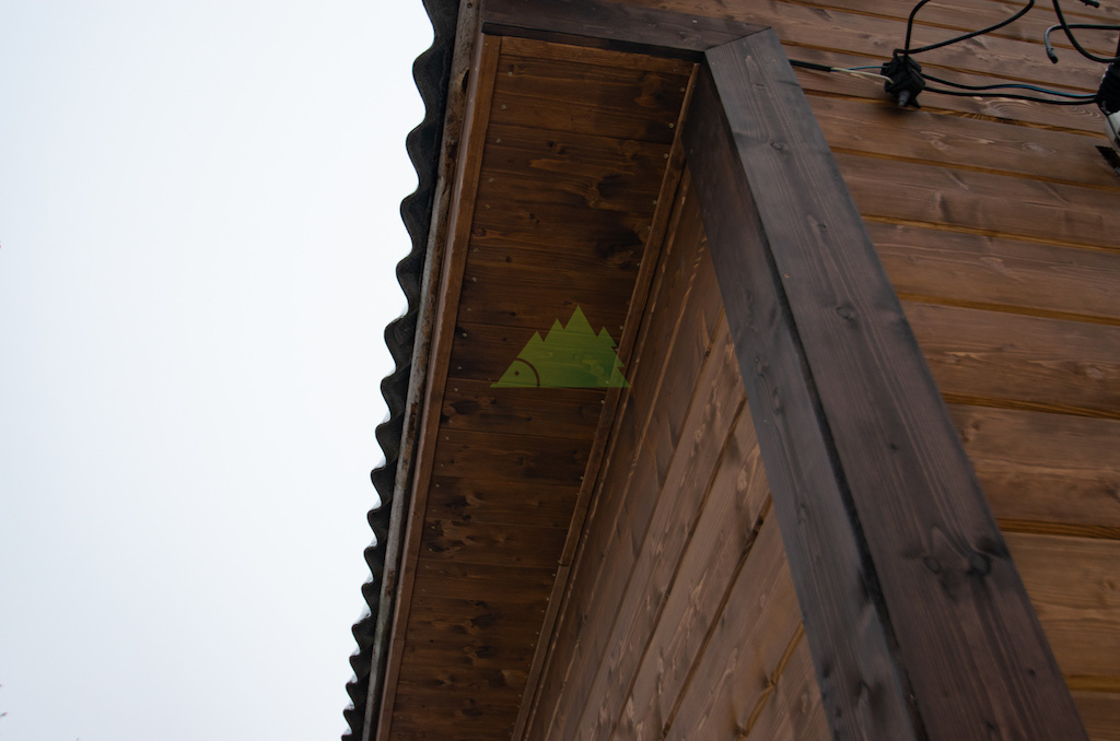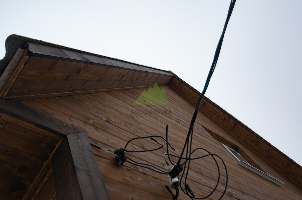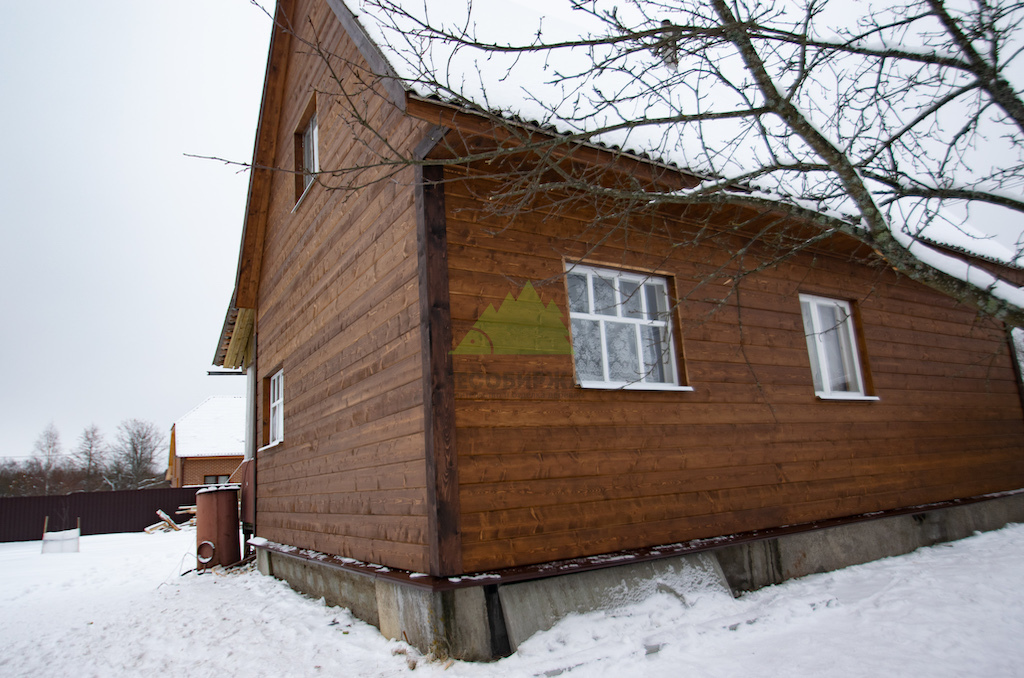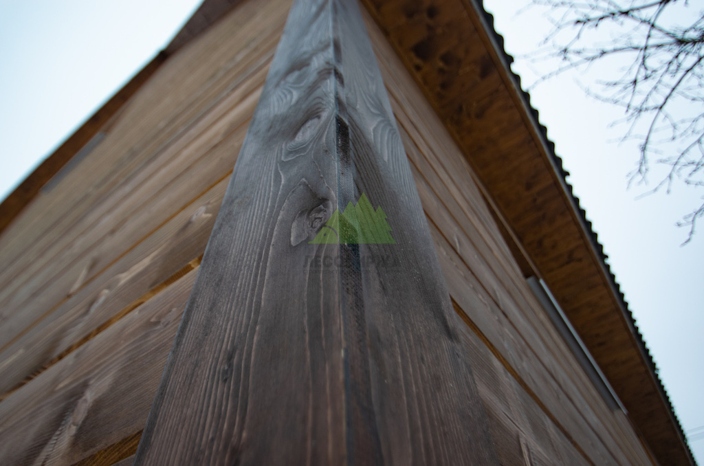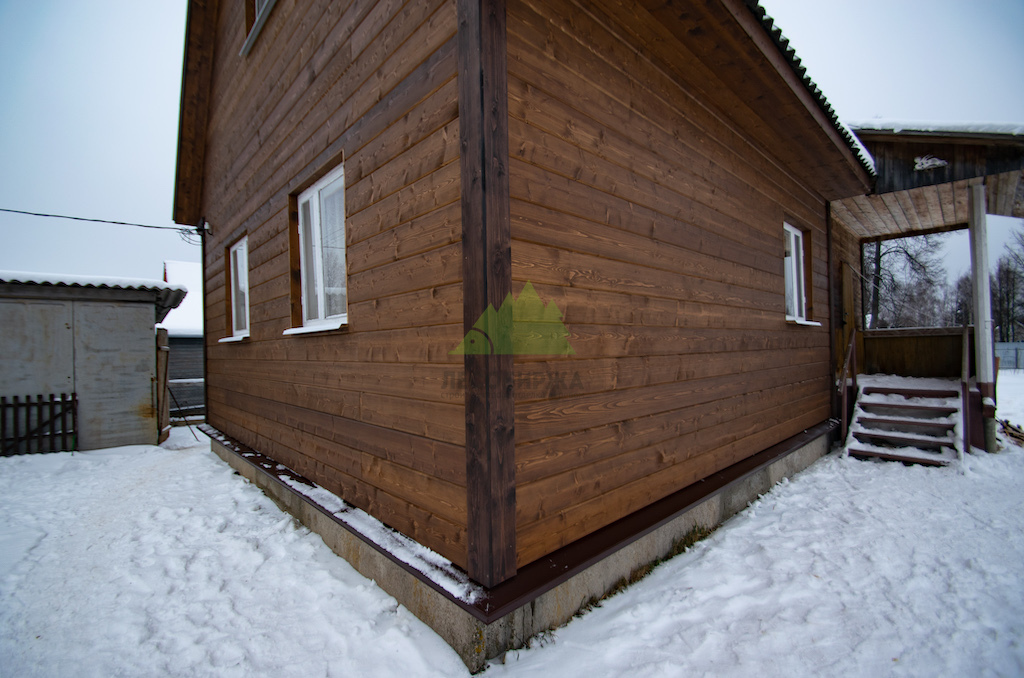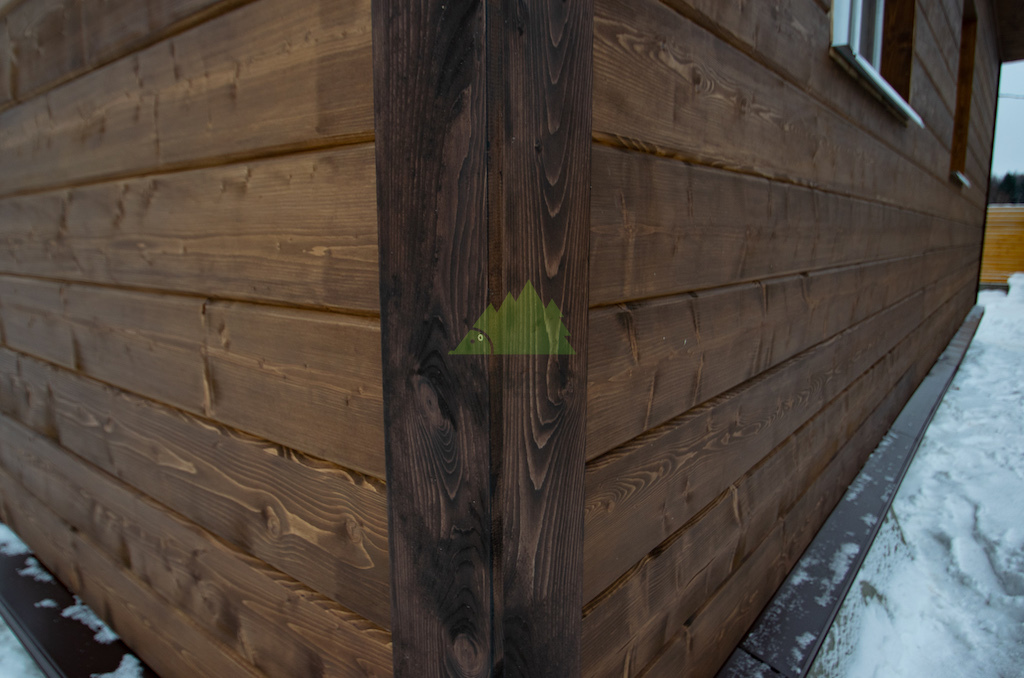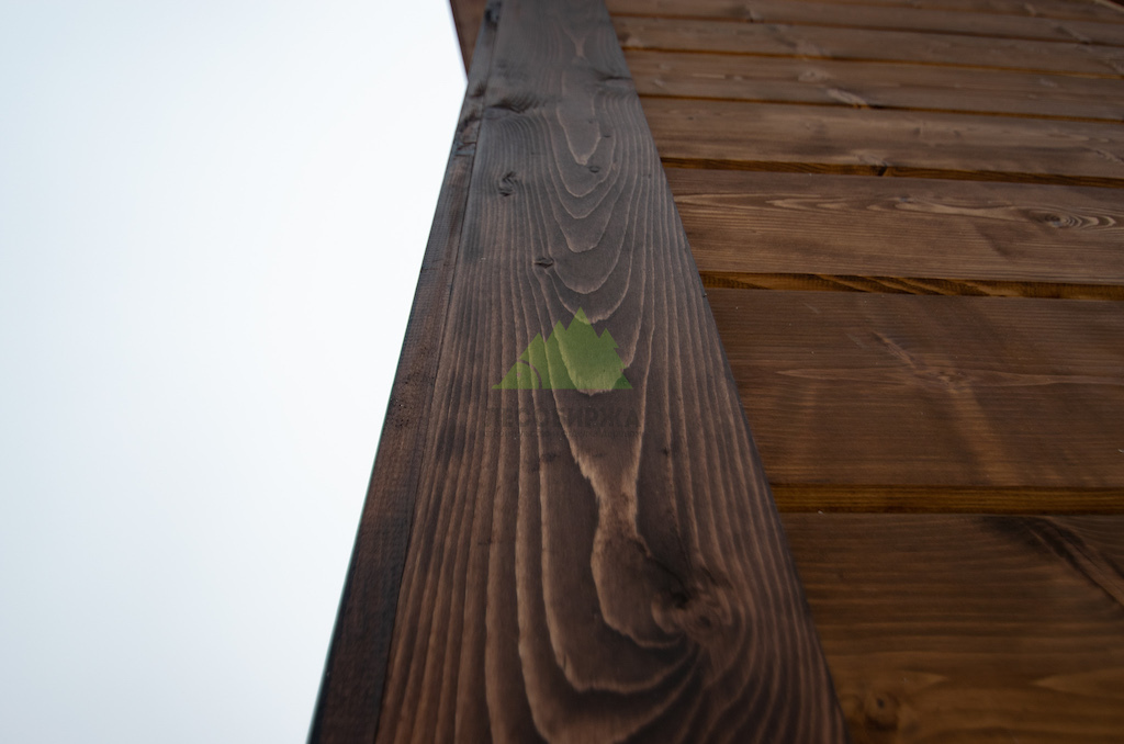 Особое внимание было уделено деталям и завершающим штрихам. Для подшива карнизных свесов крыши и оформления внешних углов дома был использован прямой планкен из сосны сорта АВ. Это решение не только придает фасаду законченный и аккуратный вид, но и обеспечивает дополнительную защиту уязвимых элементов конструкции. Планкен для углов был тонирован в чуть более насыщенный оттенок, что создало интересный контраст и подчеркнуло архитектурные линии дома, гармонично вписавшись в общую цветовую гамму фасада.