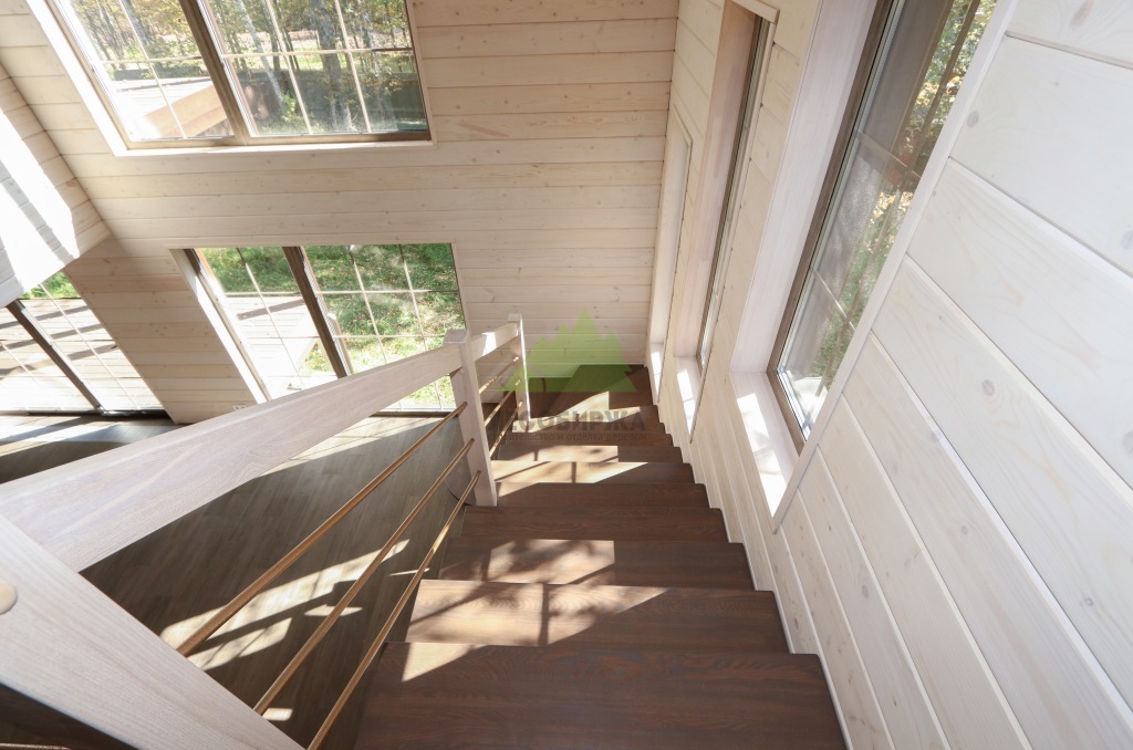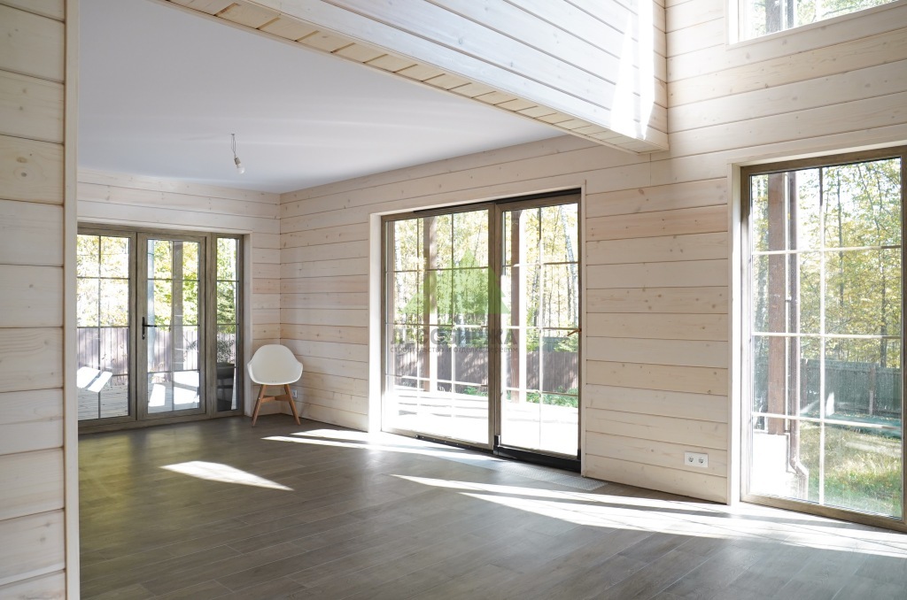 Панели имитации бруса "Карельский профиль" были успешно применены и для внутренней отделки дома, создавая атмосферу уюта и тепла. Для интерьерных работ мы выбрали финишное покрытие воском S&H в элегантном цвете NCSS-0500-N. Этот бледно-бежевый оттенок воска выглядит невероятно естественно и благородно. Он не только придает стенам утонченный вид, но и визуально расширяет пространство, наполняя его светом и легкостью. Воск, в отличие от лаков, сохраняет тактильные ощущения от дерева, позволяя ему "дышать" и поддерживать здоровый микроклимат в помещении.