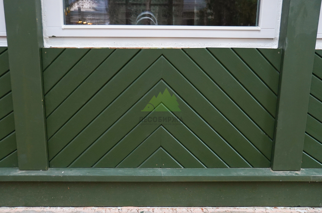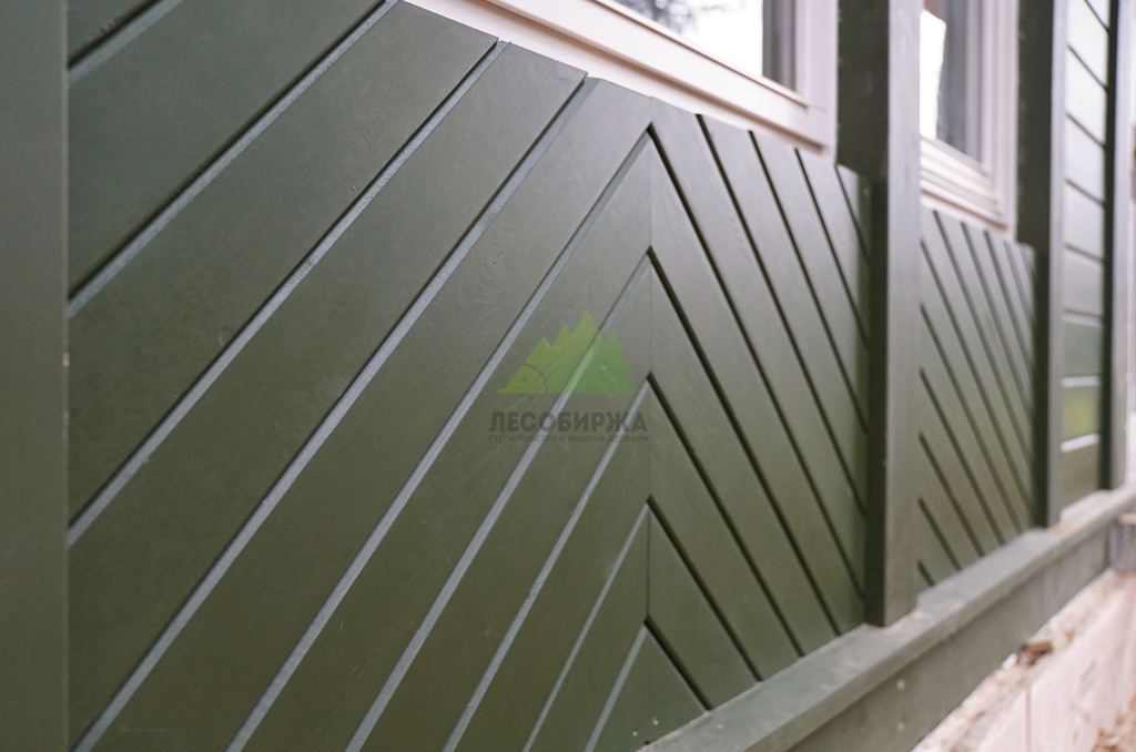 Особенность нашего подхода заключалась в использовании двух методов монтажа на фасаде: классического горизонтального и монтажа “елочкой”. Классический горизонтальный монтаж придал фасаду бани элегантность и строгость, создавая ровные, упорядоченные линии. В то же время, монтаж “елочкой” добавил динамичности и игривости, оживив поверхность и придав ей особый ретро-шарм.