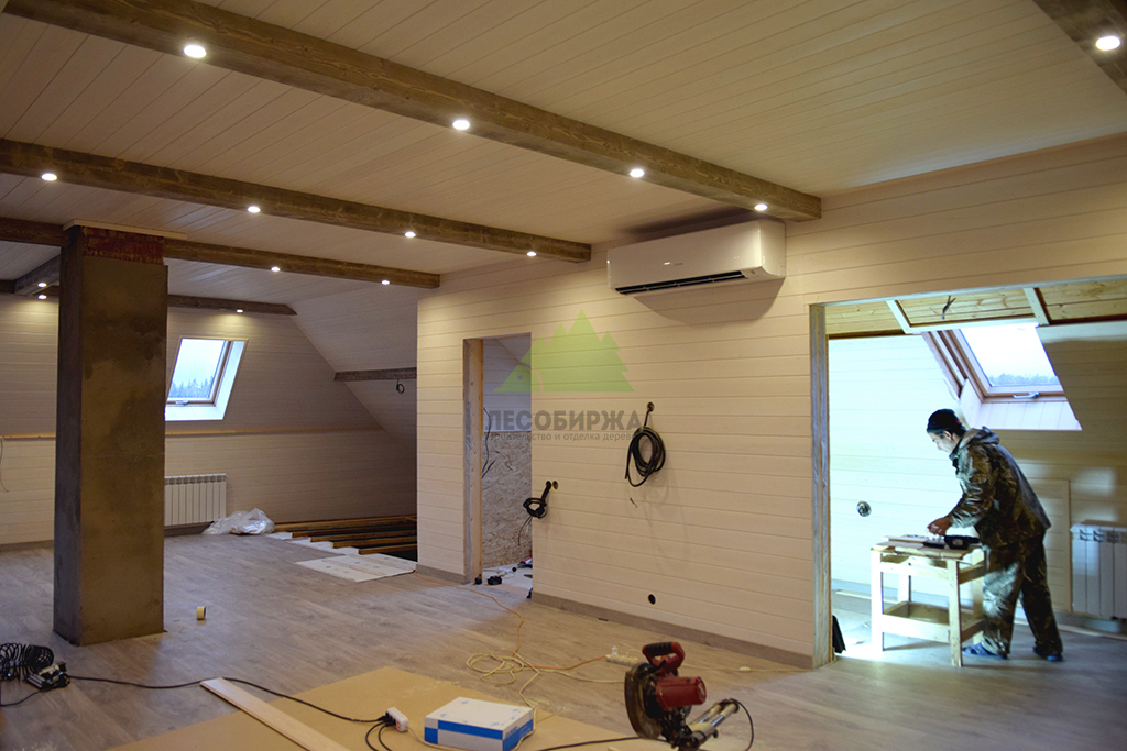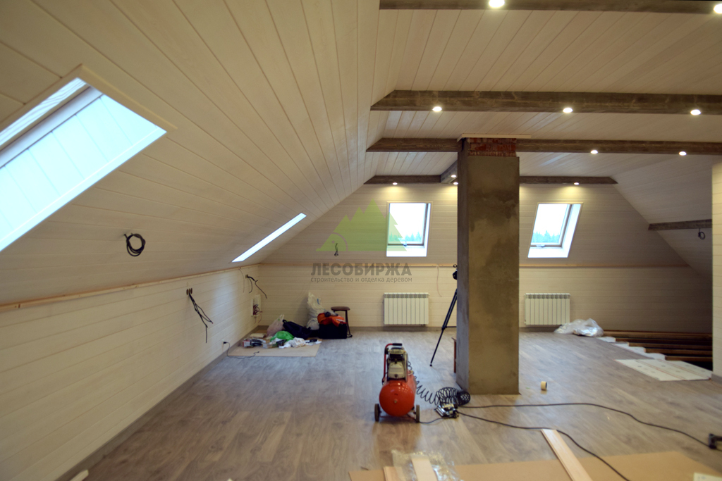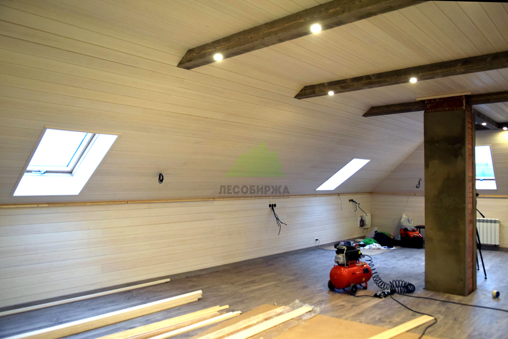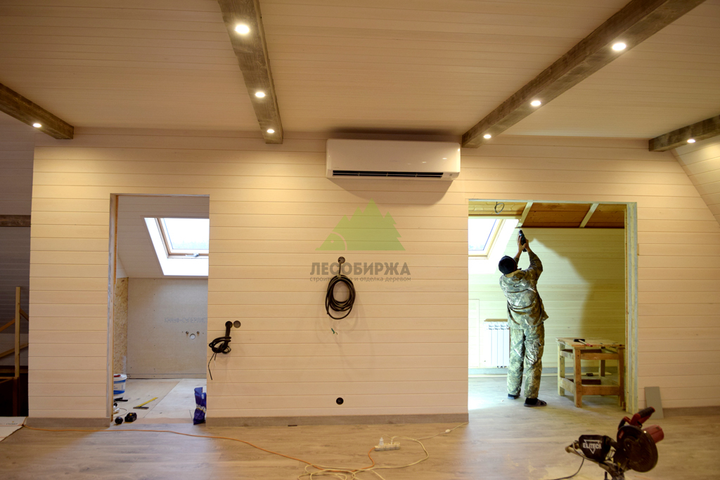 В Лесобирже-Спб мы гордимся тем, что воплощаем в жизнь самые смелые и продуманные проекты наших клиентов, превращая их идеи в реальность. Одним из таких ярких примеров стала работа над интерьером частного дома в живописном коттеджном посёлке Павловские холмы, расположенном в Ленинградской области. Заказчики обратились к нам с детальным видением своего будущего интерьера: им требовалась внутренняя отделка стен и потолков вагонкой, а также монтаж декоративных фальшбалок. Ключевым требованием было использование исключительно натуральных, паропроницаемых материалов и составов, чтобы дерево могло "дышать", создавая в доме здоровую и комфортную атмосферу.