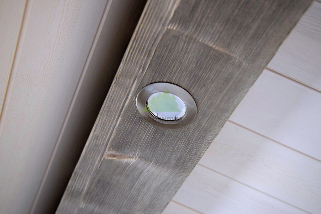 Завершающим штрихом в создании целостного и гармоничного интерьера стали декоративные фальшбалки на потолке. Эти балки также были произведены в цехах Лесобиржи-Спб из отборной европейской сосны и окрашены итальянской лазурью Renner YM M 349. Материал прошёл тщательную ручную брашировку с использованием ручного фрезера: сначала металлическая щётка удаляет мягкие волокна, затем пластиковая — убирает шероховатости, придавая поверхности идеально гладкий, но рельефный вид. Фальшбалки идеально вписались в общую концепцию, добавив интерьеру объёма, глубины и неповторимого шарма, при этом оставаясь лёгкими и изящными.