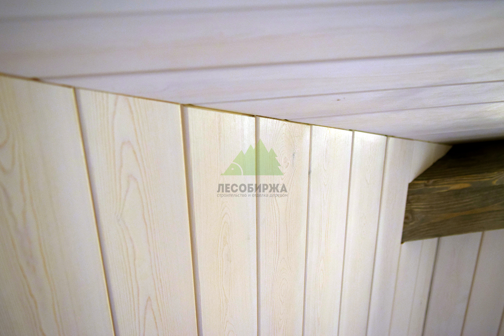 После браширования вагонка была покрыта двумя слоями белёсого натурального воска. Нанесение в несколько тонких слоёв позволяет достичь полуукрывного эффекта, сохраняя максимальную паропроницаемость и обеспечивая "дыхание" древесины. Для ещё более выразительной подачи панелей и усиления природной статики, наши мастера провели ручной затир поверхности бруском с зернистостью 150. Этот кропотливый, ручной процесс позволил придать древесине особую глубину и выразительность, делая текстурный рисунок фантастически красивым и чётко видимым.