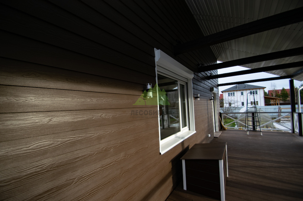 Для создания террасы была выбрана террасная доска из древесно-полимерного композита (ДПК) благородного цвета "молочный шоколад". Этот материал стал идеальным дополнением к фасаду, создавая единую цветовую и стилистическую концепцию. ДПК доска отличается исключительной прочностью и долговечностью, что гарантирует ее надежность даже при интенсивной эксплуатации и в условиях переменчивой влажности Ленинградской области. Ее ребристая поверхность предотвращает скольжение, обеспечивая безопасность передвижения даже в сырую погоду, что особенно важно для террасы, где проводят время с семьей и друзьями.