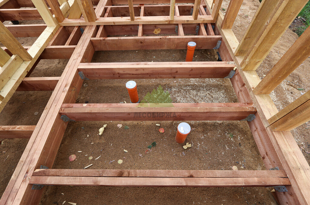Терраса из палубной доски лиственницы со стойками, балками и ограждением