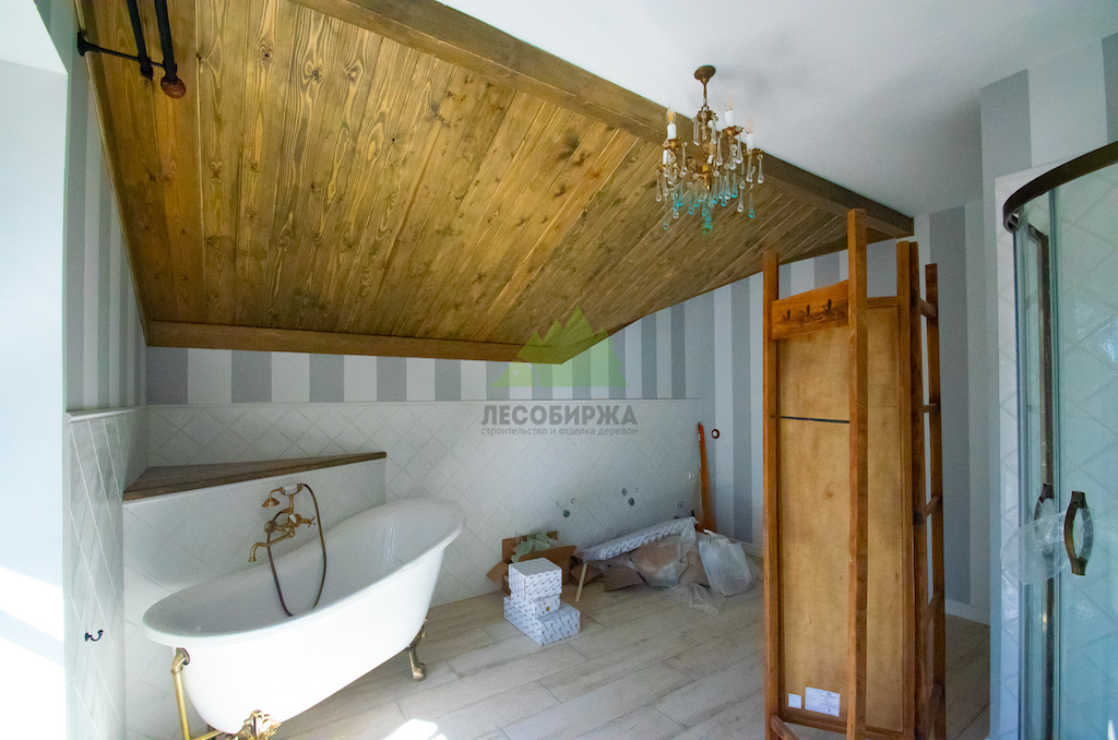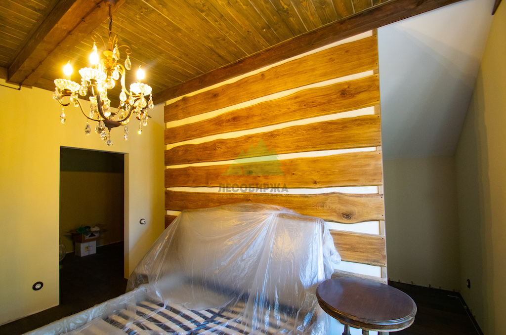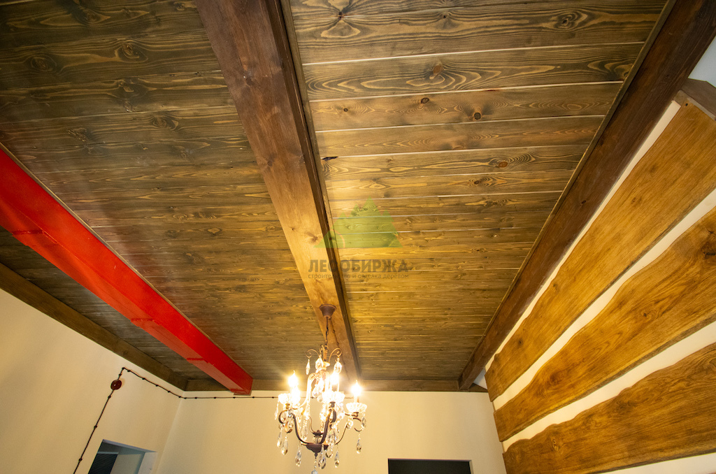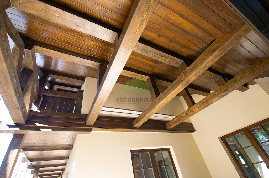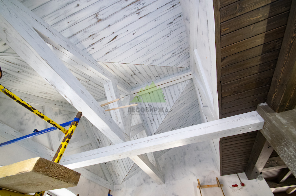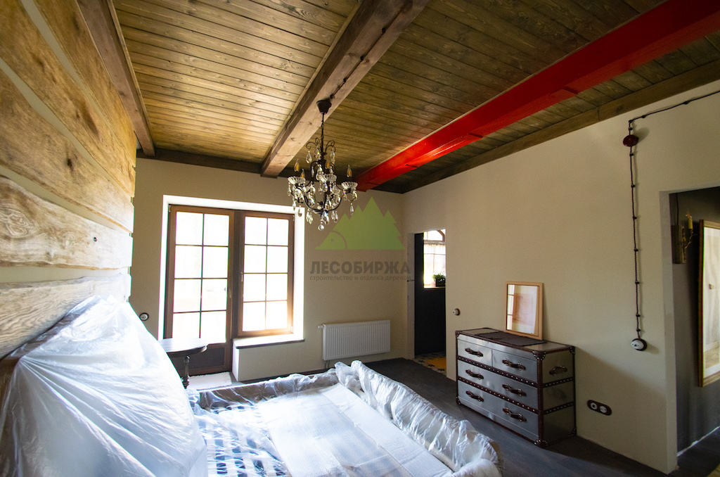 Особое внимание уделялось созданию атмосферы "старины", характерной для альпийских домов. Потолки в доме были спроектированы и выполнены таким образом, чтобы имитировать давнюю историю строения. Специалисты столярного и малярного цехов Лесобиржи-Спб использовали вагонку из обычной сосны сорта А, которую затем подвергли специальной обработке для эффекта состаривания. Над головами "нависают" фальшбалки из лиственницы, искусно имитирующие старинные, массивные элементы. Они были уложены крест-накрест, создавая особенный колорит и ощущение фундаментальности, перенося жильцов в атмосферу минувших лет. Сочетание состаренных элементов с более современными решениями, такими как молочные участки потолка, окрашенные укрывной краской NORDICA EKO 3330 с эффектом состаривания, и более темное покрытие досок лиственницы, создало необычайно выразительный и гармоничный интерьер. Идеально подобранное сочетание тонов и материалов подчеркнуло уникальность каждого помещения.