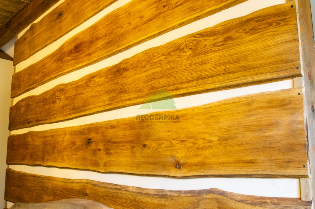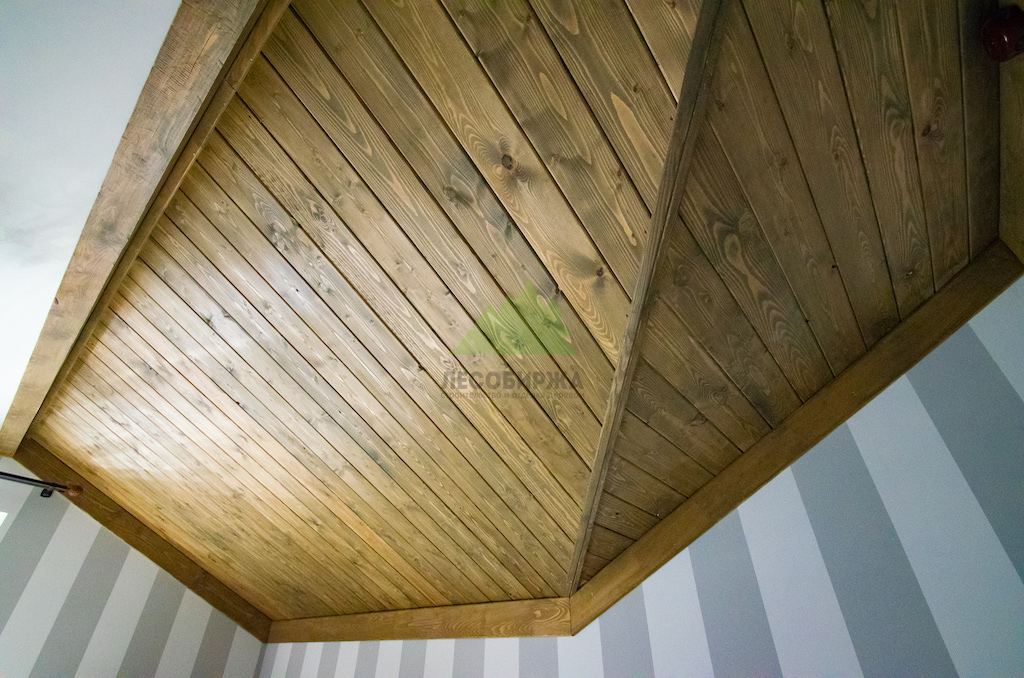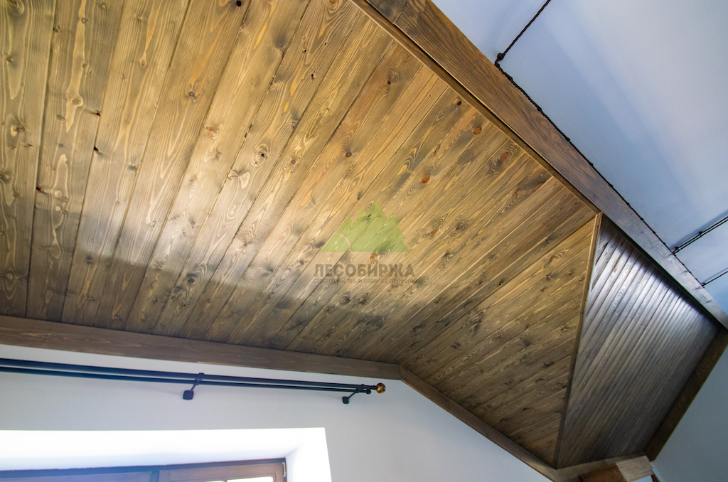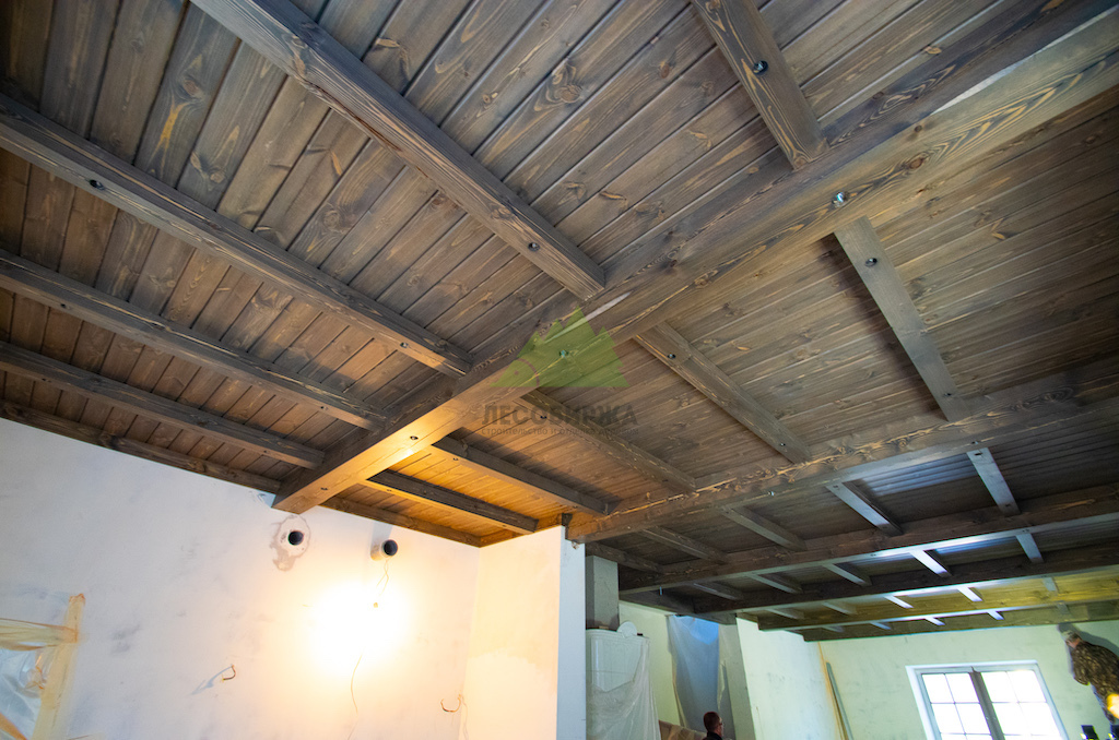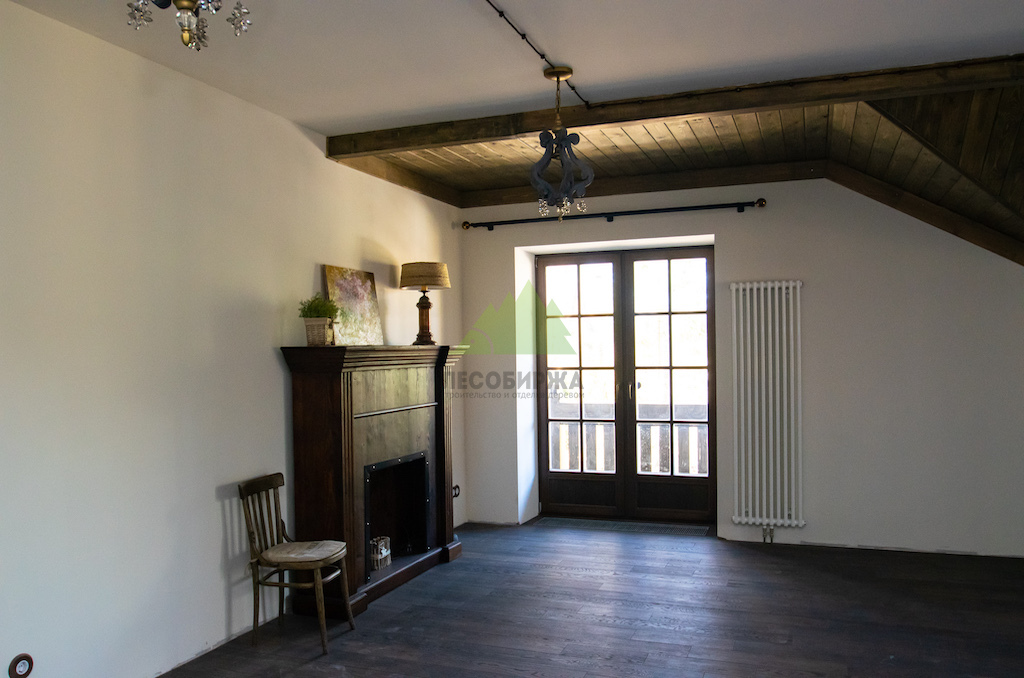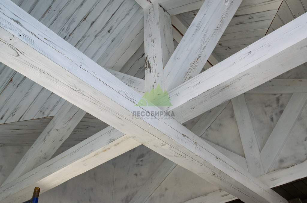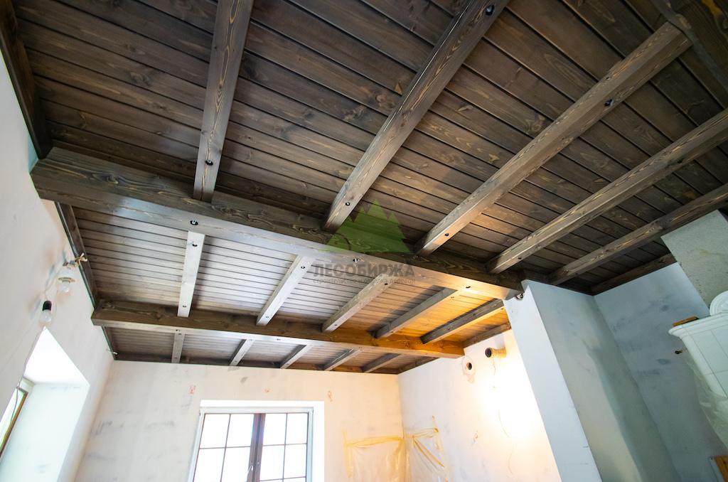 Особое внимание уделялось созданию атмосферы "старины", характерной для альпийских домов. Потолки в доме были спроектированы и выполнены таким образом, чтобы имитировать давнюю историю строения. Специалисты столярного и малярного цехов Лесобиржи-Спб использовали вагонку из обычной сосны сорта А, которую затем подвергли специальной обработке для эффекта состаривания. Над головами "нависают" фальшбалки из лиственницы, искусно имитирующие старинные, массивные элементы. Они были уложены крест-накрест, создавая особенный колорит и ощущение фундаментальности, перенося жильцов в атмосферу минувших лет. Сочетание состаренных элементов с более современными решениями, такими как молочные участки потолка, окрашенные укрывной краской NORDICA EKO 3330 с эффектом состаривания, и более темное покрытие досок лиственницы, создало необычайно выразительный и гармоничный интерьер. Идеально подобранное сочетание тонов и материалов подчеркнуло уникальность каждого помещения.