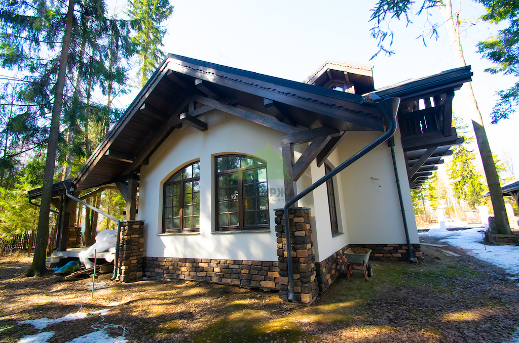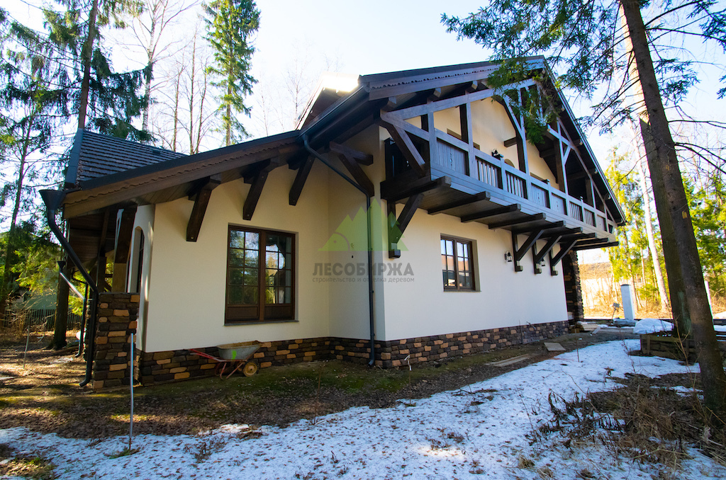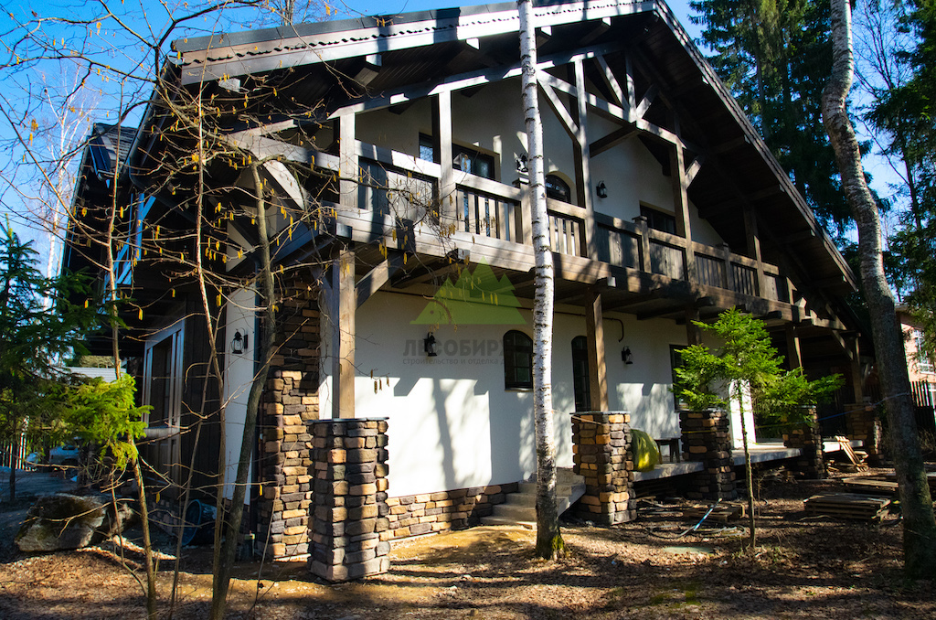 Изначально перед нами стояла задача от клиента: на основе готового проекта возвести дом из газобетонных блоков и выполнить его фасадную отделку в аутентичном стиле "Шале", используя комбинацию штукатурки и натуральных деревянных панелей. Хотя Лесобиржа-Спб специализируется на строительстве и отделке деревянных домов, мы регулярно принимаем в работу проекты, где наши компетенции в области работы с деревом и создания уникальных интерьерных и экстерьерных решений применяются для строений из других материалов. В данном случае, основной каркас дома из газобетона был уже возведен, и наша задача заключалась в его "перевоплощении" — создании той самой неповторимой атмосферы альпийского шале, где каждый элемент дышит уютом и гармонией с природой. Наши мастера взяли на себя не только отделочные работы, но и возведение конструкции кровли, установку опор и столбов, которые стали ключевыми элементами для формирования будущего облика коттеджа в желаемом стиле.