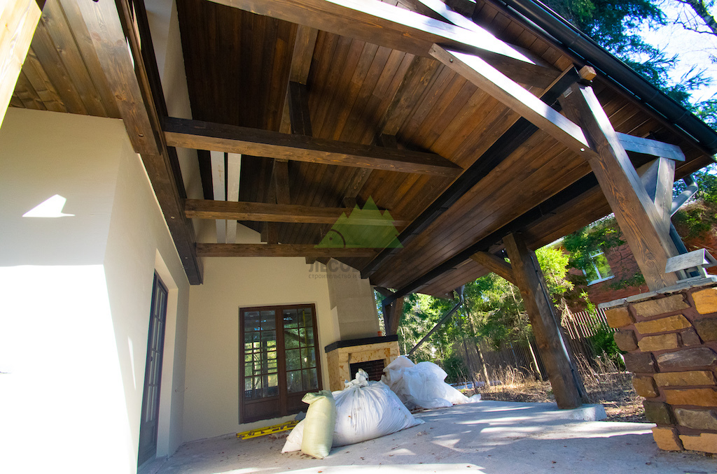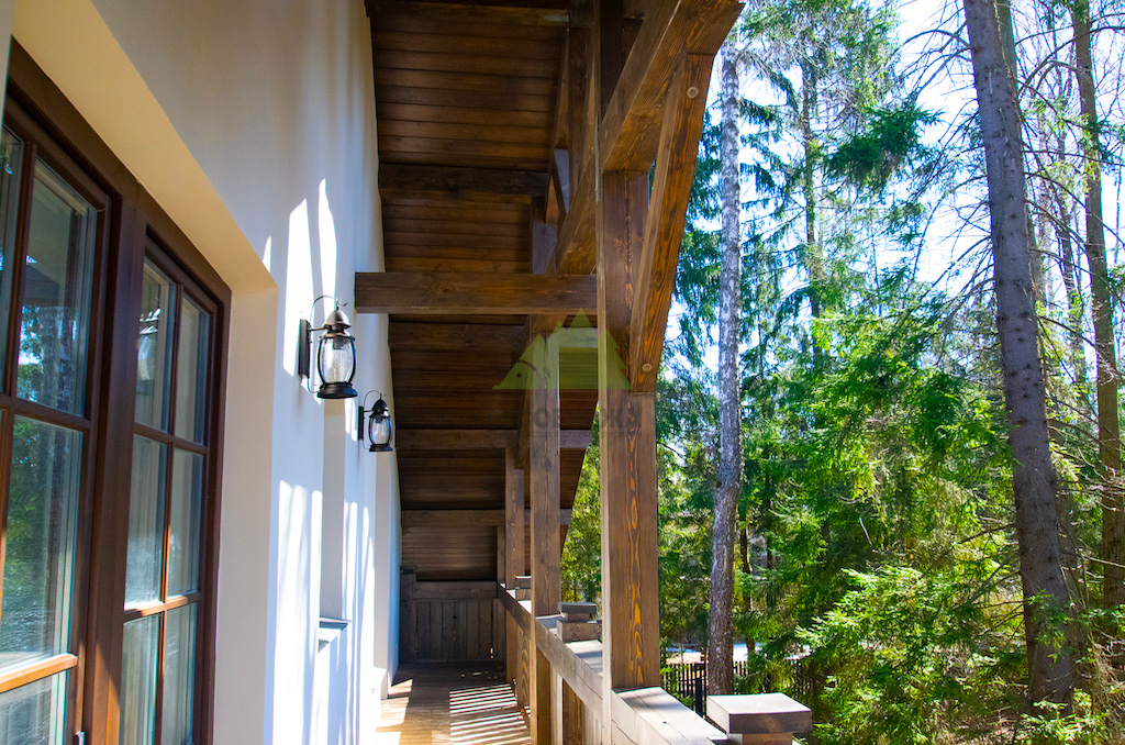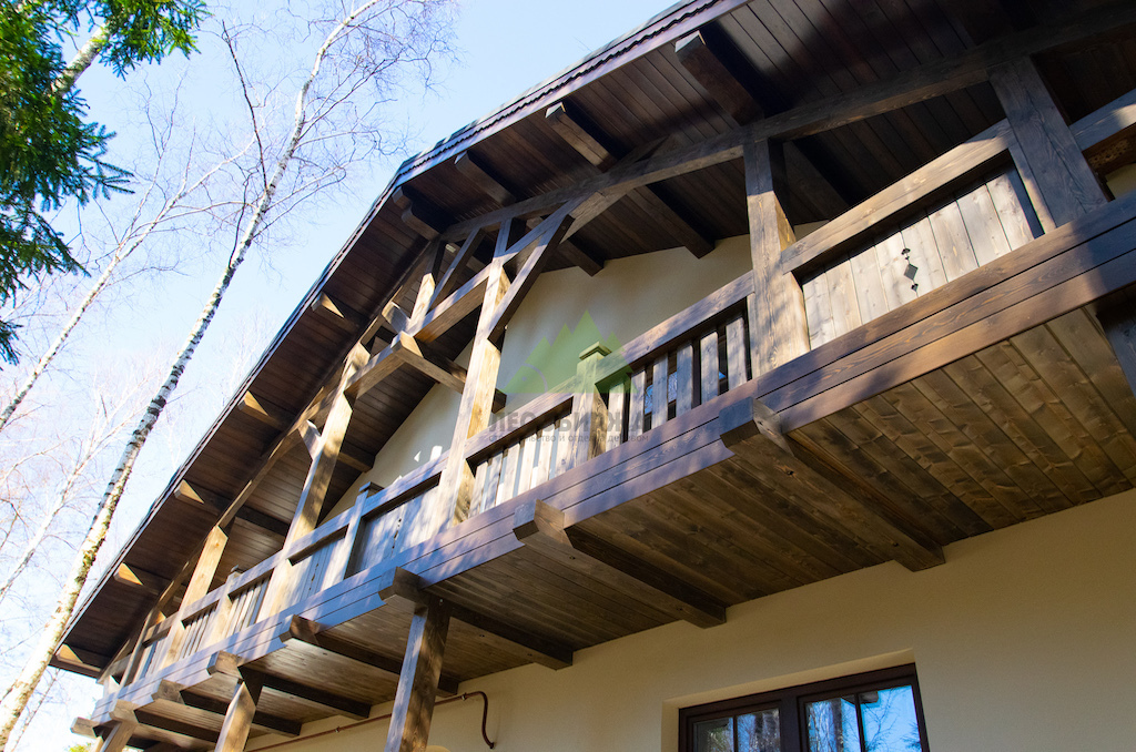 1. Фасадные работы и создание фахверковой системы: Мы начали с тщательной подготовки поверхности фасада. Это включало очистку от старых покрытий, нанесение антигрибковых составов для защиты и долговечности конструкции, а также грунтование. После этого был установлен цокольный профиль с технологическими зазорами и закреплен утеплитель, что обеспечило надежную теплоизоляцию. Нанесение штукатурного состава – выбор типа которого (силикатный, акриловый, минеральный) осуществлялся в соответствии с пожеланиями заказчика и особенностями эксплуатации – стало финишным этапом основной отделки. Оштукатуренные фасады не только придают дому природный и декоративный вид, но и эффективно сохраняют тепло, обеспечивая надежную защиту стен при минимальной нагрузке на фундамент. Параллельно с этим, ключевым элементом для придания дому облика "Шале" стало создание фахверковой системы. Для этого мы заказывали и обрабатывали в собственном производственном цеху планкен из сибирской лиственницы сорта АВ, который затем использовался для отделки свесов кровли. Особая лобовая резная доска, выполненная нашими мастерами, дополнила архитектурный ансамбль. Для придания дереву необходимого эффекта старины и защиты, проводилась обработка и браширование панелей составами Teknos.