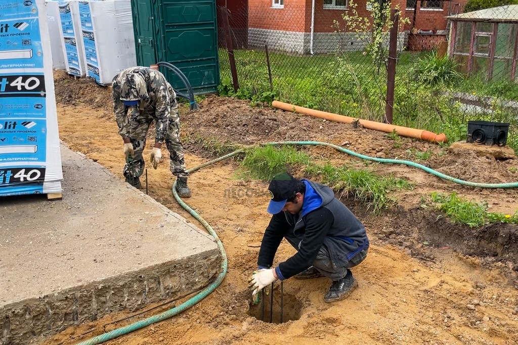 - Установка арматурных каркасов: В каждую пробуренную скважину был опущен заранее изготовленный арматурный каркас. Каркасы были выполнены из высококачественной стальной арматуры в строгом соответствии с проектом, обеспечивая необходимую прочность и жёсткость будущих свай. Особое внимание уделялось правильному расположению каркасов и их фиксации перед бетонированием.