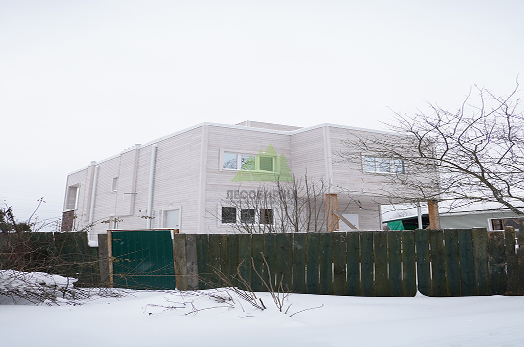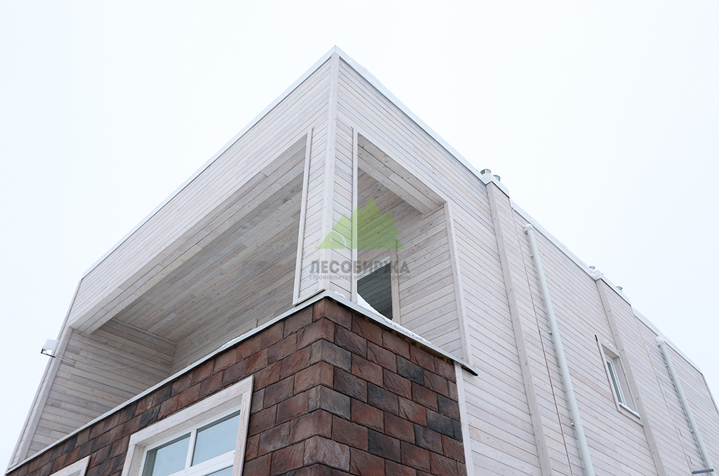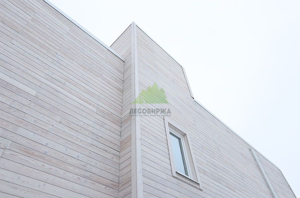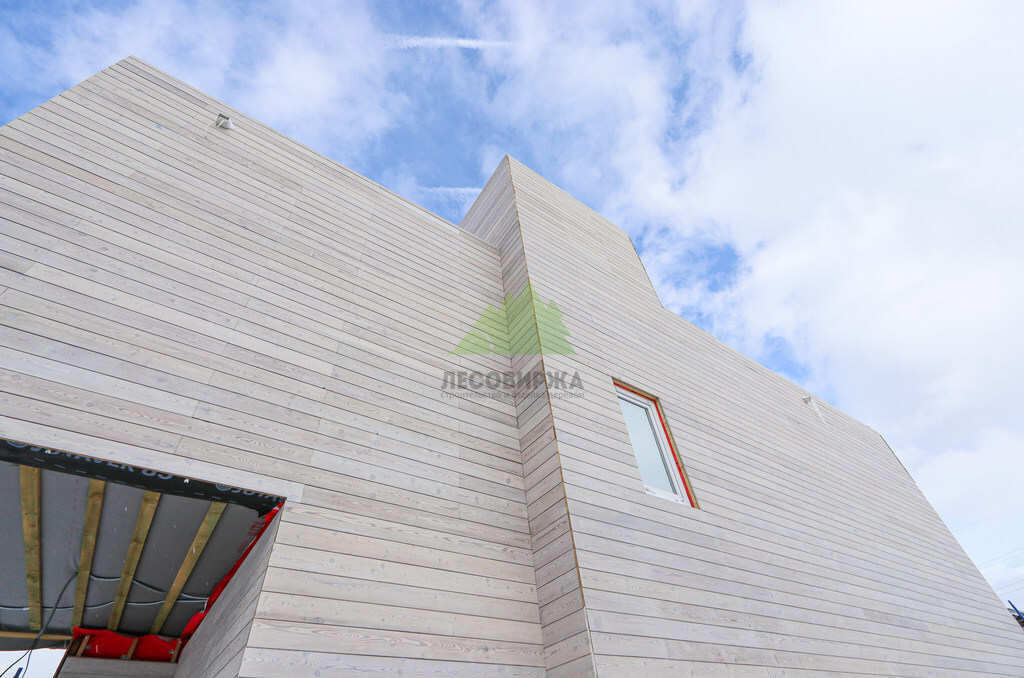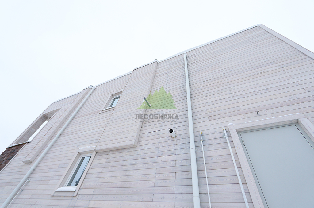 Внешний вид дома задумывался как сочетание современного дизайна и природной элегантности. Для наружной отделки стен мы выбрали скошенный планкен из термированной лиственницы сорта ВС. Выбор термолиственницы неслучаен: это материал, прошедший специальную термическую обработку в наших производственных цехах. Термирование придает древесине исключительную устойчивость к влаге, гниению, грибку и вредителям, значительно увеличивает ее долговечность и стабильность размеров, предотвращая деформации. Термированная лиственница практически не впитывает влагу и не рассыхается, что делает ее идеальным решением для переменчивого климата Санкт-Петербурга и Ленинградской области. Сорт ВС гарантирует привлекательный внешний вид с допустимым количеством естественных природных характеристик древесины, которые придают фасаду живость и натуральность. Крепление скошенного планкена осуществлялось при помощи скрытого крепежа LesFix нашего собственного производства, оснащенного стопором. Этот оцинкованный крепеж полностью атмосферостоек и обеспечивает надежную фиксацию досок без видимых элементов, что создает идеально ровную и эстетичную поверхность фасада. Скошенный профиль планкена не только придает фасаду динамичный и современный вид, но и способствует эффективному отведению влаги, улучшая вентиляцию под облицовкой. Окончательный цвет планкена был подобран в соответствии с дизайн-проектом и нанесен в нашем современном малярном цехе. Профессиональная окраска в заводских условиях обеспечивает равномерное покрытие, глубокий цвет и максимальную долговечность лакокрасочного слоя, защищая древесину от ультрафиолета и атмосферных воздействий на долгие годы.