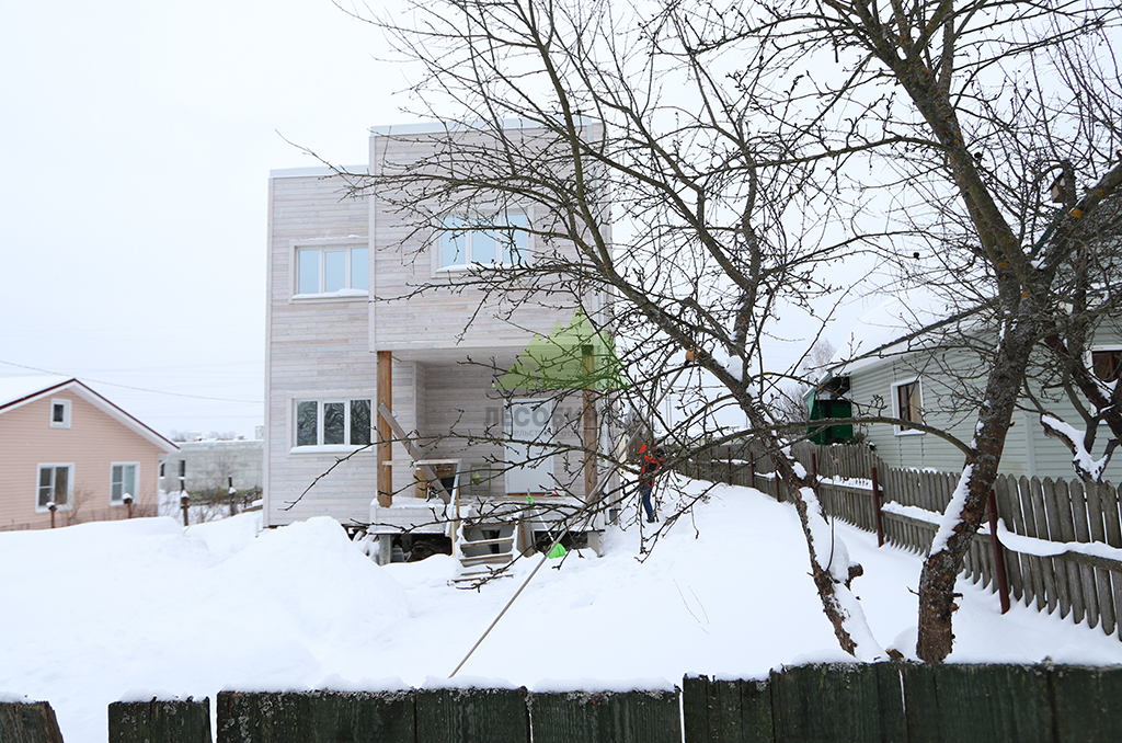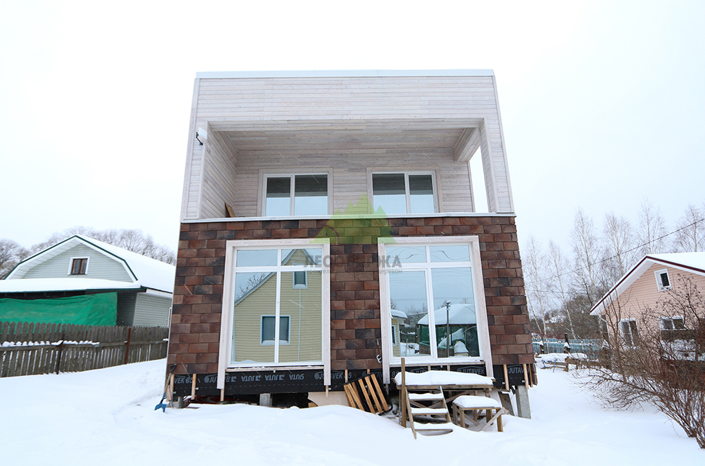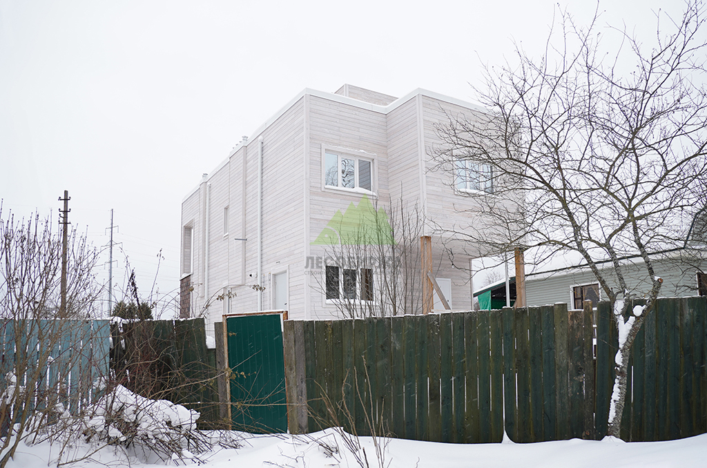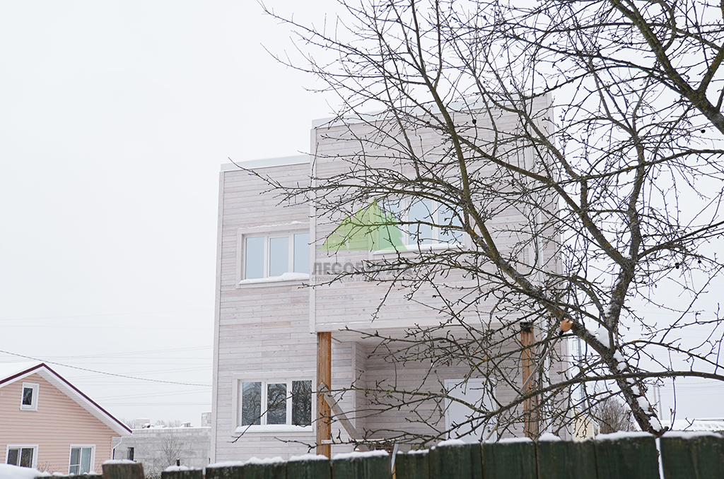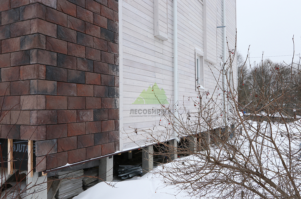 Внешний вид дома задумывался как сочетание современного дизайна и природной элегантности. Для наружной отделки стен мы выбрали скошенный планкен из термированной лиственницы сорта ВС. Выбор термолиственницы неслучаен: это материал, прошедший специальную термическую обработку в наших производственных цехах. Термирование придает древесине исключительную устойчивость к влаге, гниению, грибку и вредителям, значительно увеличивает ее долговечность и стабильность размеров, предотвращая деформации. Термированная лиственница практически не впитывает влагу и не рассыхается, что делает ее идеальным решением для переменчивого климата Санкт-Петербурга и Ленинградской области. Сорт ВС гарантирует привлекательный внешний вид с допустимым количеством естественных природных характеристик древесины, которые придают фасаду живость и натуральность. Крепление скошенного планкена осуществлялось при помощи скрытого крепежа LesFix нашего собственного производства, оснащенного стопором. Этот оцинкованный крепеж полностью атмосферостоек и обеспечивает надежную фиксацию досок без видимых элементов, что создает идеально ровную и эстетичную поверхность фасада. Скошенный профиль планкена не только придает фасаду динамичный и современный вид, но и способствует эффективному отведению влаги, улучшая вентиляцию под облицовкой. Окончательный цвет планкена был подобран в соответствии с дизайн-проектом и нанесен в нашем современном малярном цехе. Профессиональная окраска в заводских условиях обеспечивает равномерное покрытие, глубокий цвет и максимальную долговечность лакокрасочного слоя, защищая древесину от ультрафиолета и атмосферных воздействий на долгие годы.