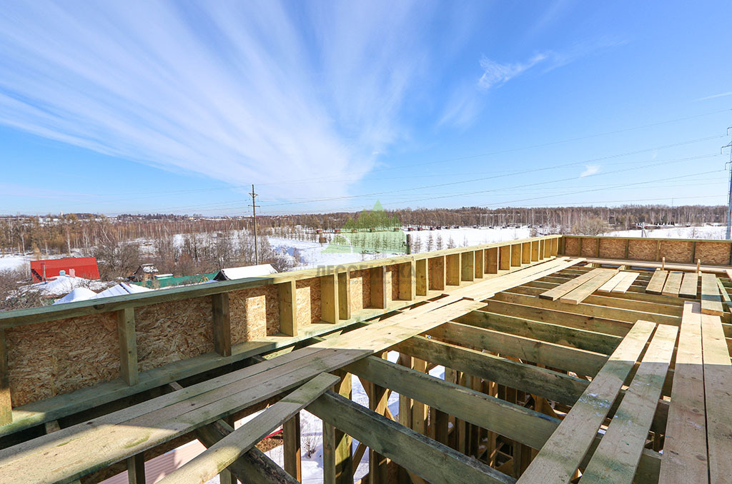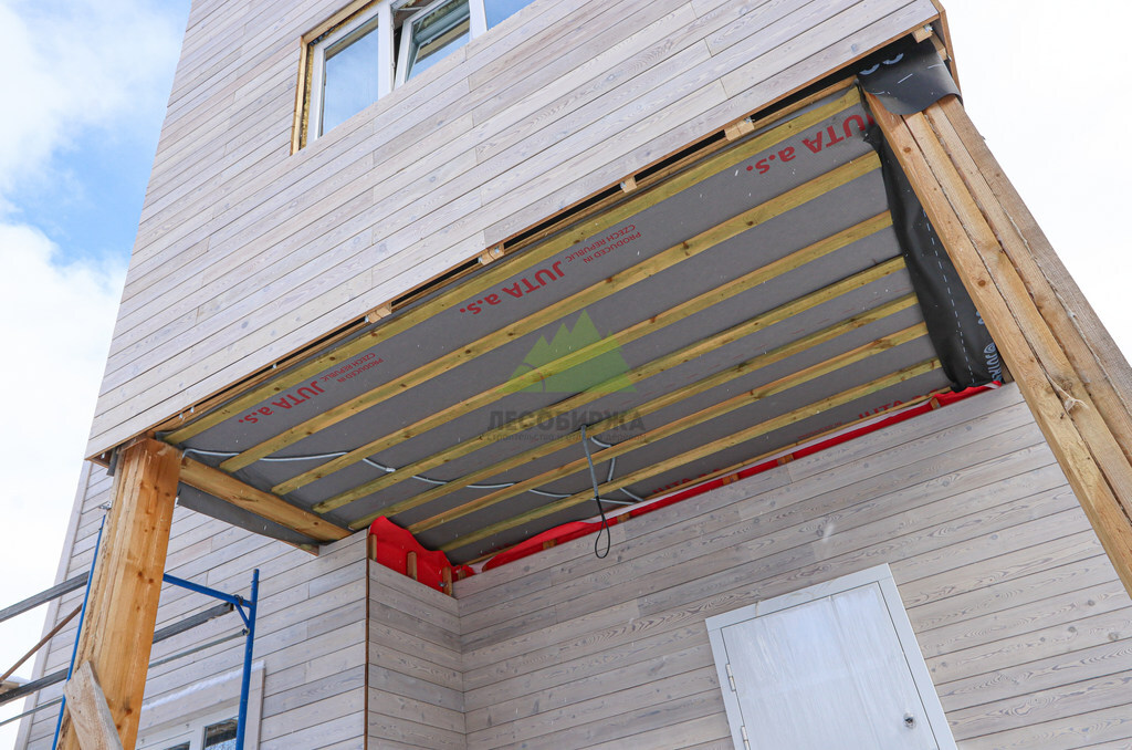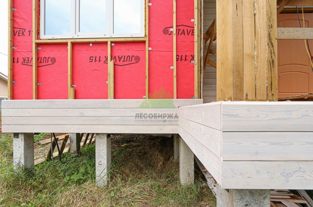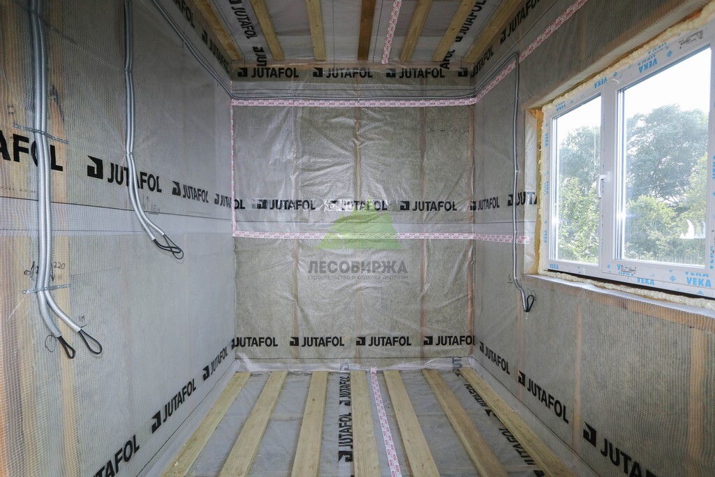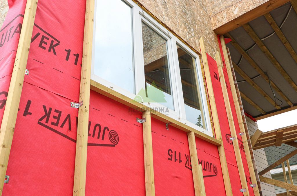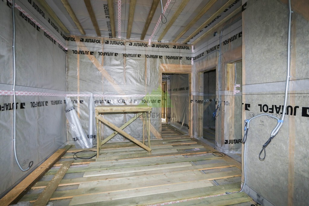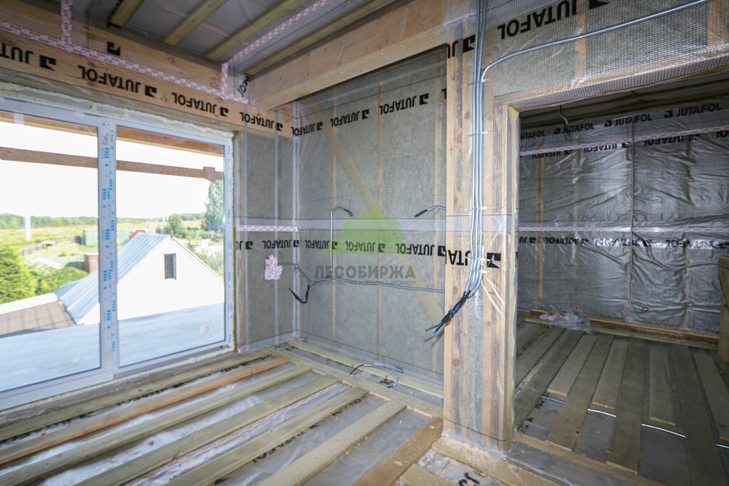 Над фундаментом было смонтировано цокольное перекрытие, в конструкции которого мы применили высокопрочные двутавровые балки размером 64 на 240 мм. Использование таких балок позволяет создавать жесткие и прочные перекрытия, способные выдерживать значительные нагрузки без прогибов, что критично для комфортной эксплуатации второго этажа и общего ощущения надежности дома. Следующим шагом стало возведение каркаса стен и межкомнатных перегородок. Для этого мы использовали отборную древесину камерной сушки, обеспечивающую минимальную усадку и стабильность всей конструкции. Внутреннее пространство стен и перегородок было заполнено высокоэффективной минеральной ватой Paroc Extra. Этот утеплитель не только обеспечивает превосходные теплоизоляционные свойства, снижая затраты на отопление, но также обладает отличными звукоизоляционными характеристиками, создавая тихую и спокойную атмосферу в доме. Paroc Extra является негорючим и экологически безопасным материалом, что подтверждает наше стремление к использованию только проверенных и качественных решений.