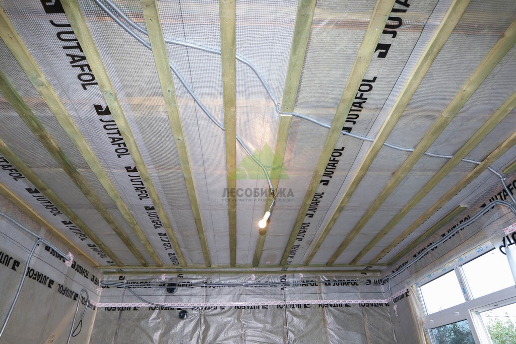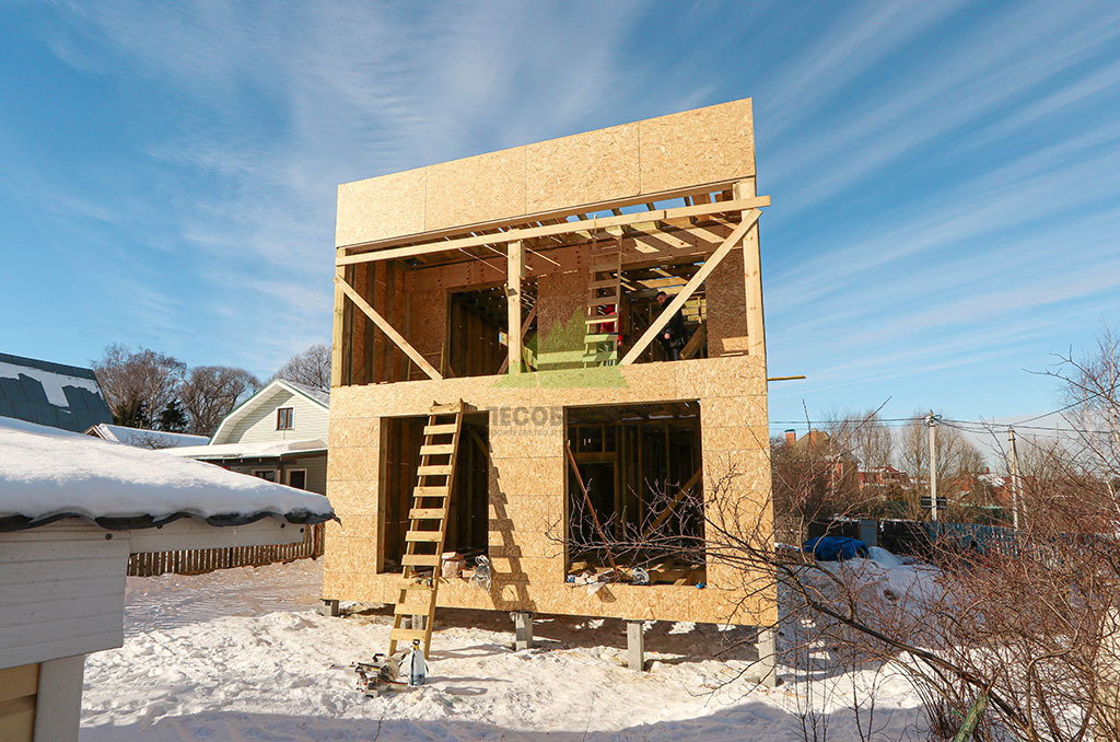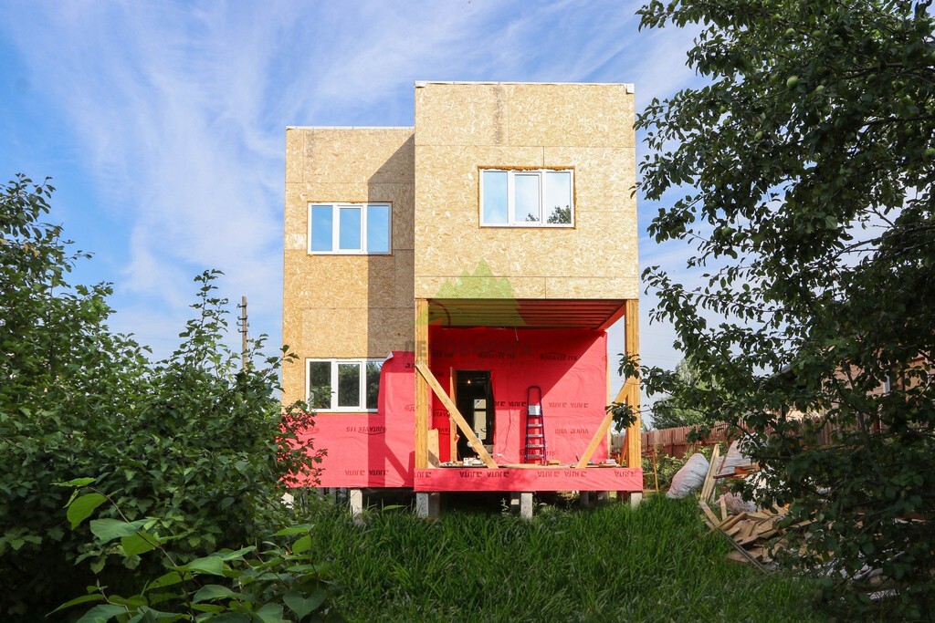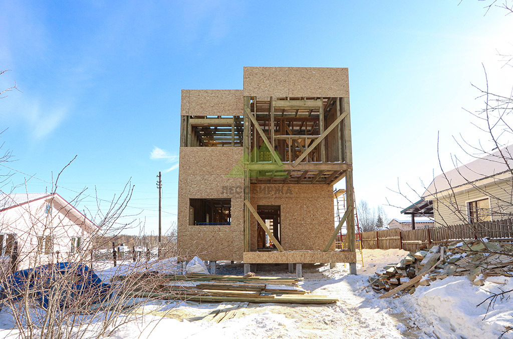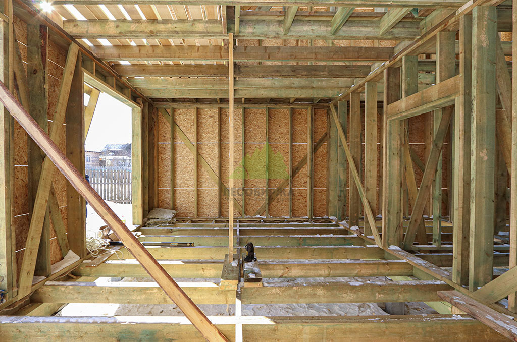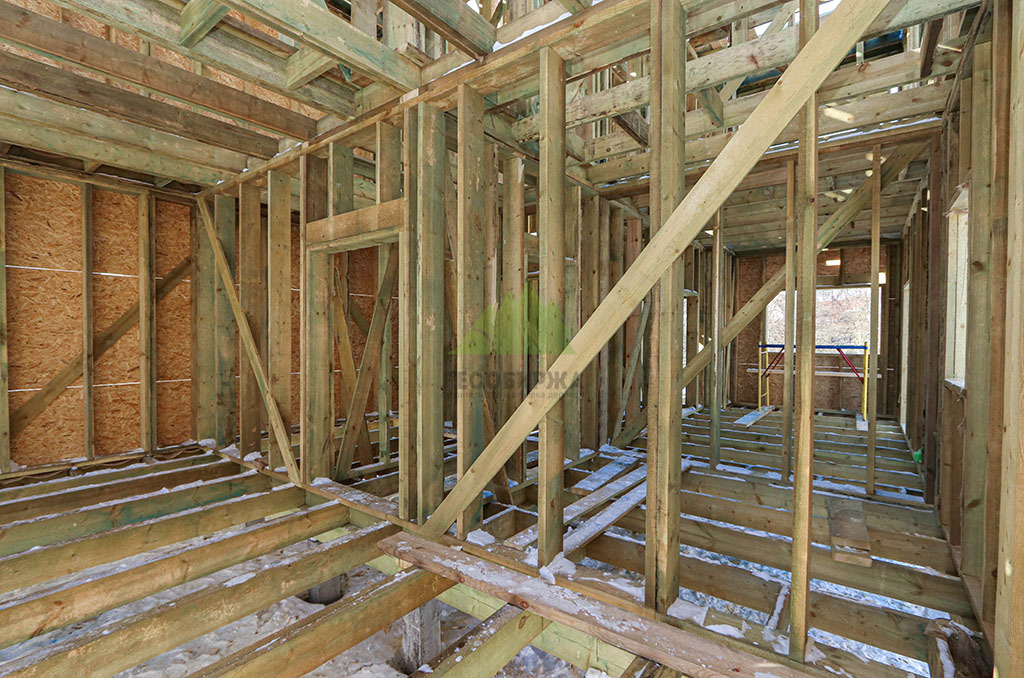 Над фундаментом было смонтировано цокольное перекрытие, в конструкции которого мы применили высокопрочные двутавровые балки размером 64 на 240 мм. Использование таких балок позволяет создавать жесткие и прочные перекрытия, способные выдерживать значительные нагрузки без прогибов, что критично для комфортной эксплуатации второго этажа и общего ощущения надежности дома. Следующим шагом стало возведение каркаса стен и межкомнатных перегородок. Для этого мы использовали отборную древесину камерной сушки, обеспечивающую минимальную усадку и стабильность всей конструкции. Внутреннее пространство стен и перегородок было заполнено высокоэффективной минеральной ватой Paroc Extra. Этот утеплитель не только обеспечивает превосходные теплоизоляционные свойства, снижая затраты на отопление, но также обладает отличными звукоизоляционными характеристиками, создавая тихую и спокойную атмосферу в доме. Paroc Extra является негорючим и экологически безопасным материалом, что подтверждает наше стремление к использованию только проверенных и качественных решений.