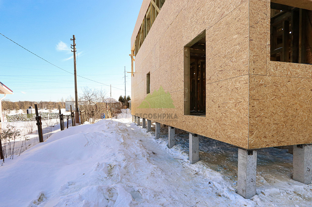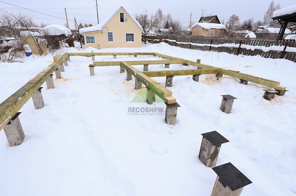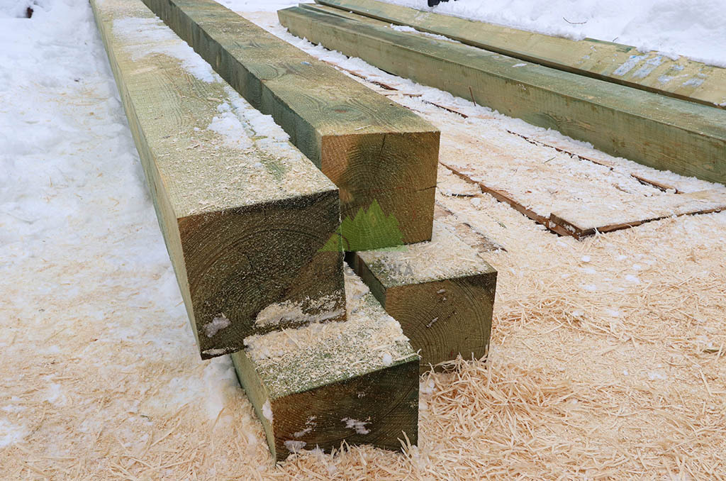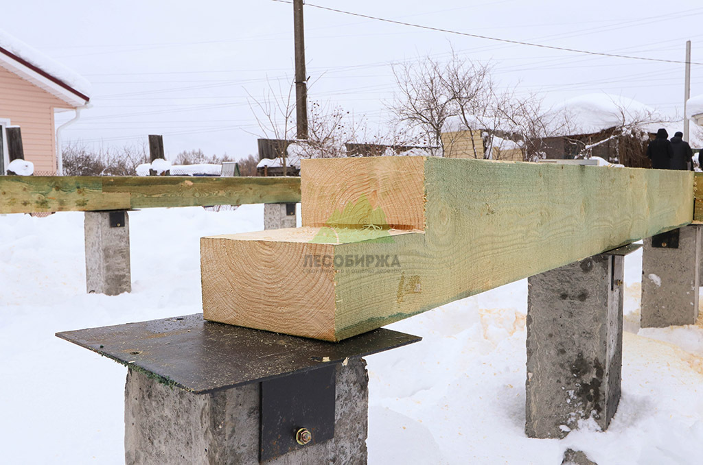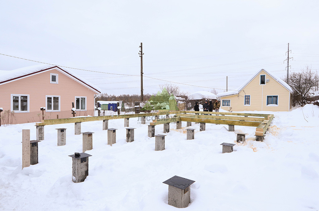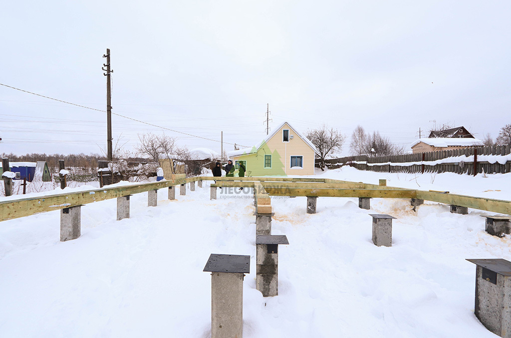 Первым и одним из самых ответственных этапов стало обустройство надежного фундамента. Учитывая особенности грунта и требования к долговечности конструкции, наши инженеры приняли решение использовать свайное поле с бетонными забивными сваями. Этот тип фундамента обеспечивает высокую несущую способность, устойчивость к пучению грунтов и длительный срок службы, что особенно актуально для условий Ленинградской области. После разметки участка и точной установки свай была выполнена обвязка ростверком из бруса естественной влажности сечением 200х200х6000 мм. Для обеспечения максимальной защиты от биопоражений, влаги и увеличения срока службы, каждый элемент ростверка был тщательно обработан специализированным антисептическим составом "Neomid 430 Eco". Эта процедура не только продлевает эксплуатационный период конструкции, но и гарантирует ее экологическую безопасность, что является важным аспектом для здорового микроклимата в доме.