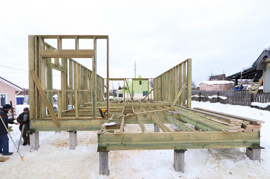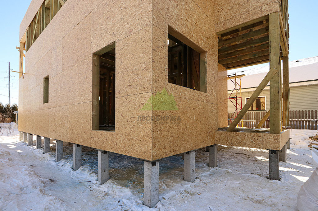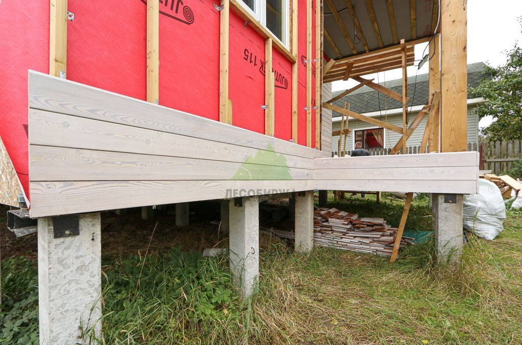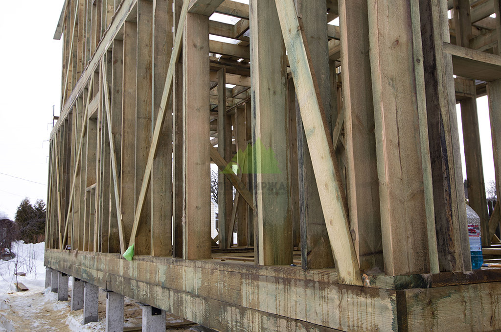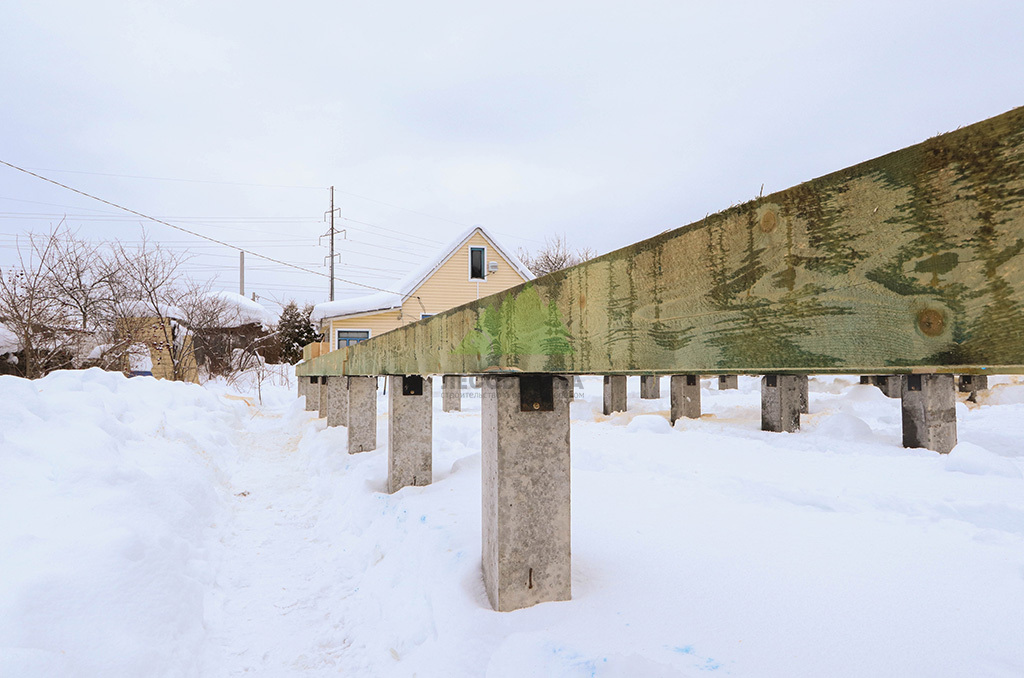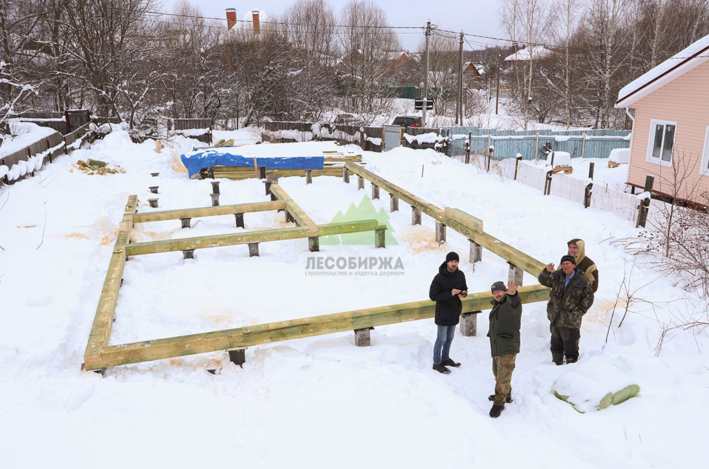 Первым и одним из самых ответственных этапов стало обустройство надежного фундамента. Учитывая особенности грунта и требования к долговечности конструкции, наши инженеры приняли решение использовать свайное поле с бетонными забивными сваями. Этот тип фундамента обеспечивает высокую несущую способность, устойчивость к пучению грунтов и длительный срок службы, что особенно актуально для условий Ленинградской области. После разметки участка и точной установки свай была выполнена обвязка ростверком из бруса естественной влажности сечением 200х200х6000 мм. Для обеспечения максимальной защиты от биопоражений, влаги и увеличения срока службы, каждый элемент ростверка был тщательно обработан специализированным антисептическим составом "Neomid 430 Eco". Эта процедура не только продлевает эксплуатационный период конструкции, но и гарантирует ее экологическую безопасность, что является важным аспектом для здорового микроклимата в доме.
