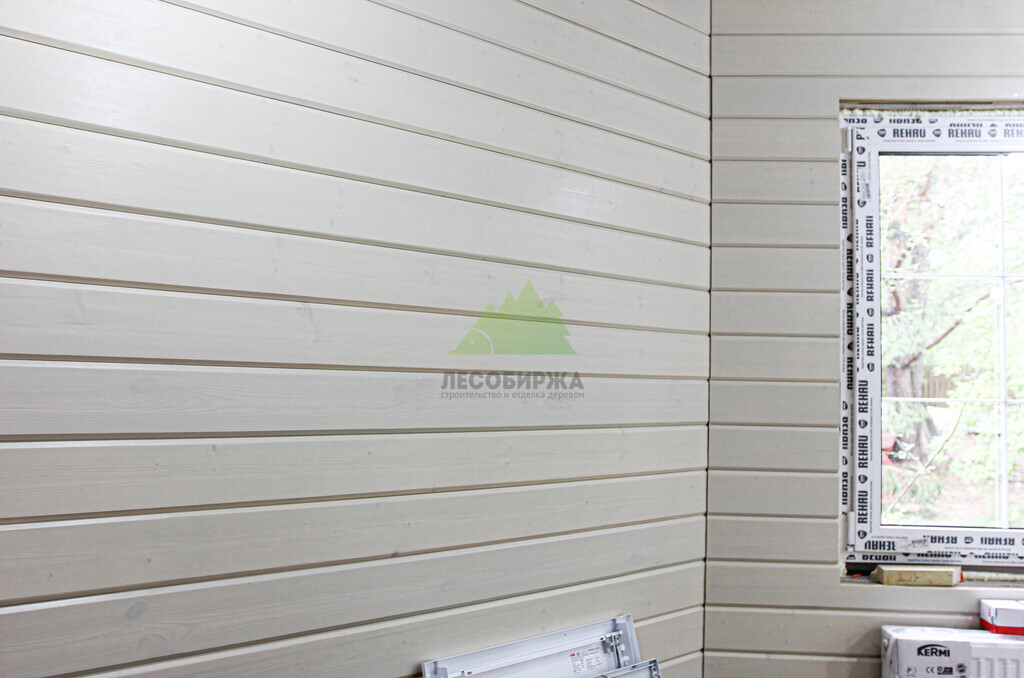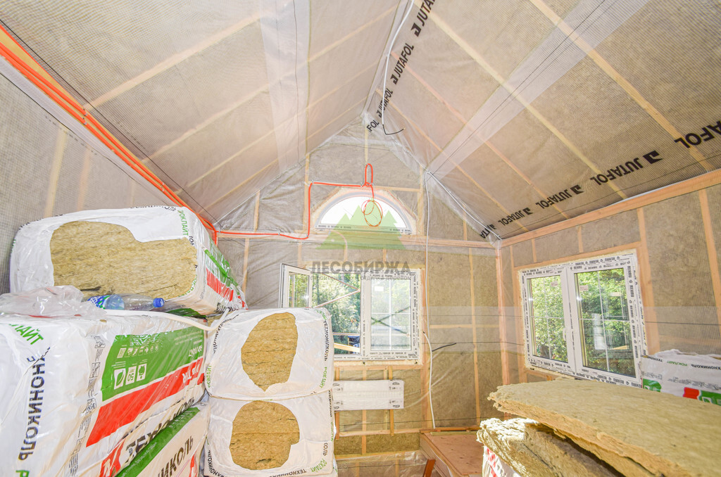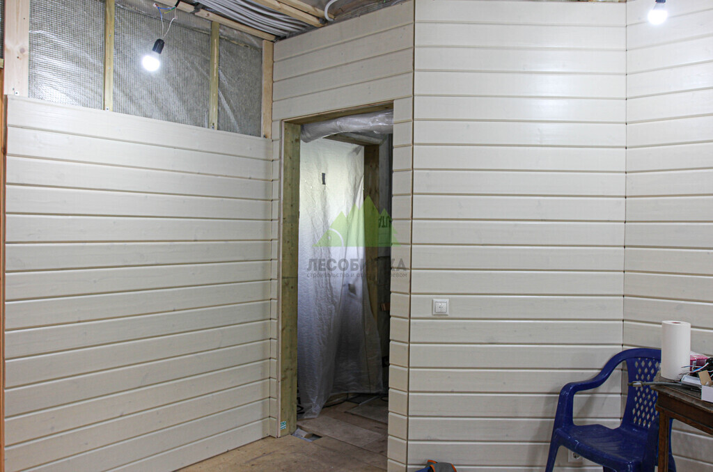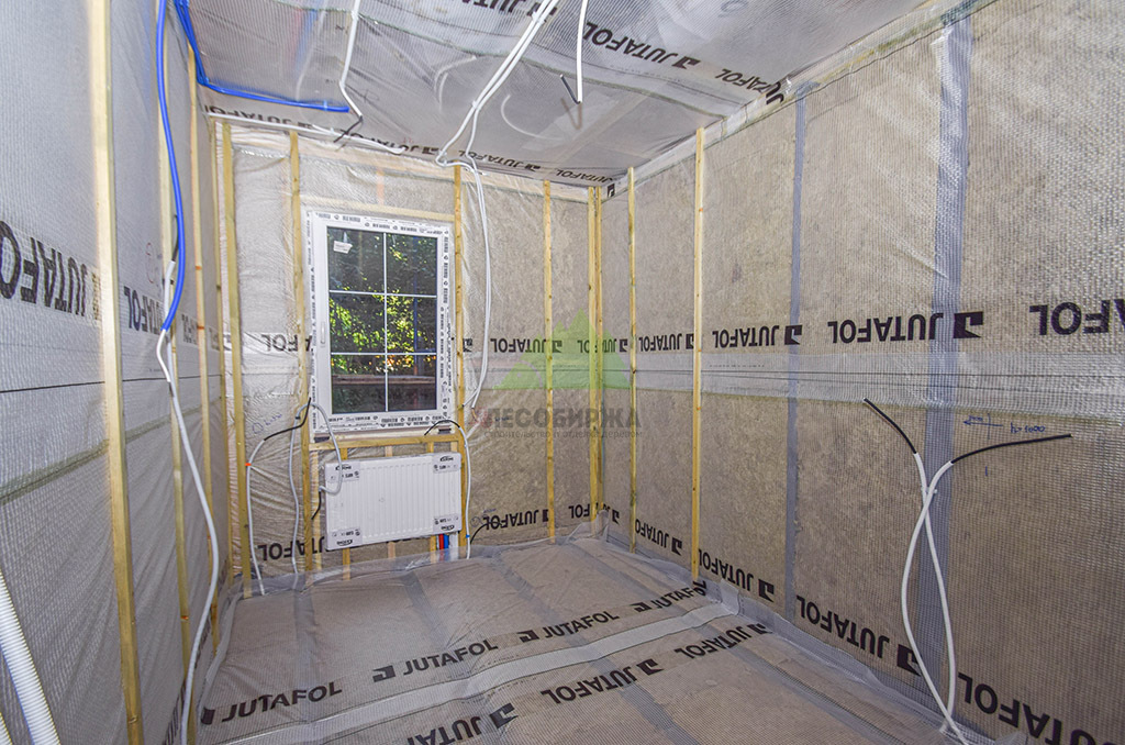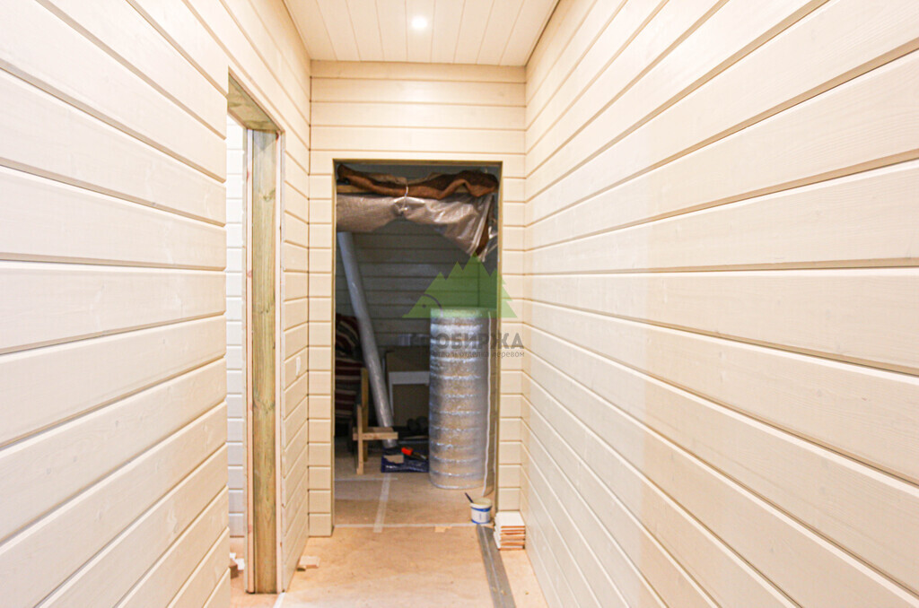 Внутренние работы в каркасном доме благодаря Лесобирже-Спб прошли максимально эффективно. Гладкие и ровные поверхности стен, пола и потолка, полученные при качественной сборке каркаса, позволили существенно сократить время и затраты на отделку. Электропроводка, водопровод и канализация были проложены скрытым способом внутри стен, что не только эстетично, но и безопасно. Мы выполнили полный комплекс работ по разводке всех инженерных систем, включая монтаж сантехники и отопительных приборов. По желанию клиента, стены внутри были обшиты экологичной имитацией бруса, создавая неповторимую атмосферу загородного дома. Потолки были выполнены из сухой строганной доски, а полы – из прочной и красивой массивной доски. Финишная отделка полов и потолков выполнена защитными лакокрасочными материалами.