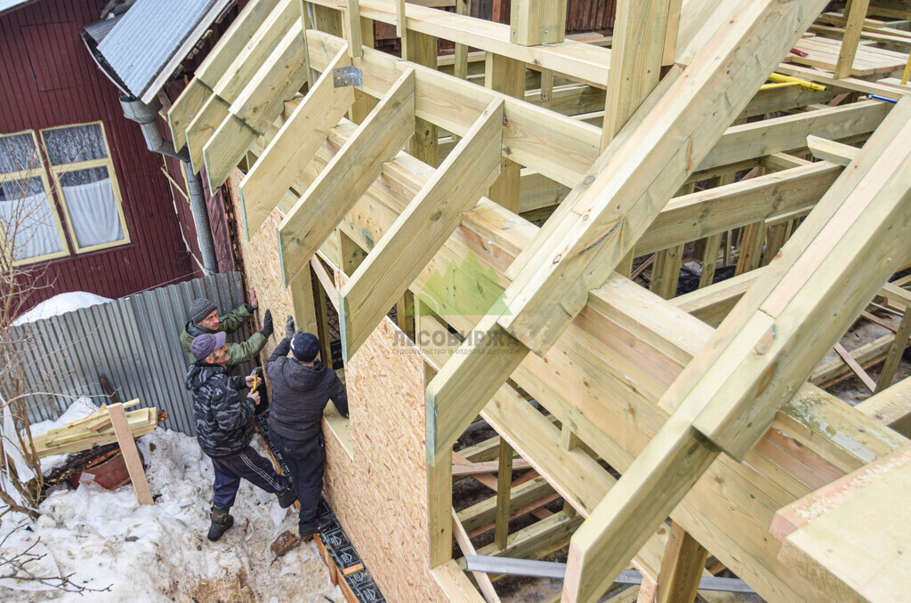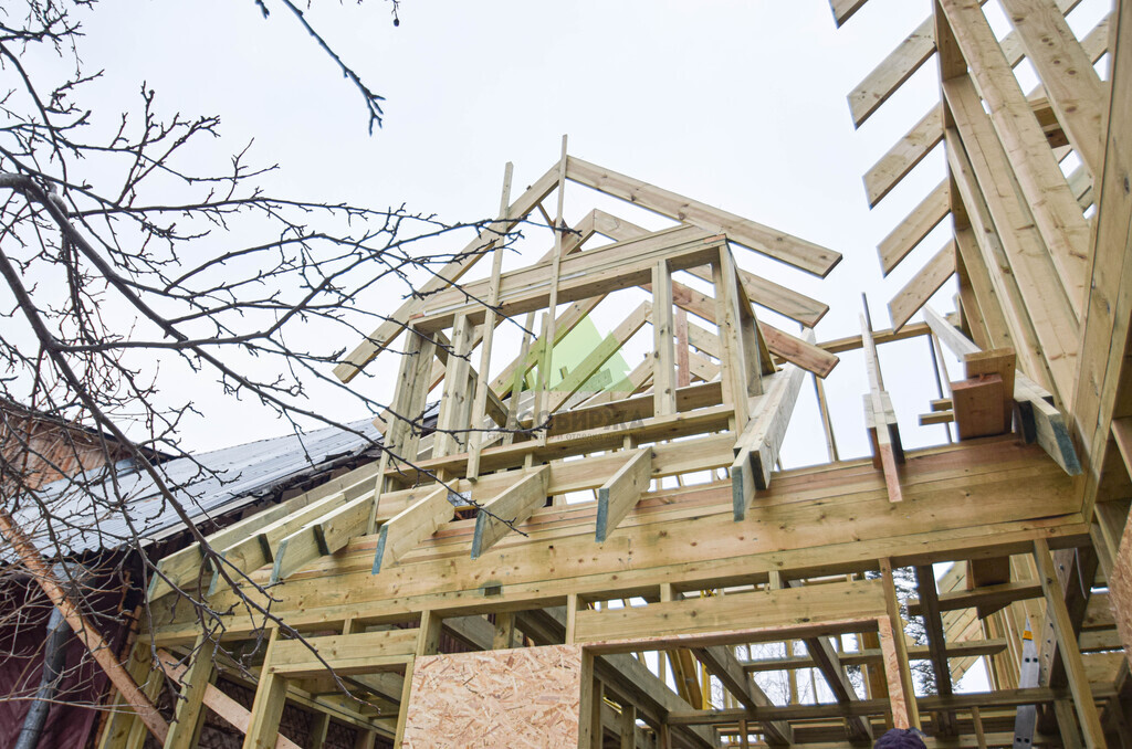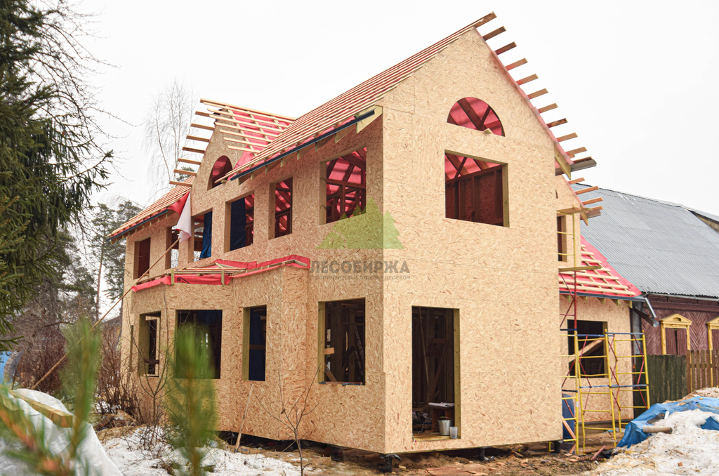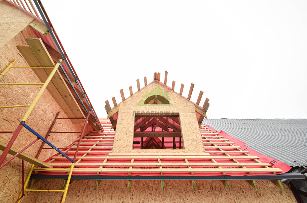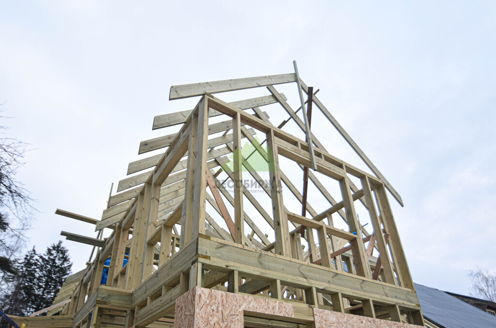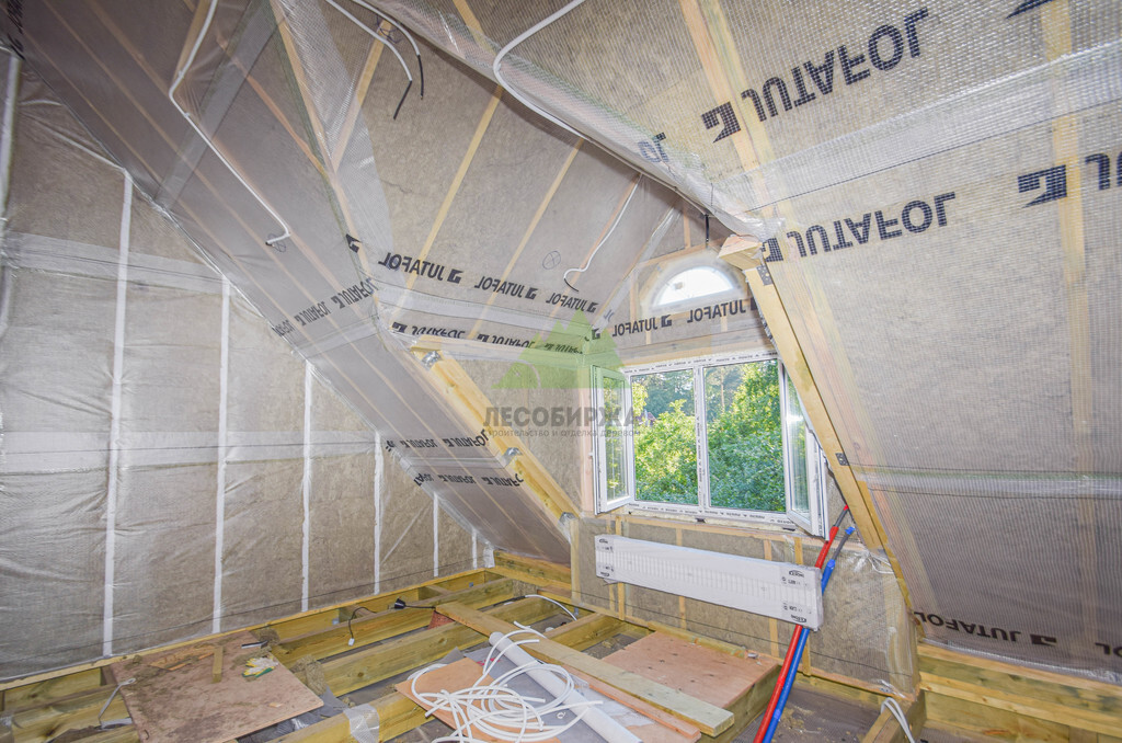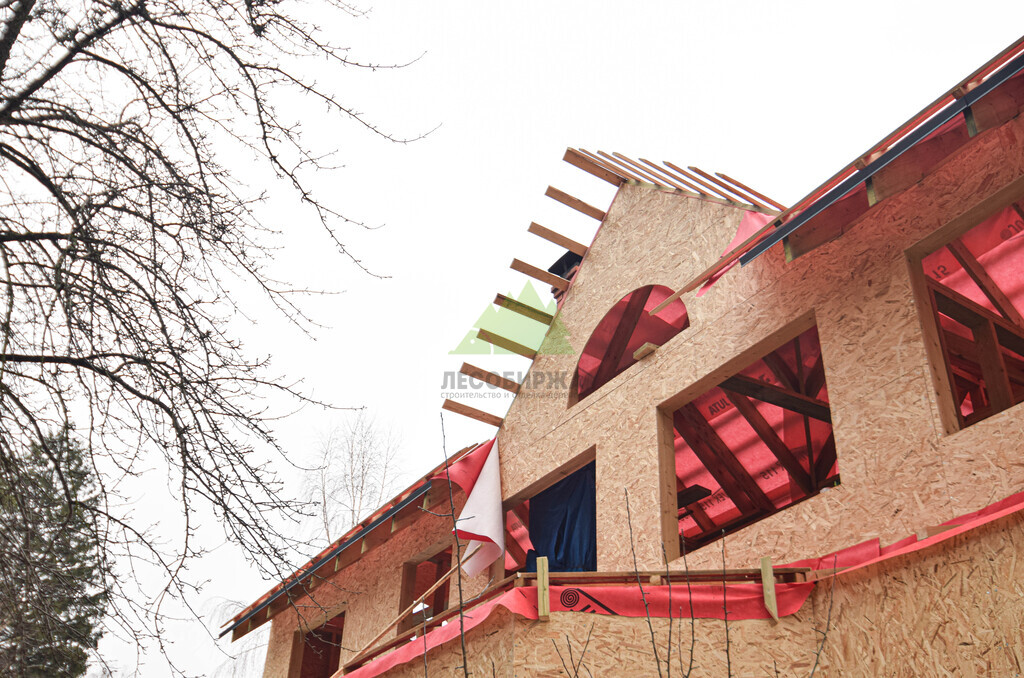 Кровельная система была спроектирована и смонтирована с учетом сурового климата Ленинградской области. Была выбрана многослойная конструкция с применением высококачественной гидроизоляции, пароизоляции и эффективного утеплителя толщиной 250 мм. В качестве финишного покрытия клиент выбрал металлочерепицу, отличающуюся долговечностью, эстетичным видом и отличными эксплуатационными характеристиками. Все кровельные работы Лесобиржа-Спб выполняет с соблюдением герметичности и вентиляционных зазоров, предотвращая образование конденсата и продлевая срок службы всей конструкции.