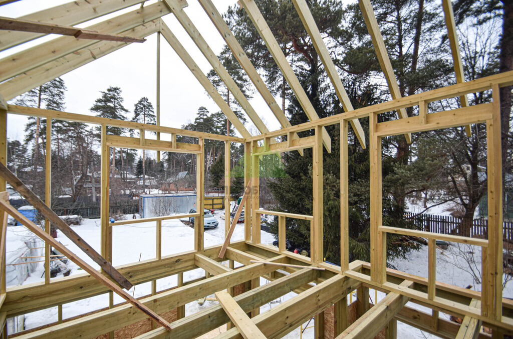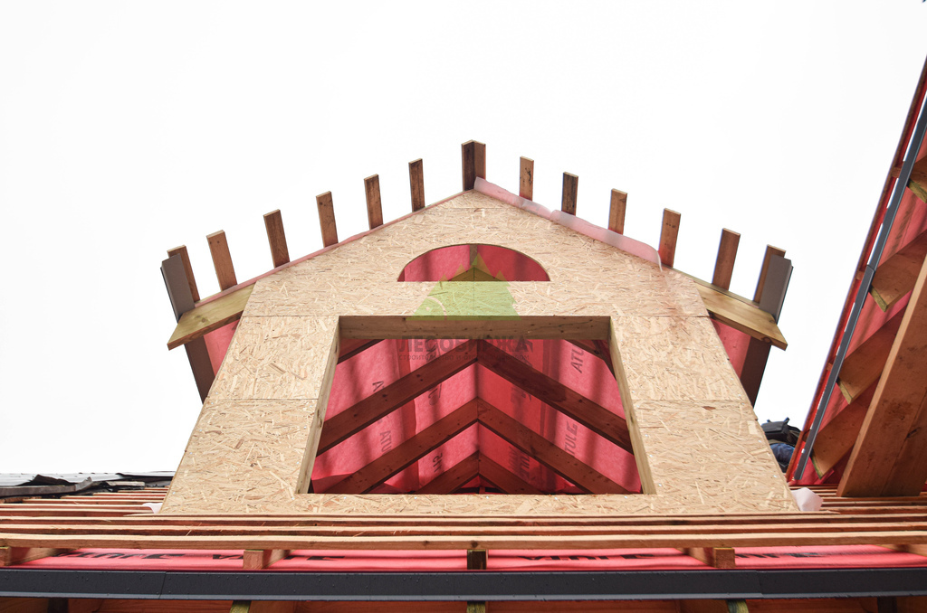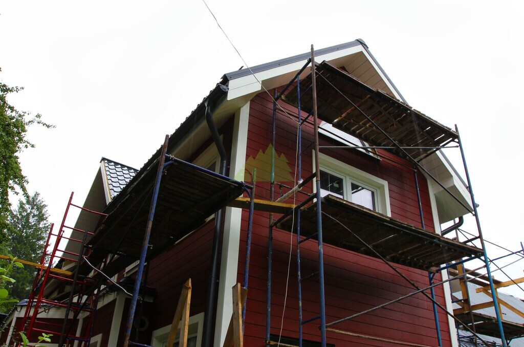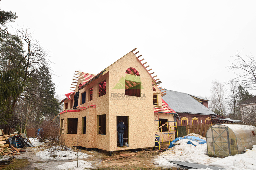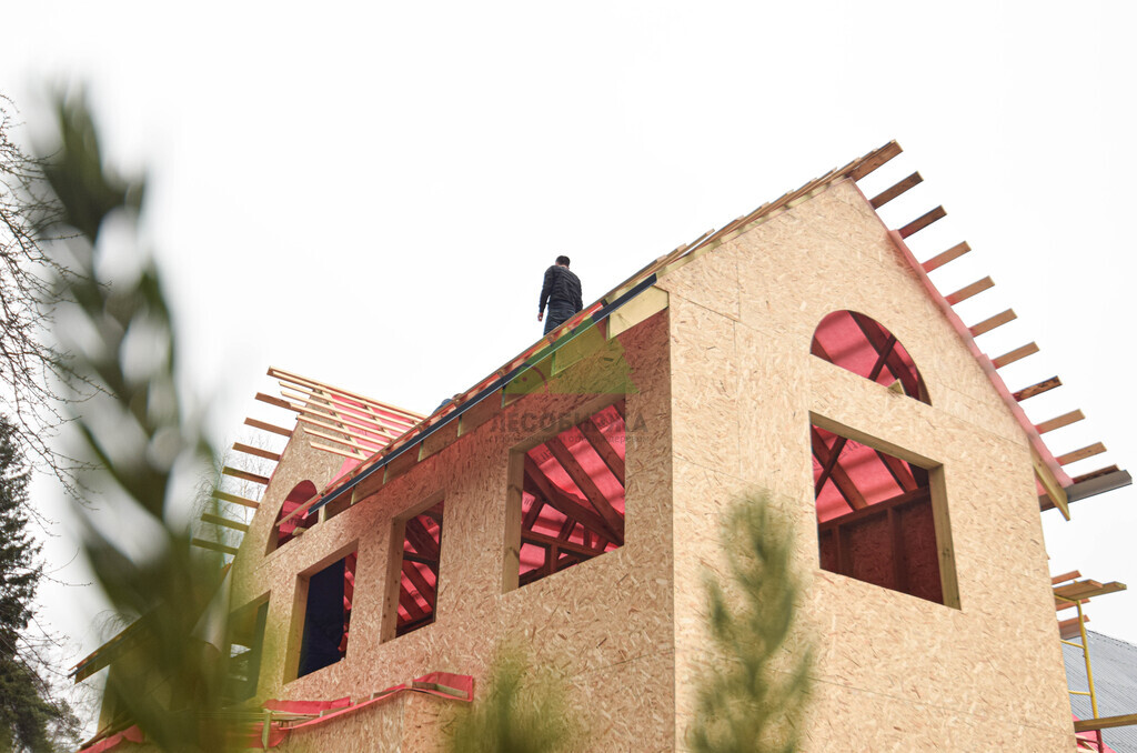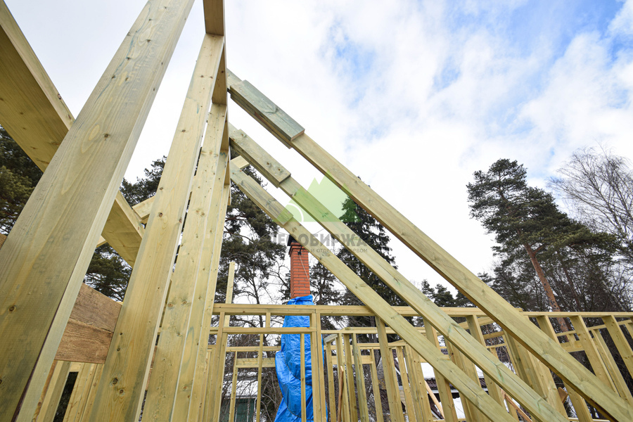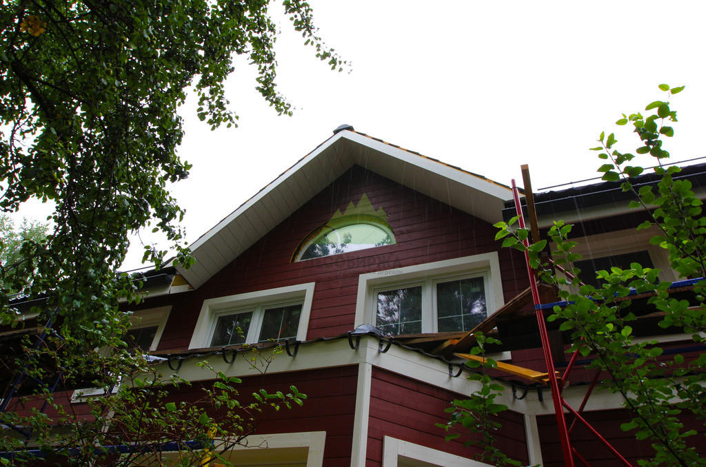 Кровельная система была спроектирована и смонтирована с учетом сурового климата Ленинградской области. Была выбрана многослойная конструкция с применением высококачественной гидроизоляции, пароизоляции и эффективного утеплителя толщиной 250 мм. В качестве финишного покрытия клиент выбрал металлочерепицу, отличающуюся долговечностью, эстетичным видом и отличными эксплуатационными характеристиками. Все кровельные работы Лесобиржа-Спб выполняет с соблюдением герметичности и вентиляционных зазоров, предотвращая образование конденсата и продлевая срок службы всей конструкции.