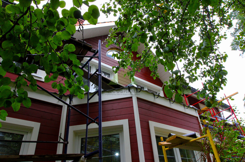 Особое внимание мы уделили утеплению стен и перекрытий. Использовалась комплексная система теплоизоляции с применением минеральной ваты высокой плотности, уложенной в несколько слоев с перекрестным утеплением, что исключает "мостики холода". Общая толщина утепления стен составила 200 мм, пола – 250 мм, потолка – 250 мм. Это обеспечивает не только высокий уровень энергосбережения, но и отличную звукоизоляцию, создавая в доме атмосферу уюта и тишины. С внешней стороны дом был обшит ветрозащитной мембраной и отделан имитацией бруса, придающей ему классический и благородный вид. Финишная покраска фасада была выполнена высококачественными красками с учетом климатических особенностей региона.