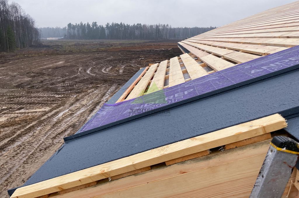 Для настила террасы мы применили доску из древесно-полимерного композита (ДПК). Этот инновационный материал объединяет в себе лучшие качества древесины и полимеров. Он не подвержен гниению, поражению насекомыми, не требует ежегодной покраски и пропитки, обладает высокой износостойкостью и стабильностью цвета. Доска ДПК приятна на ощупь, не скользит даже во влажном состоянии и прекрасно выдерживает суровые погодные условия нашего региона. При условии грамотного ухода, такая терраса прослужит не менее 15-20 лет, сохраняя свой эстетичный вид и функциональность. Двускатная крыша дома была выполнена из фальца – это не только строгое соответствие скандинавскому стилю, но и выбор в пользу максимальной надежности и герметичности. Фальцевая кровля отличается высокой прочностью, долговечностью, малым весом и отличной стойкостью к осадкам, обеспечивая идеальную защиту для всего строения.