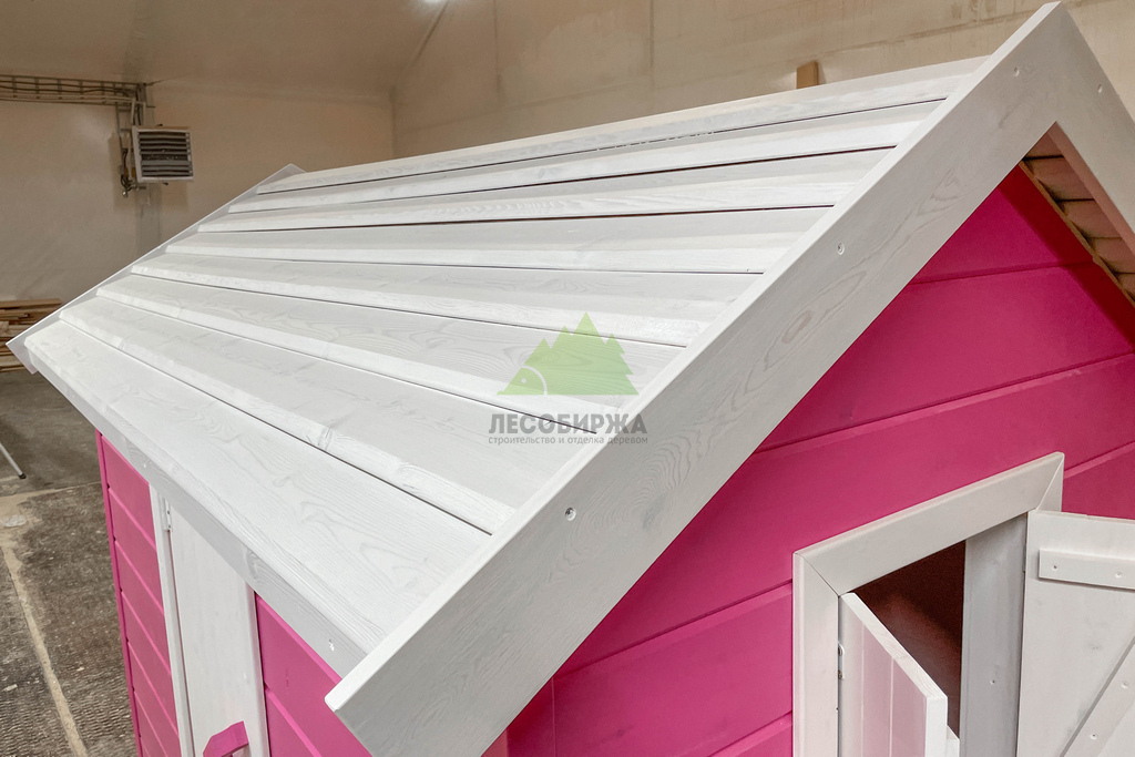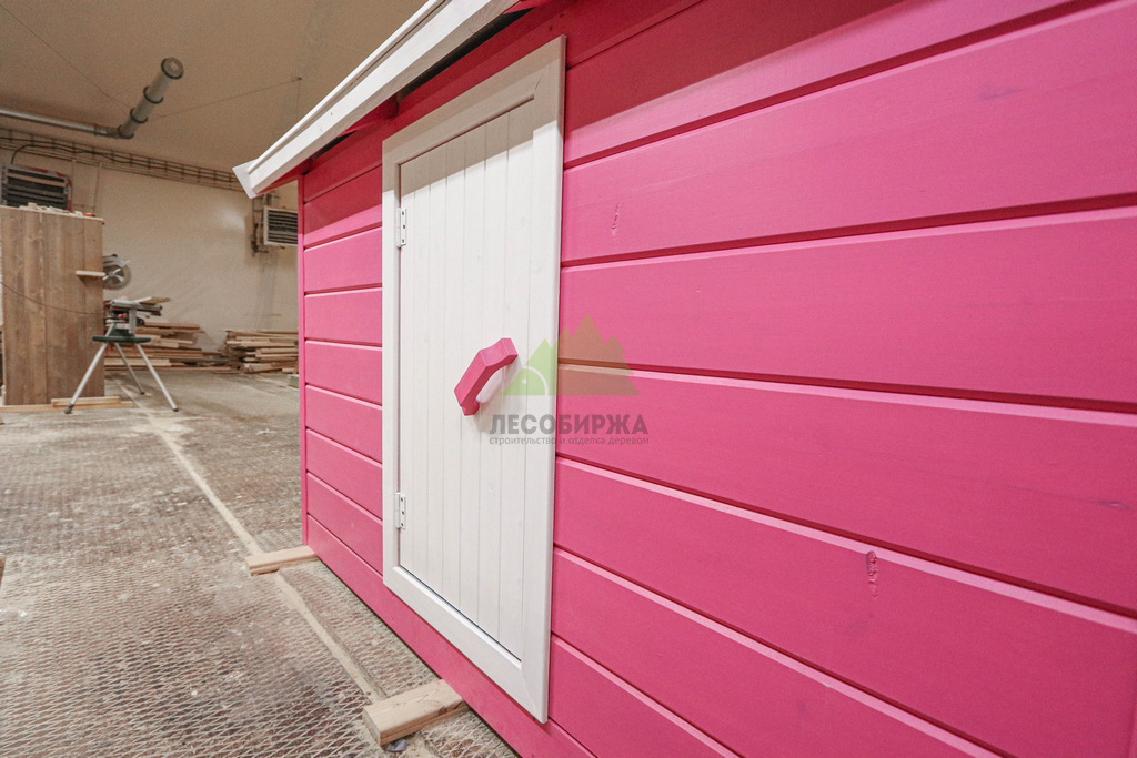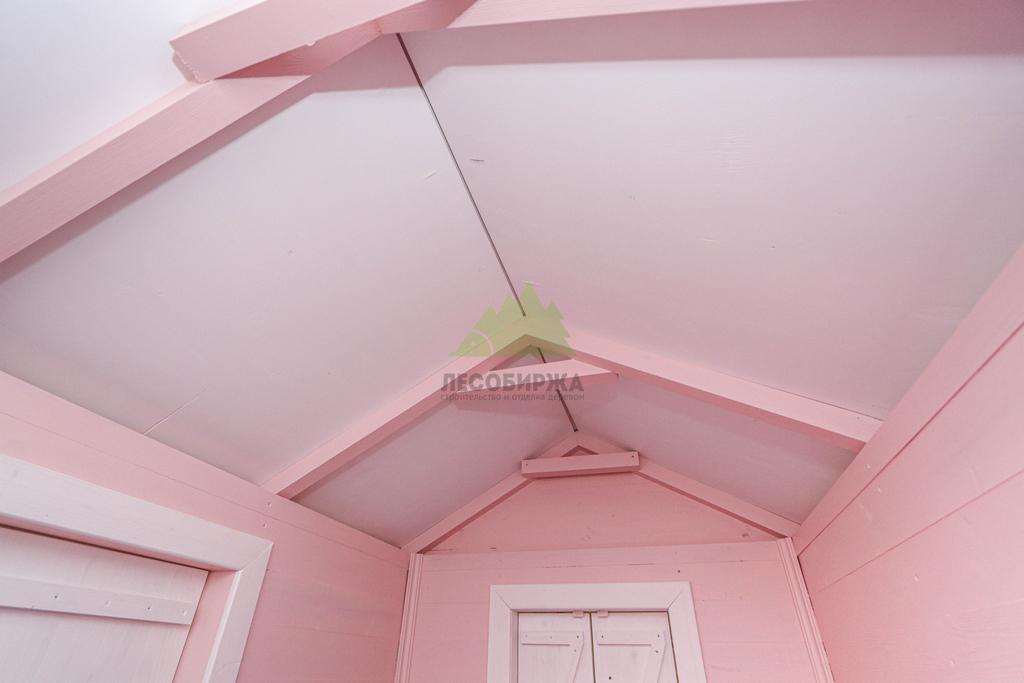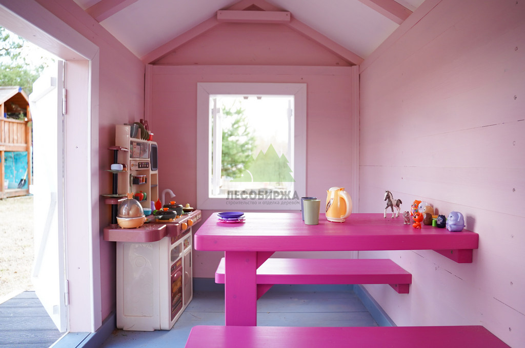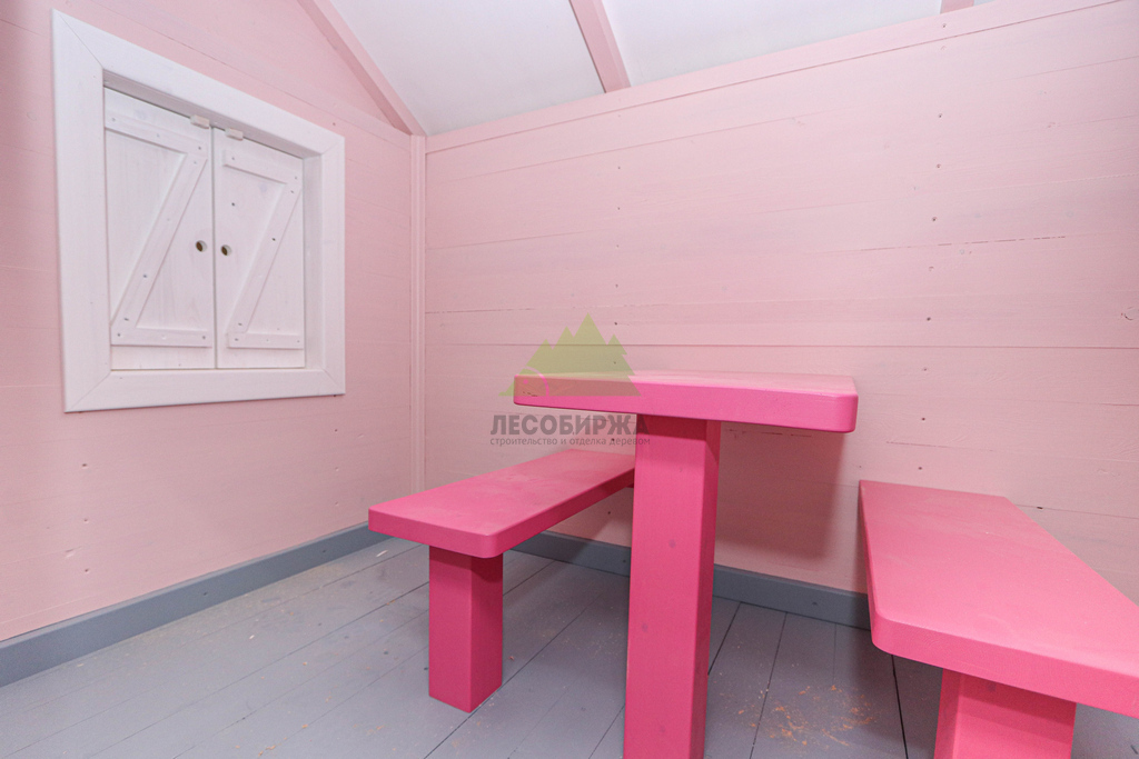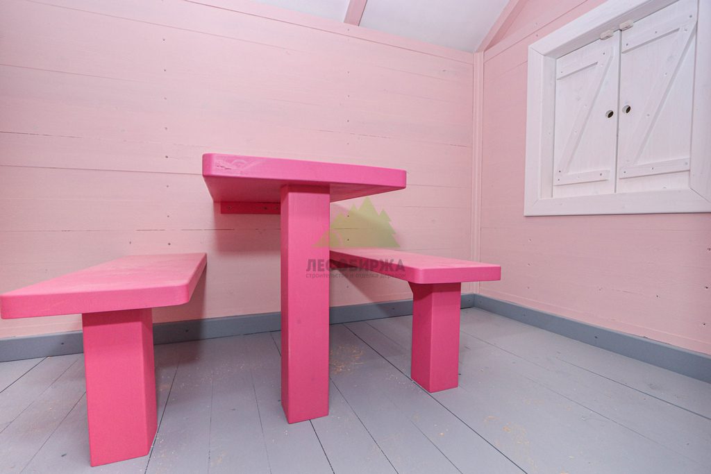 Внутреннее пространство домика также выполнено с особым вниманием к деталям и безопасности. Для внутренней отделки использовалась натуральная деревянная вагонка – экологически чистый материал, создающий здоровый микроклимат и приятный аромат древесины. Стены внутри домика окрашены в нежный светло-розовый оттенок, который гармонично дополняет общую концепцию и создает атмосферу уюта. Одним из центральных элементов интерьера стала специально организованная зона для приема гостей: миниатюрный столик и две скамейки, выполненные и окрашенные в той же яркой стилистике "Barbie". Эта зона идеально подходит для детских чаепитий, игр и творчества.