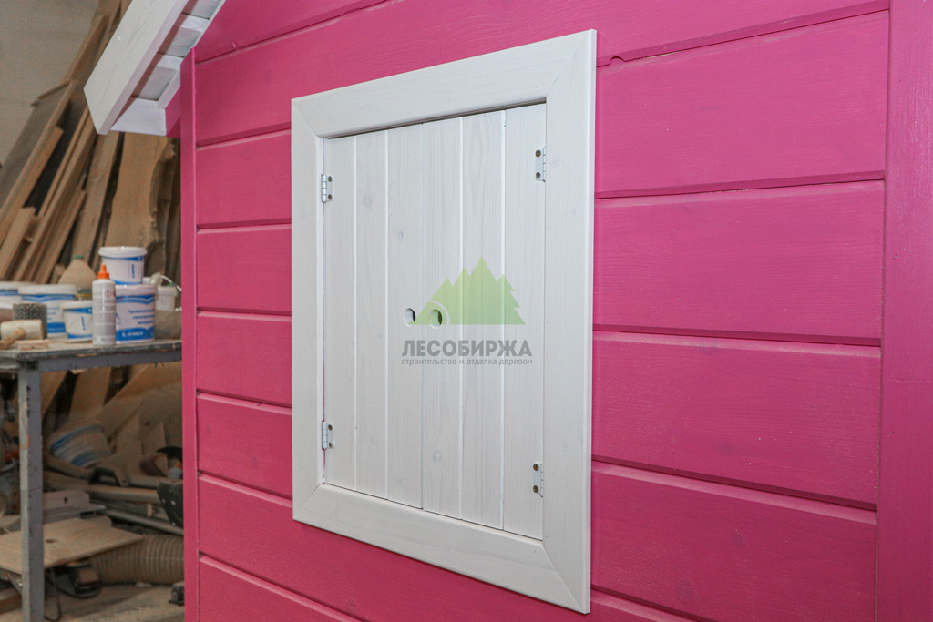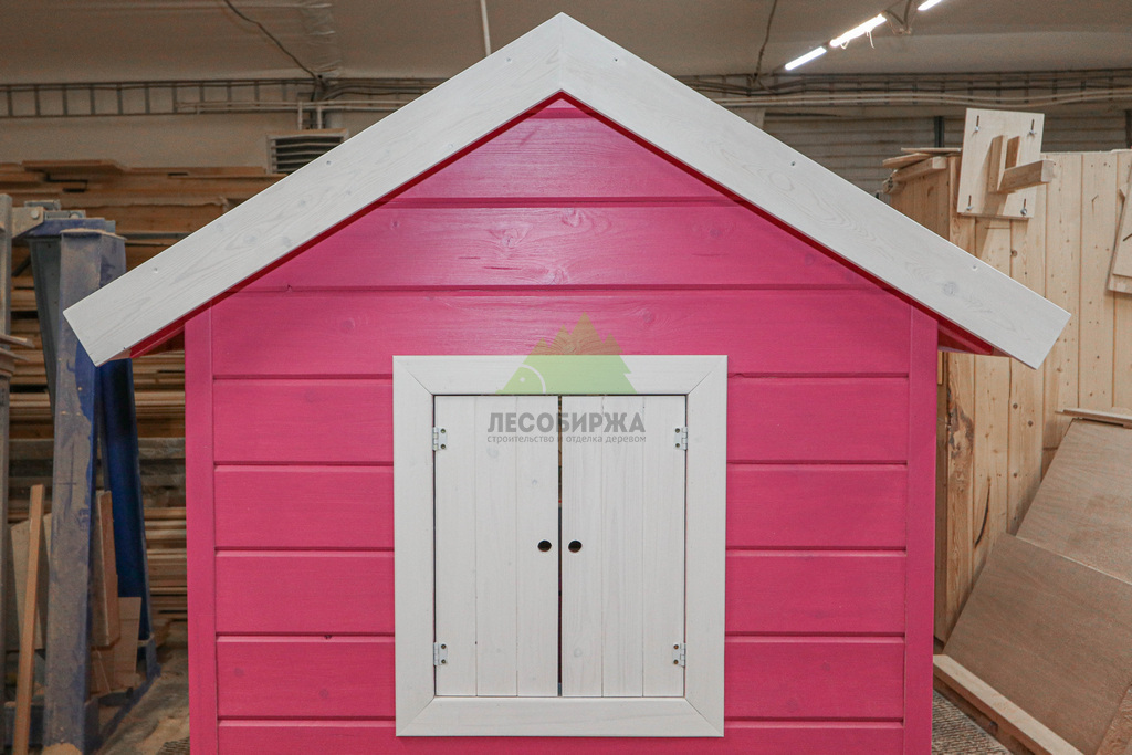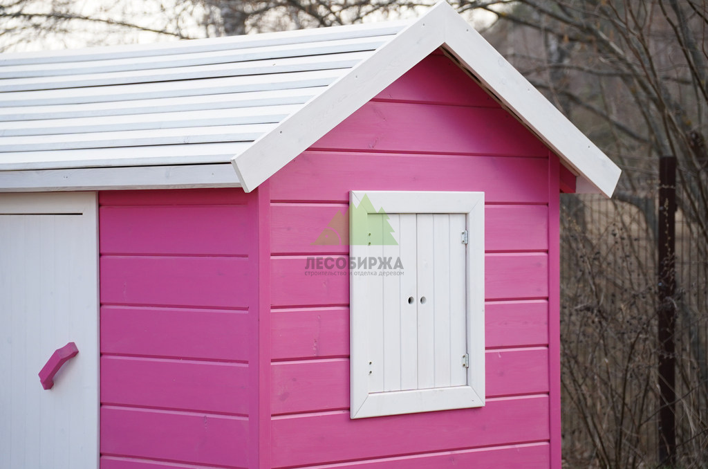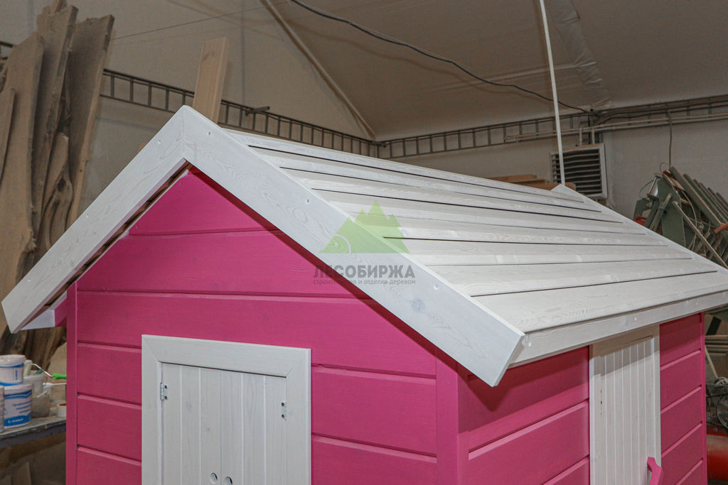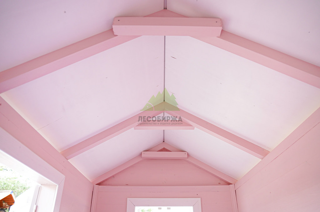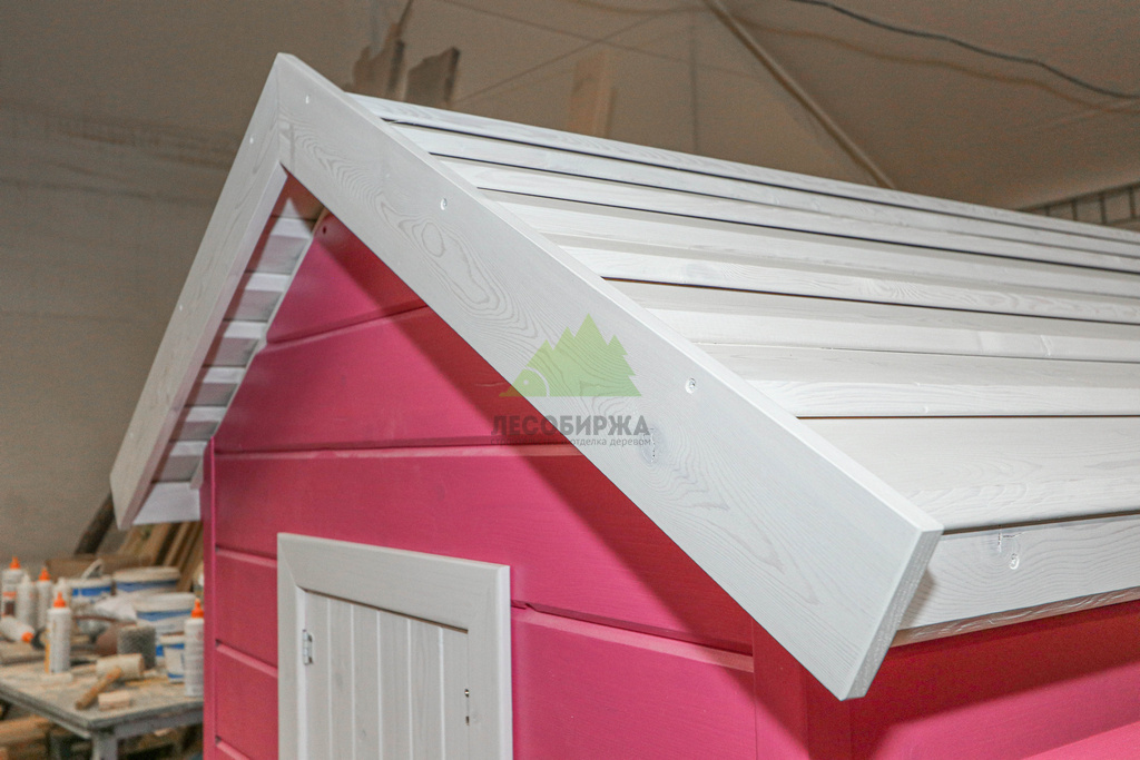 Внутреннее пространство домика также выполнено с особым вниманием к деталям и безопасности. Для внутренней отделки использовалась натуральная деревянная вагонка – экологически чистый материал, создающий здоровый микроклимат и приятный аромат древесины. Стены внутри домика окрашены в нежный светло-розовый оттенок, который гармонично дополняет общую концепцию и создает атмосферу уюта. Одним из центральных элементов интерьера стала специально организованная зона для приема гостей: миниатюрный столик и две скамейки, выполненные и окрашенные в той же яркой стилистике "Barbie". Эта зона идеально подходит для детских чаепитий, игр и творчества.