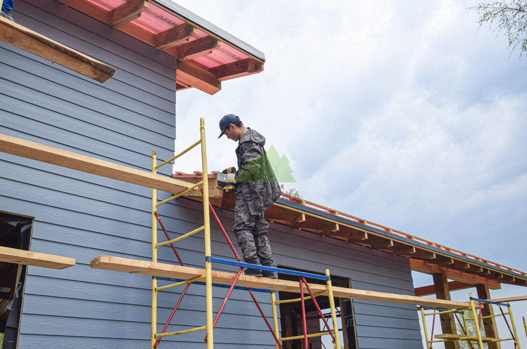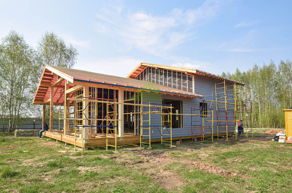 Внешняя отделка дома была призвана не только защитить конструкции от воздействия окружающей среды, но и придать зданию завершенный, эстетичный вид, гармонирующий с архитектурой Резиденции Солнечное. После монтажа гидро-ветрозащитной мембраны и создания вентилируемого зазора, был установлен фасад из имитации бруса, окрашенный в выбранные заказчиком оттенки. Этот материал идеально подходит для деревянных домов, подчеркивая их природную красоту и обеспечивая дополнительную защиту. Наши маляры использовали высококачественные фасадные краски, устойчивые к выцветанию и атмосферным воздействиям, что гарантирует сохранение первоначального вида дома на долгие годы. Отдельное внимание уделили подшивке свесов кровли и оформлению углов, что придало дому аккуратный и законченный вид.