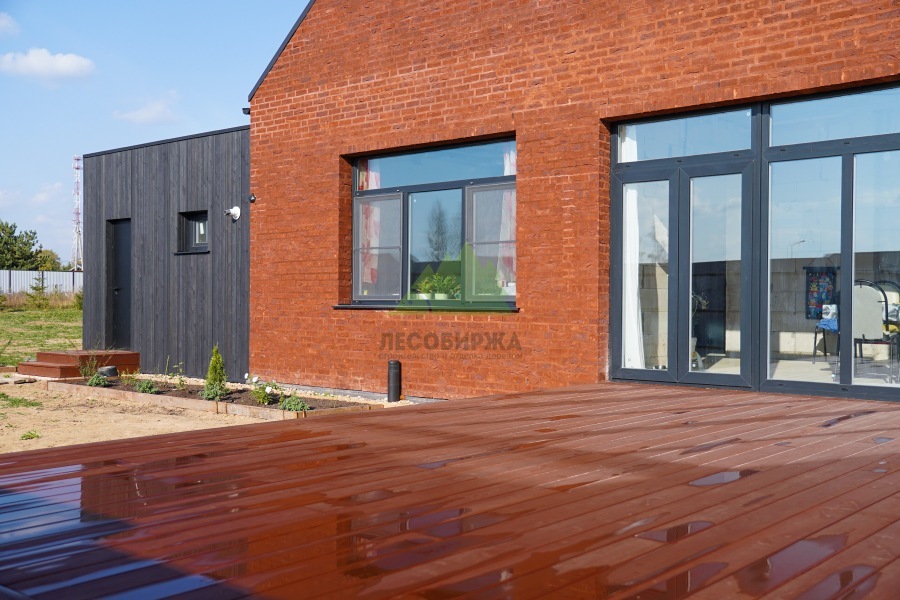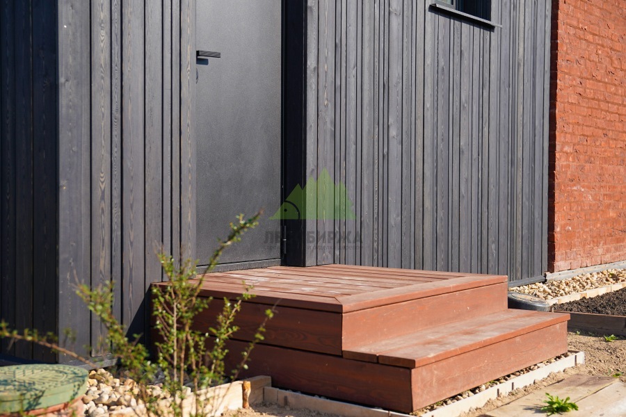 При постройке придомовой террасы мы использовали тот же проверенный материал – лиственничный прямой планкен сорта АВ размером 145х20х3000 мм. Толщина в 20 мм оптимально подходит не только для облицовки, но и для устройства напольных покрытий, обеспечивая необходимую прочность и стабильность. Длина досок в 3000 мм позволила минимизировать количество стыков на конструкции, что создает более монолитный и аккуратный вид. Для монтажа террасы, как и для гаража, был успешно применен наш надежный крепеж "LesFix" со стопором, гарантируя исключительную долговечность и устойчивость к нагрузкам.