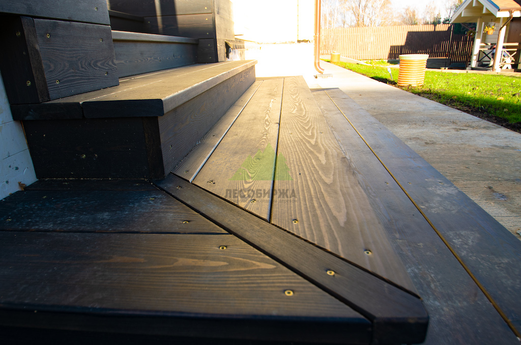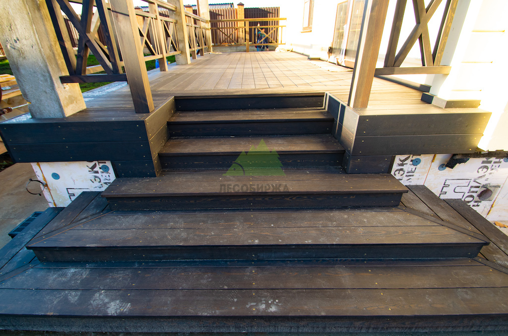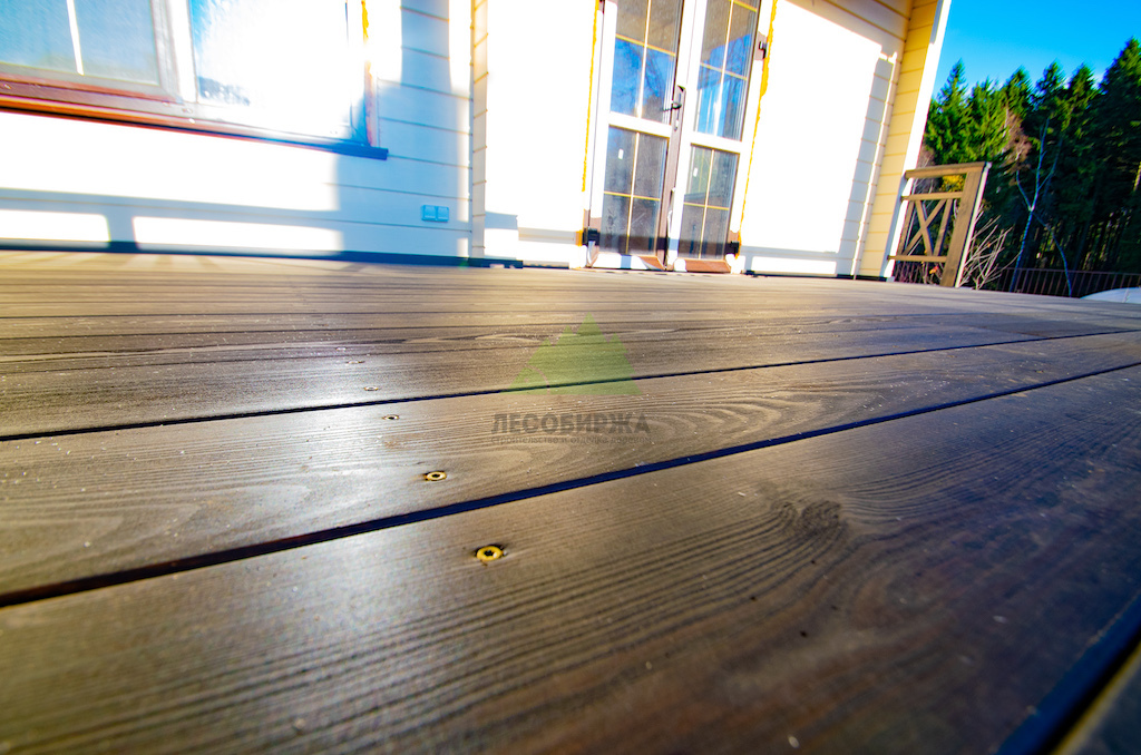 Для данного проекта клиент выбрал гладкую террасную доску сорта АВ, которая сочетает в себе превосходное качество поверхности с минимальными природными дефектами, характерными для натурального дерева. Мы в Лесобирже-Спб гарантируем высочайшее качество пиломатериалов вне зависимости от сорта, а сортность лишь определяет внешние характеристики, даруя каждому изделию уникальный рисунок и текстуру. Террасная доска сорта АВ позволила создать ровное, приятное на ощупь покрытие, идеально подходящее для босых ног.