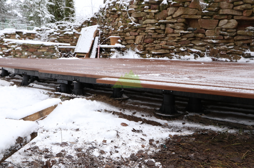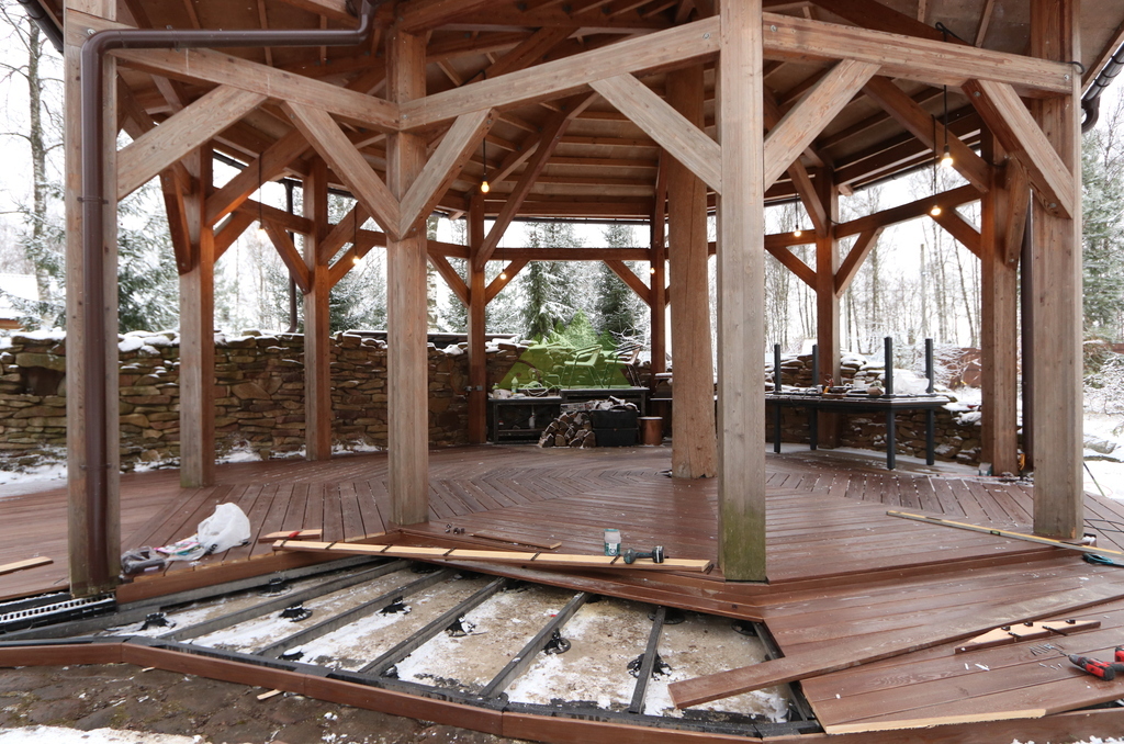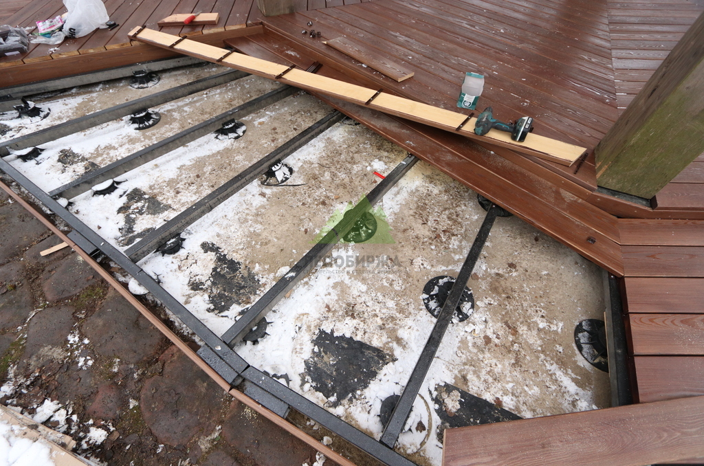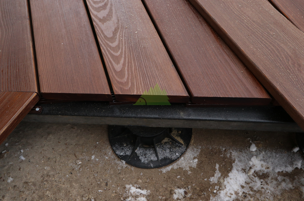 После демонтажа приступили к устройству нового основания. Были выполнены разметка, выставление уровней и подготовка опор с учётом проектной высоты террасы и необходимых уклонов для отвода воды. Основание собиралось с запасом по жёсткости, чтобы терраса не «играла» под нагрузкой и спокойно переносила сезонные перепады температуры и влажности.