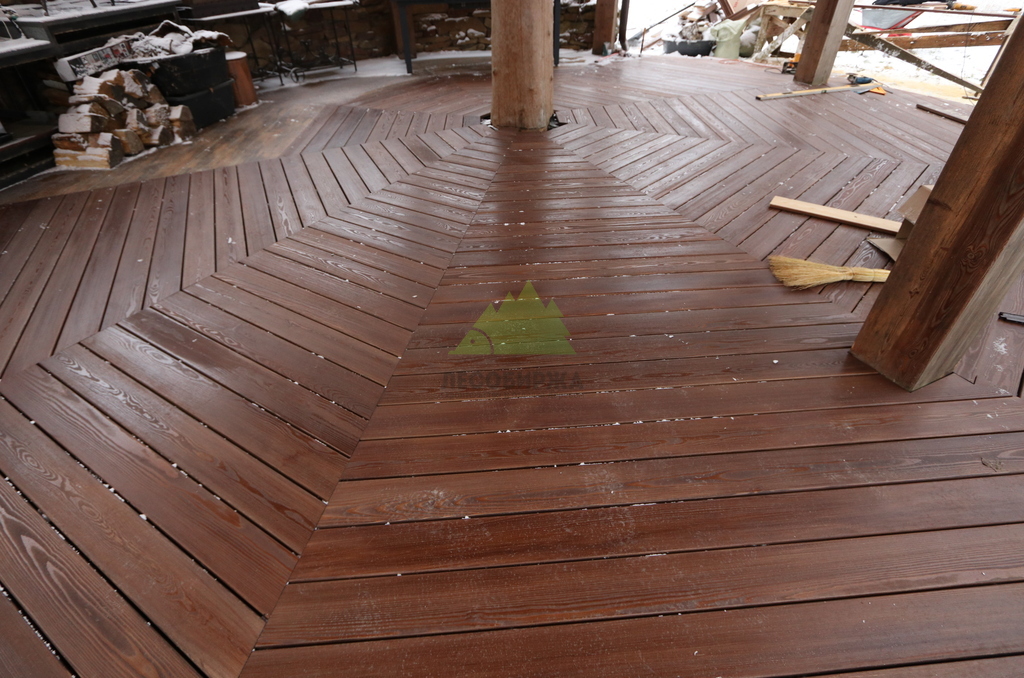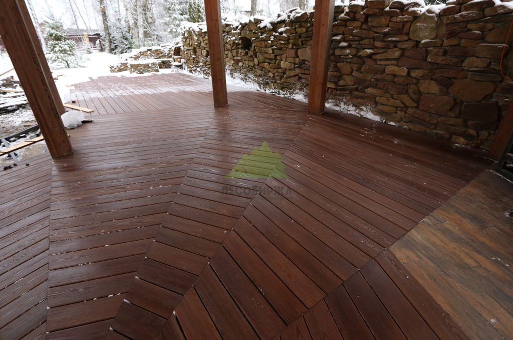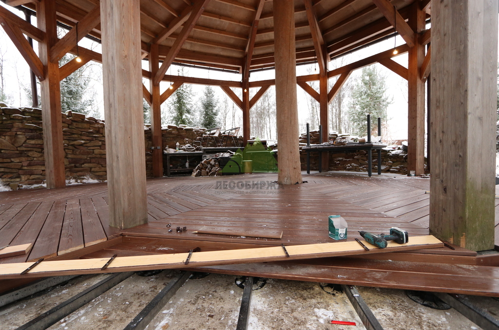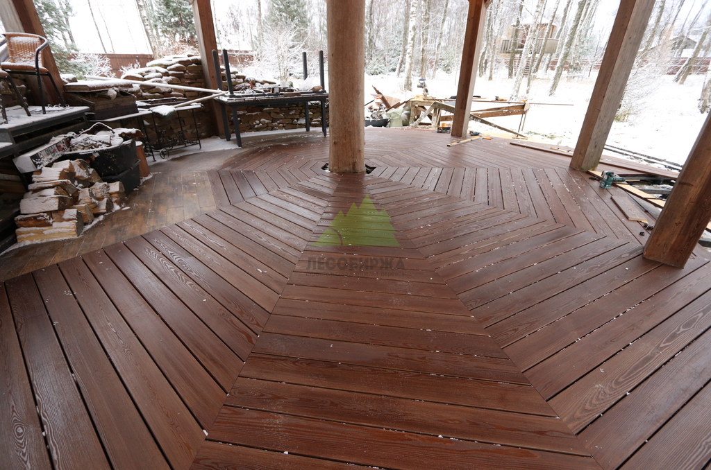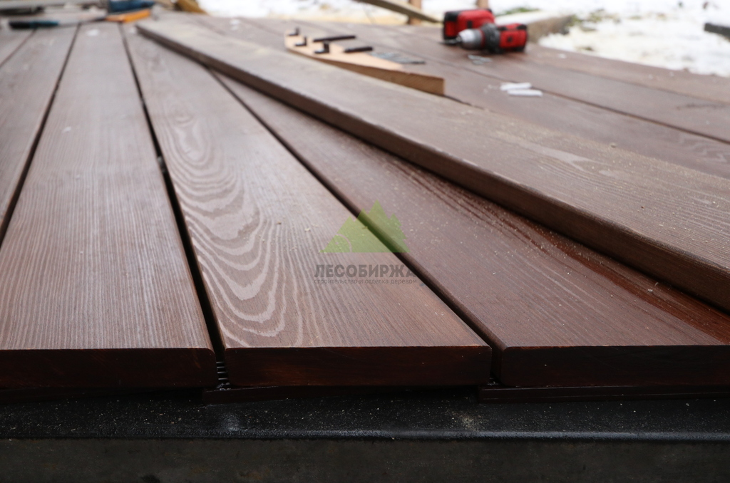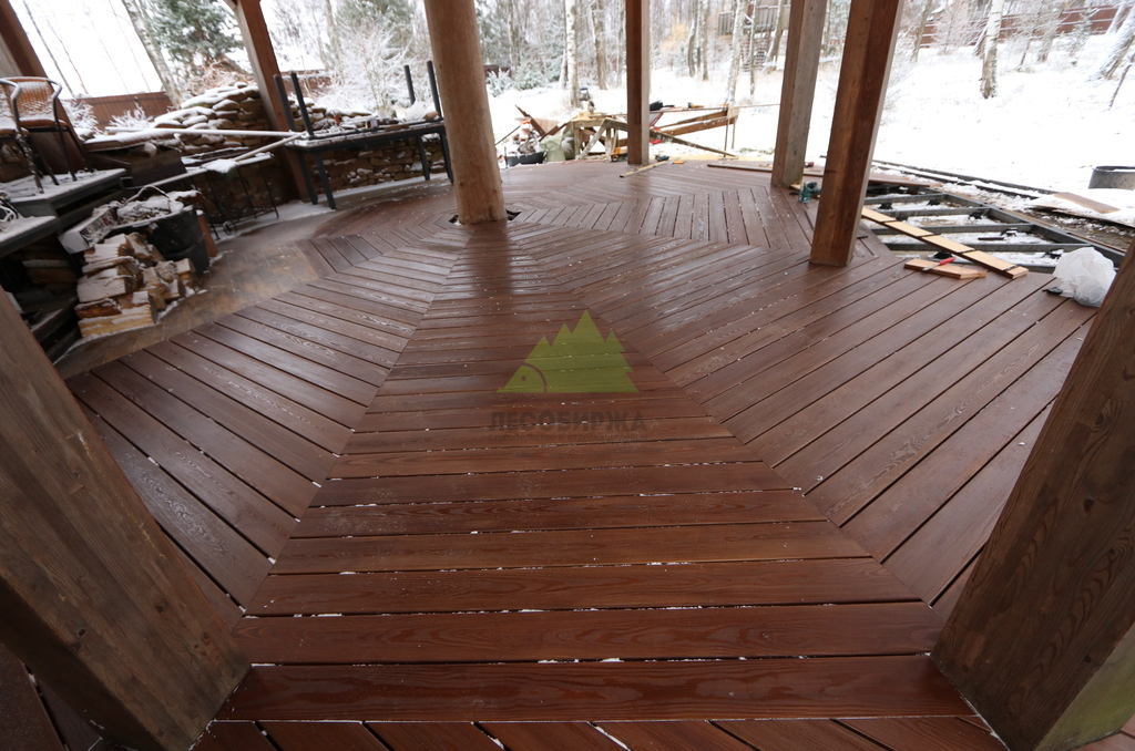 После сборки каркаса перешли к укладке террасной доски. Монтаж выполнялся с обязательными компенсационными зазорами, обеспечивающими нормальную работу древесины на улице. Крепёж подбирался с расчётом на уличные условия, чтобы исключить коррозию, скрипы и ослабление соединений со временем. Настил формировался аккуратно, с ровными линиями и чистыми примыканиями.