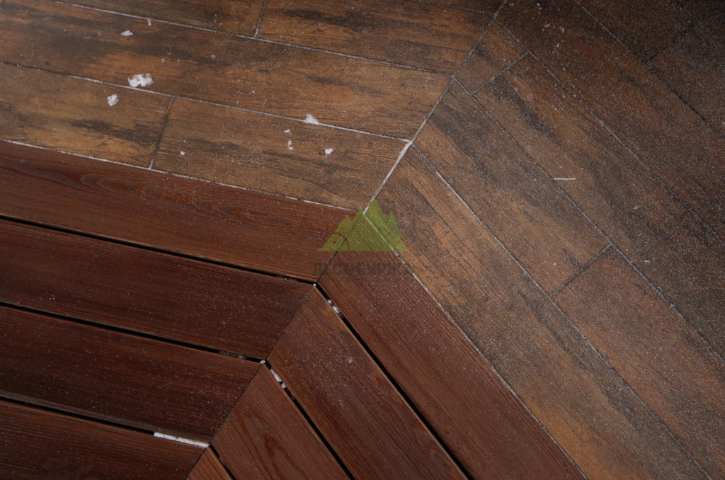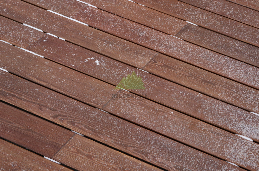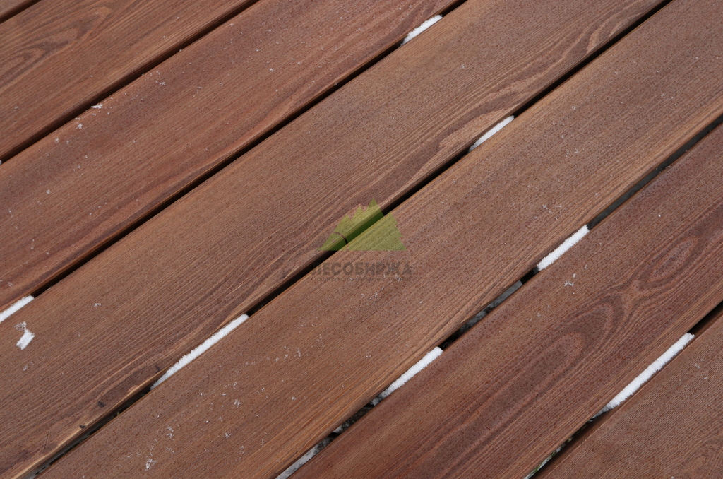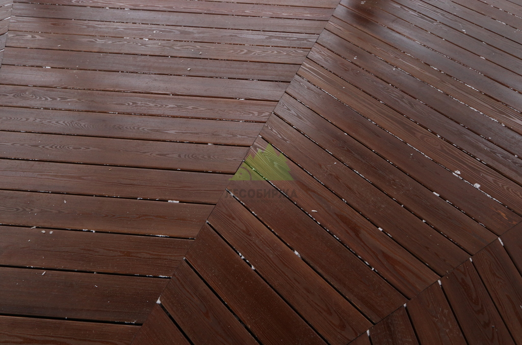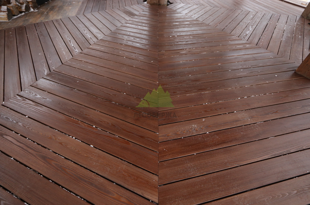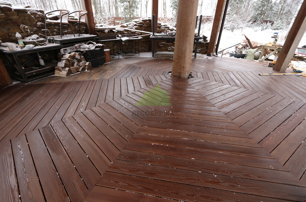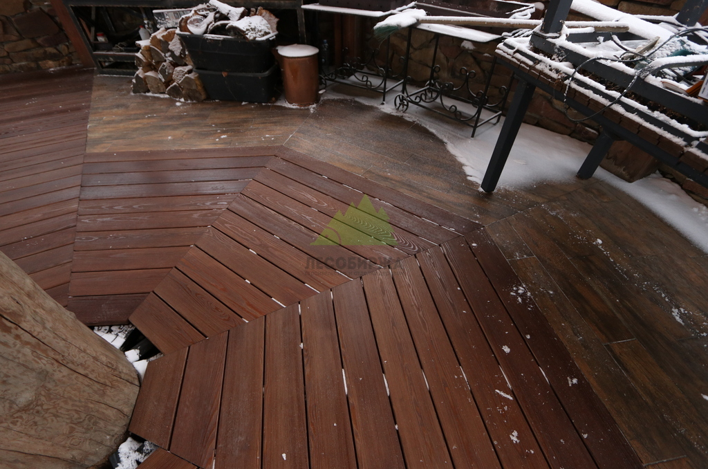 После сборки каркаса перешли к укладке террасной доски. Монтаж выполнялся с обязательными компенсационными зазорами, обеспечивающими нормальную работу древесины на улице. Крепёж подбирался с расчётом на уличные условия, чтобы исключить коррозию, скрипы и ослабление соединений со временем. Настил формировался аккуратно, с ровными линиями и чистыми примыканиями.