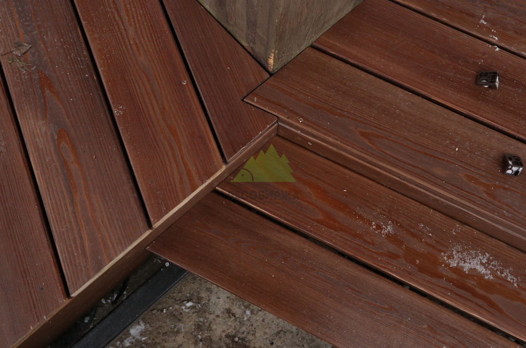 Далее были выполнены работы по устройству ступеней и переходных зон. Ступени собраны в едином стиле с основным настилом, с удобной высотой и безопасной геометрией. Все узлы примыканий были аккуратно подогнаны, чтобы терраса выглядела цельной конструкцией, а не набором отдельных элементов.