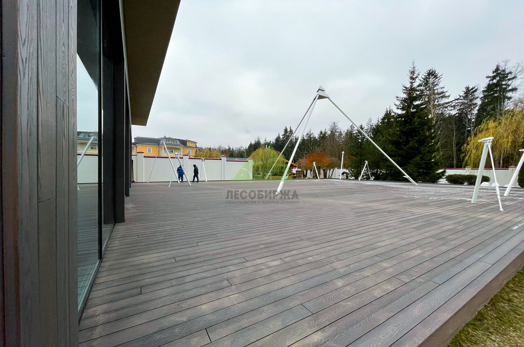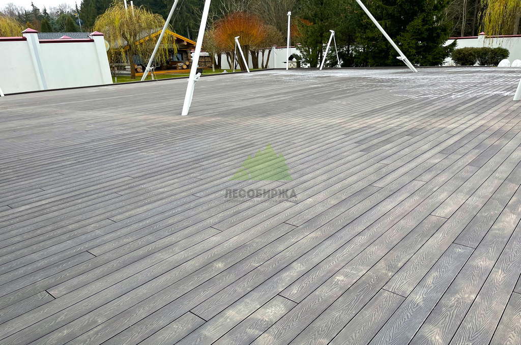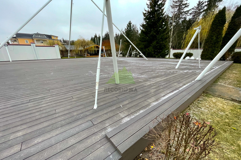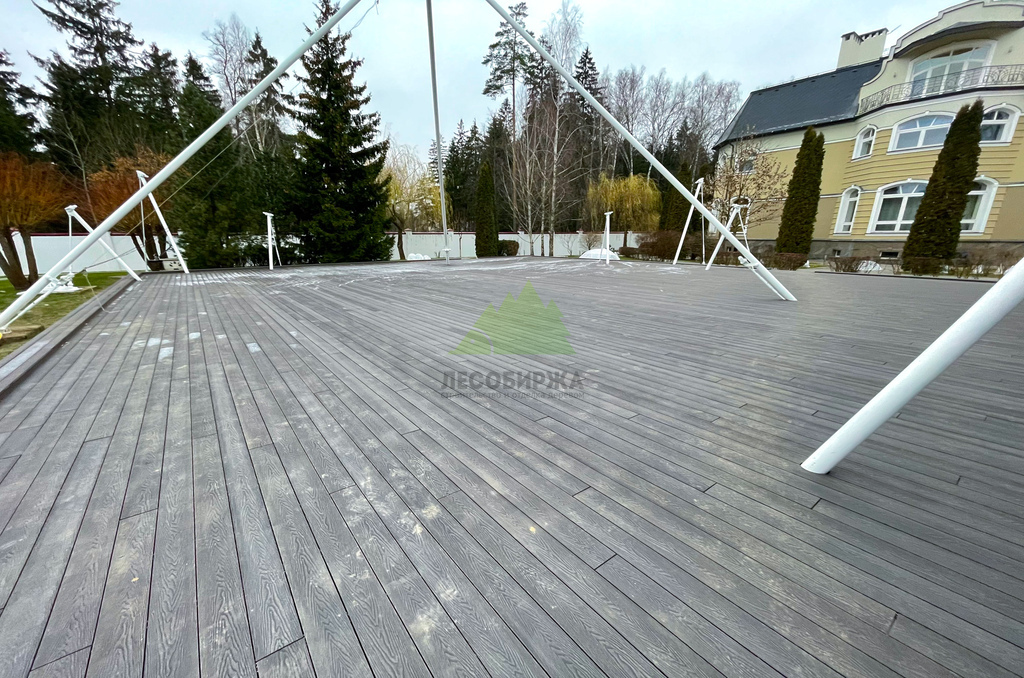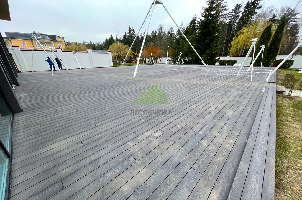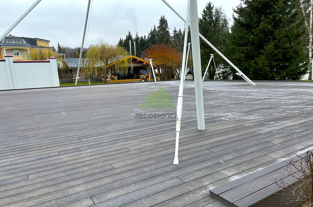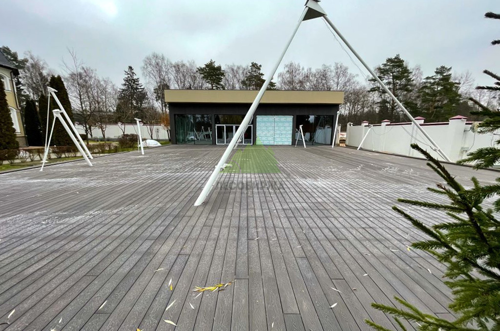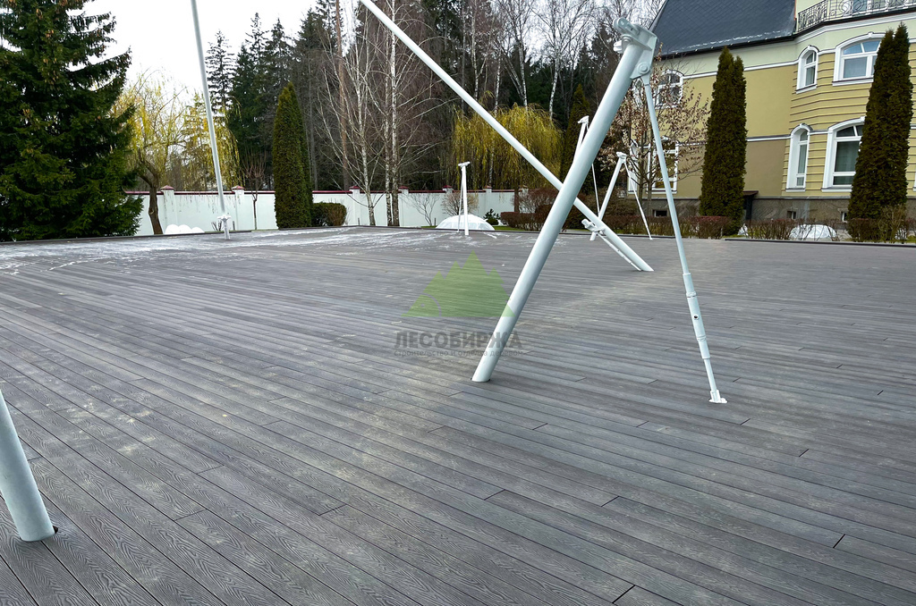 Для самого настила клиент совместно с нашими экспертами остановил свой выбор на полнотелой террасной доске из древесно-полимерного композита (ДПК) CM Decking Vintage. Этот материал является воплощением современных технологий, сочетая в себе лучшие качества древесины и полимеров. В его состав входит около 70% древесной муки и около 30% высококачественного полимера, дополненного стабилизирующими добавками. Выбор полнотелой доски был не случаен: несмотря на ее внушительный вес, она обладает феноменальными эксплуатационными характеристиками.