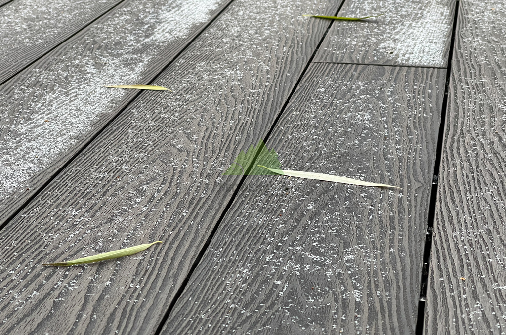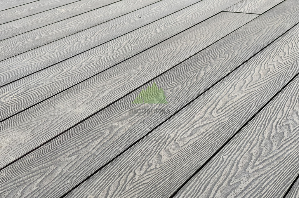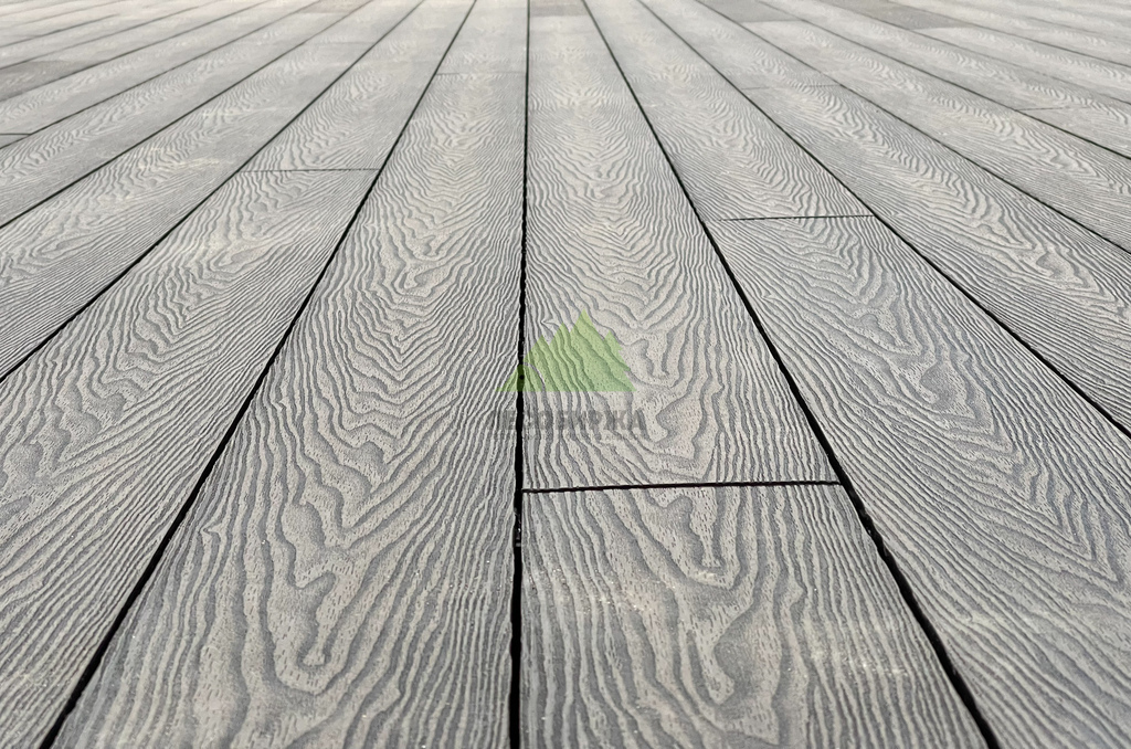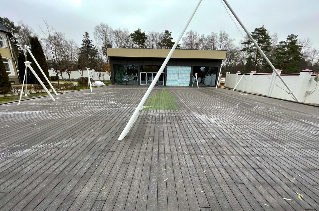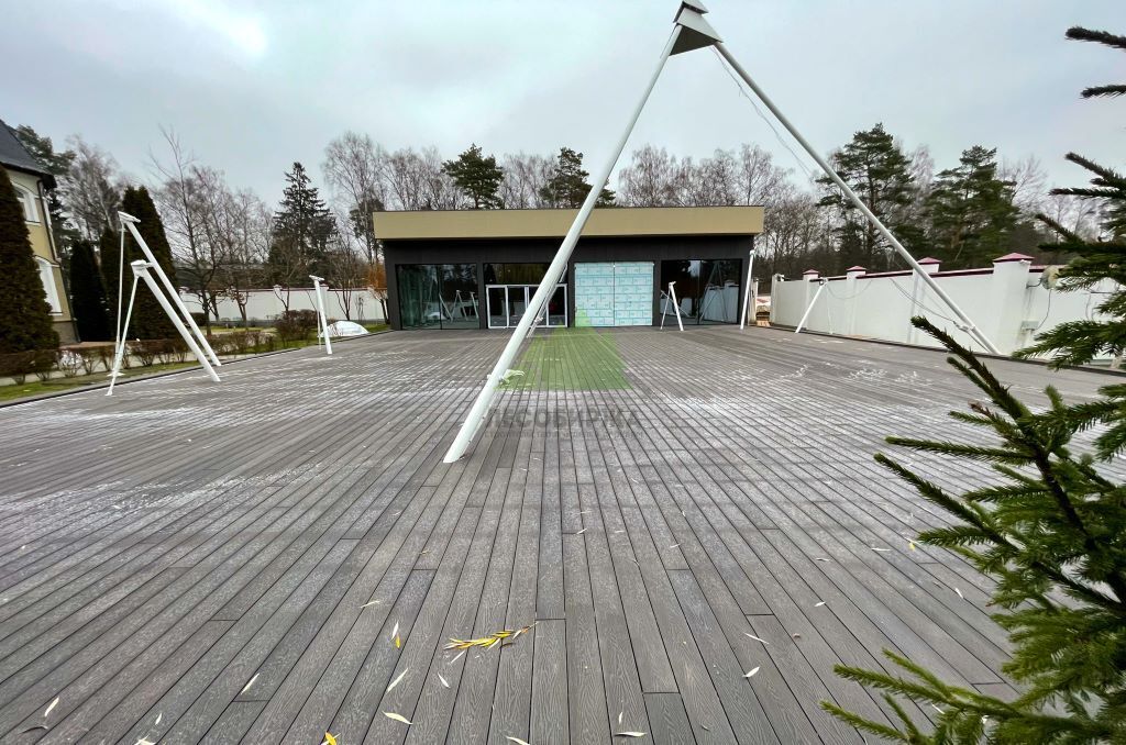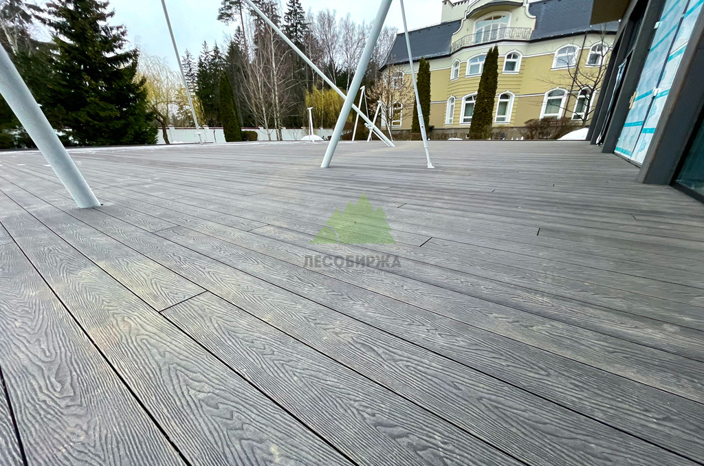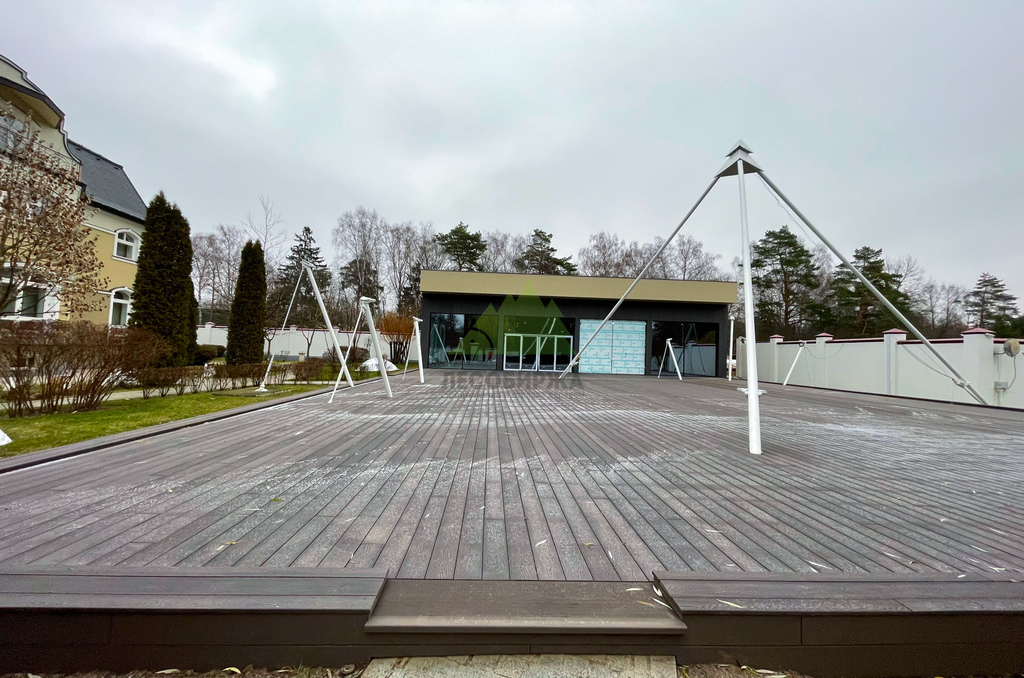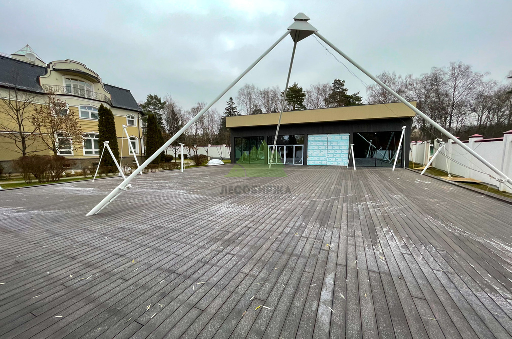 Для самого настила клиент совместно с нашими экспертами остановил свой выбор на полнотелой террасной доске из древесно-полимерного композита (ДПК) CM Decking Vintage. Этот материал является воплощением современных технологий, сочетая в себе лучшие качества древесины и полимеров. В его состав входит около 70% древесной муки и около 30% высококачественного полимера, дополненного стабилизирующими добавками. Выбор полнотелой доски был не случаен: несмотря на ее внушительный вес, она обладает феноменальными эксплуатационными характеристиками.