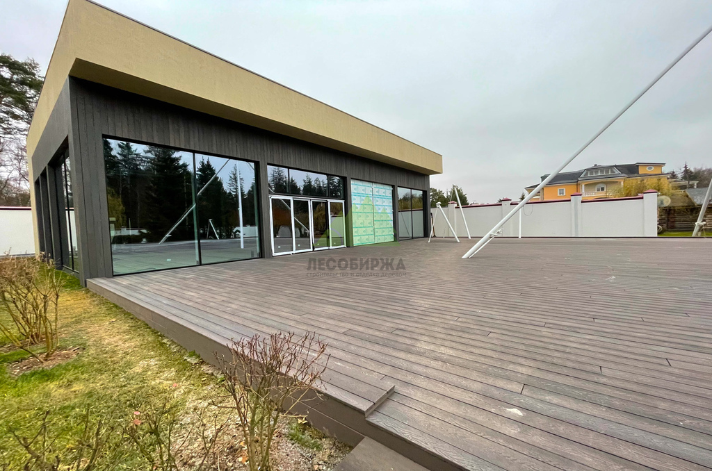 Площадь террасы на данном объекте была довольно внушительной, что позволило нам оптимально подобрать габариты доски: шириной 150 мм и длиной 6 м. Толщина панели в 18 мм является идеальной для террас, рассчитанных на большие и постоянные нагрузки. Наши мастера также аккуратно установили лобовую доску по периметру террасы, придавая конструкции законченный и эстетичный вид. Отдельно была выполнена профессиональная установка ступеней, обеспечивающих безопасный и удобный доступ на террасу. Каждая деталь была продумана и реализована с присущей Лесобирже-Спб скрупулезностью.