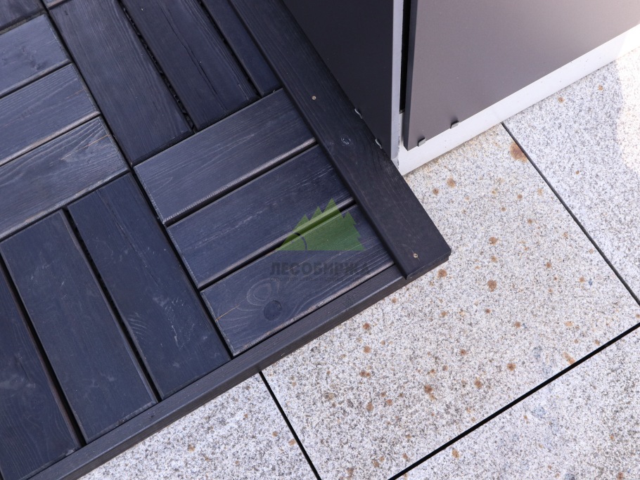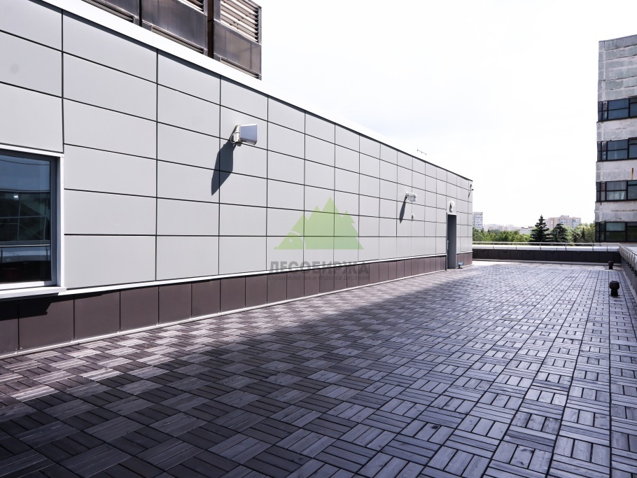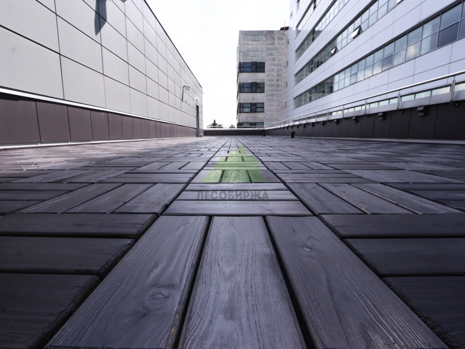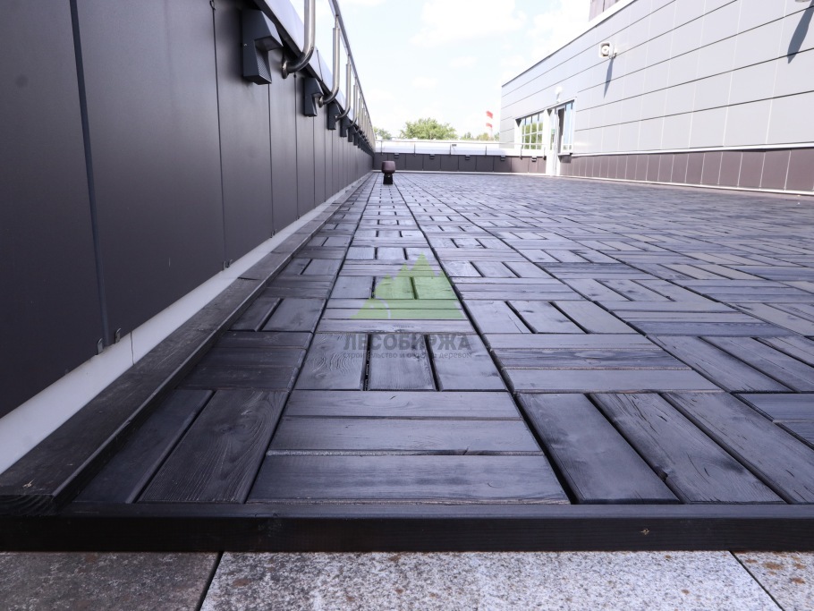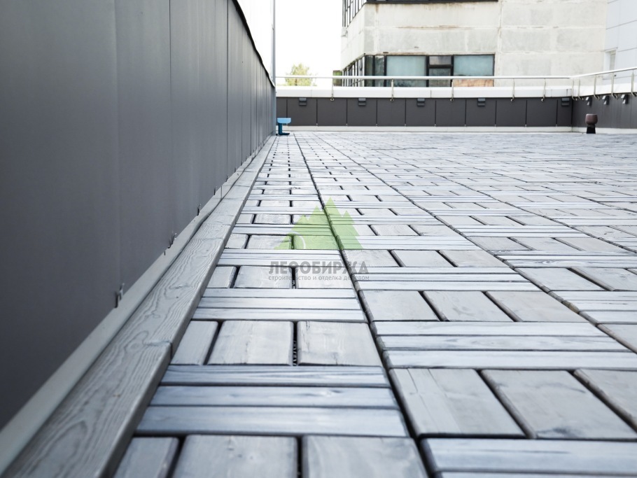Монтаж модулей на эксплуатируемой кровле – это процесс, требующий точности и аккуратности. Наши мастера укладывали их непосредственно на подготовленную бетонную стяжку, обеспечивая идеальное прилегание и ровность поверхности. Важным элементом монтажа является система крепления "шип-паз", благодаря которой модули надежно соединяются между собой, образуя единое, прочное и стабильное покрытие. Эта система исключает смещение элементов и образование щелей, гарантируя долговечность и безопасность эксплуатации террасы. По периметру крыши, а также в зонах примыкания к парапету и участкам с керамогранитным покрытием, модули были дополнительно поджаты специальными планками из термированной сосны. Это решение не только придает завершенность и эстетичность всей конструкции, но и выполняет важную функциональную роль, надежно фиксируя крайние элементы и предотвращая их деформацию или смещение в процессе эксплуатации. Такой подход обеспечивает безупречный внешний вид и максимальную надежность покрытия.