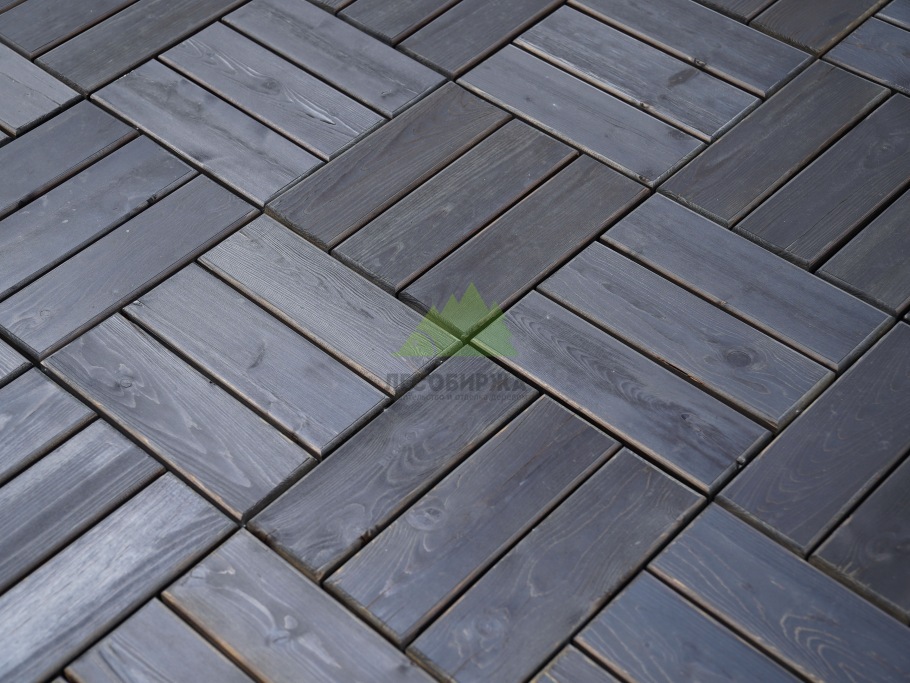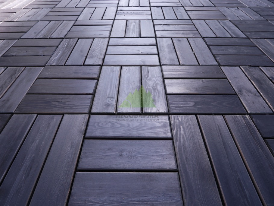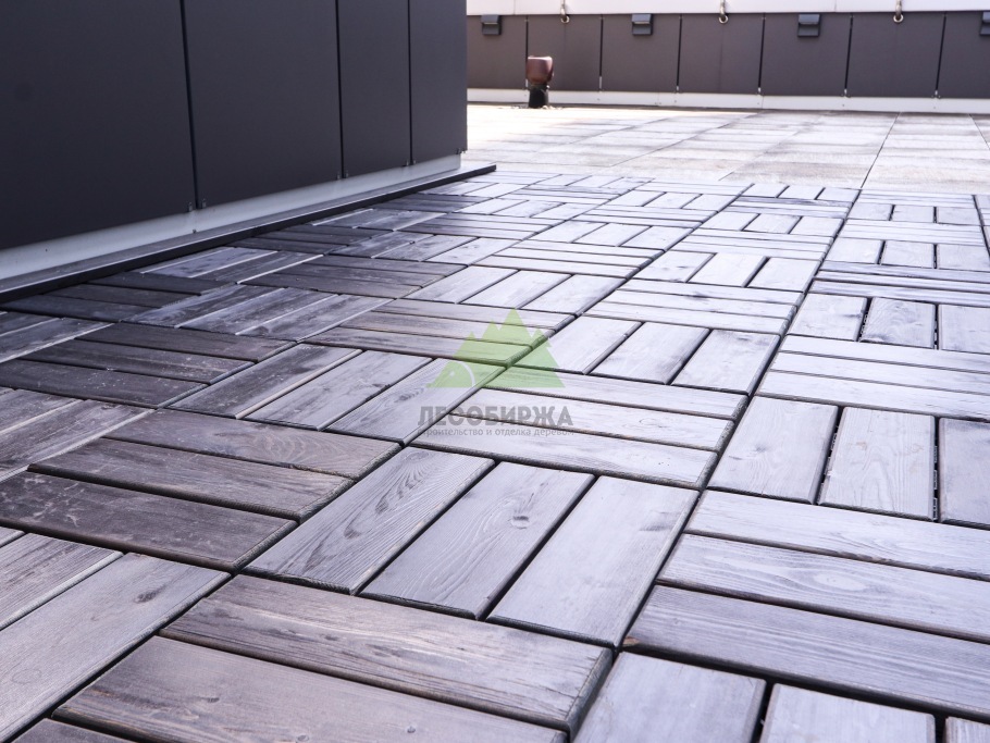 Изготовление садового паркета и облицовочных модулей для эксплуатируемой кровли – это многоэтапный процесс, требующий высокой квалификации и современного оборудования. Все работы по производству и покраске осуществлялись на собственном производстве "Лесобиржи-Спб", что позволяет нам гарантировать безупречное качество на каждом этапе. Модули состоят из гибкой пластиковой основы, которая обеспечивает не только легкость монтажа, но и эффективный отвод воды, предотвращая ее застой под покрытием. На эту основу с тыльной стороны надежно закреплены саморезами деревянные ламели – планки из термированной сосны в сорте АВ. Выбор сорта АВ для данного проекта был обоснован не только его экономической целесообразностью, но и эстетикой. В древесине этого сорта присутствуют живые сучки и небольшие смоляные кармашки, которые не влияют на прочность, но придают террасе особую природную фактуру и натуральность, подчеркивая естественное происхождение материала и его уникальный рисунок. Именно эти детали делают каждый модуль неповторимым, создавая на кровле по-настоящему живое и дышащее покрытие.