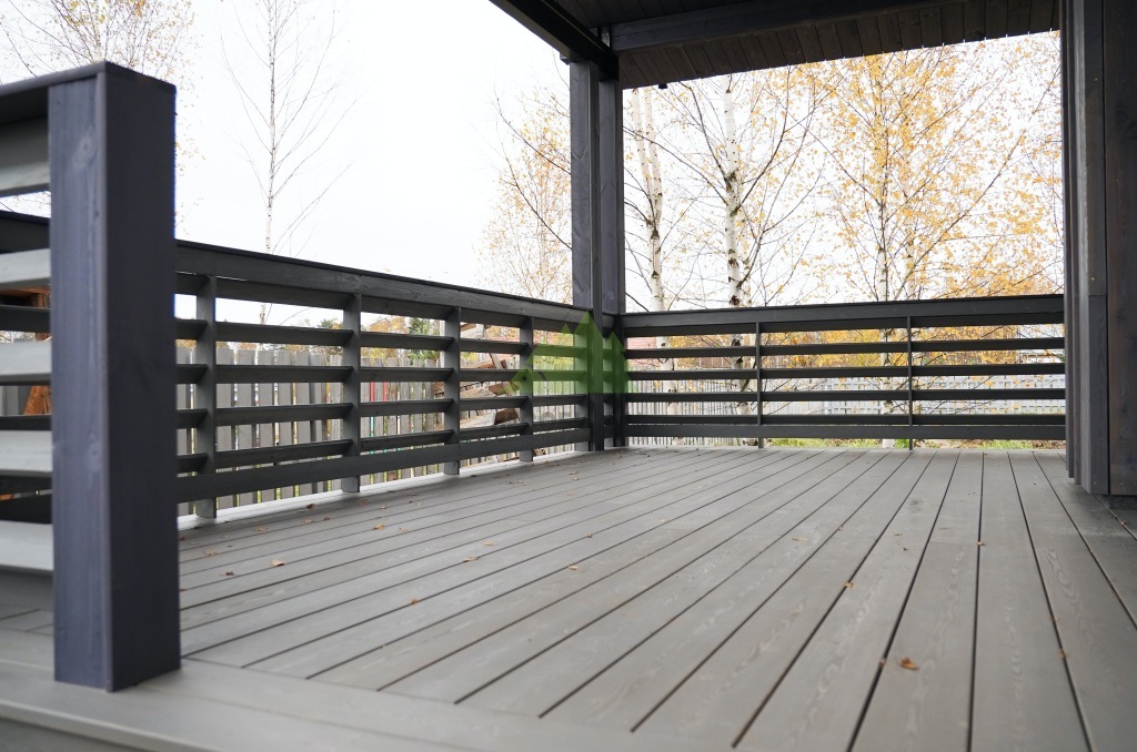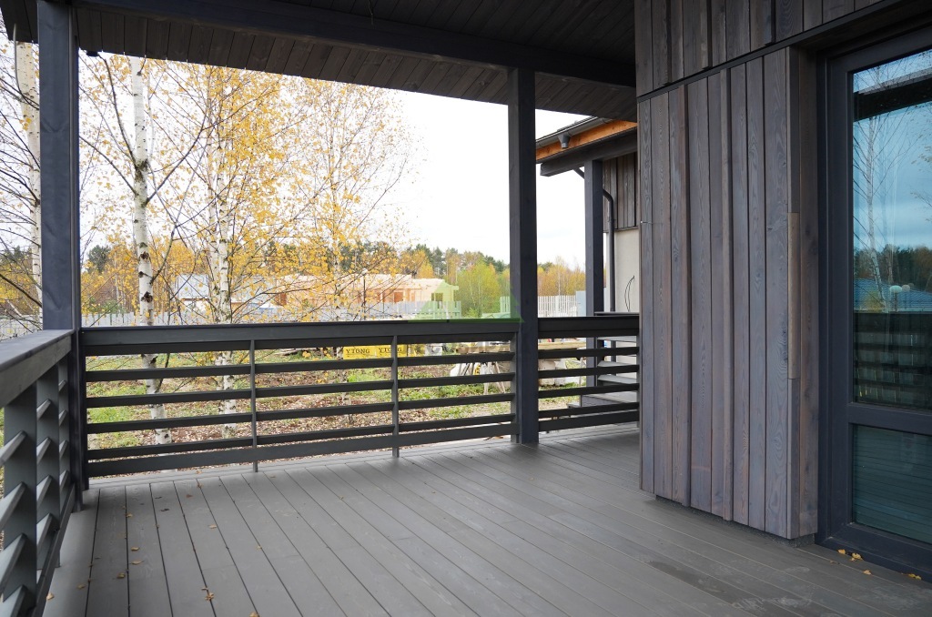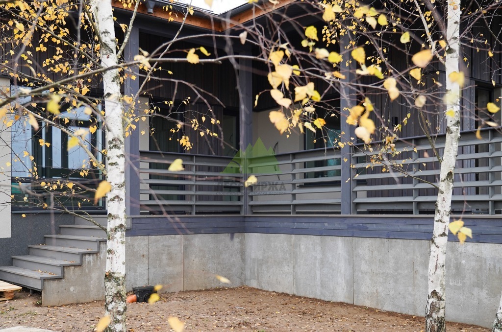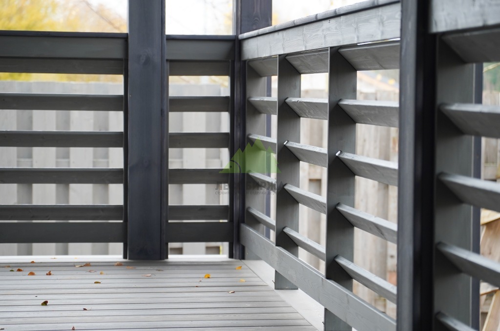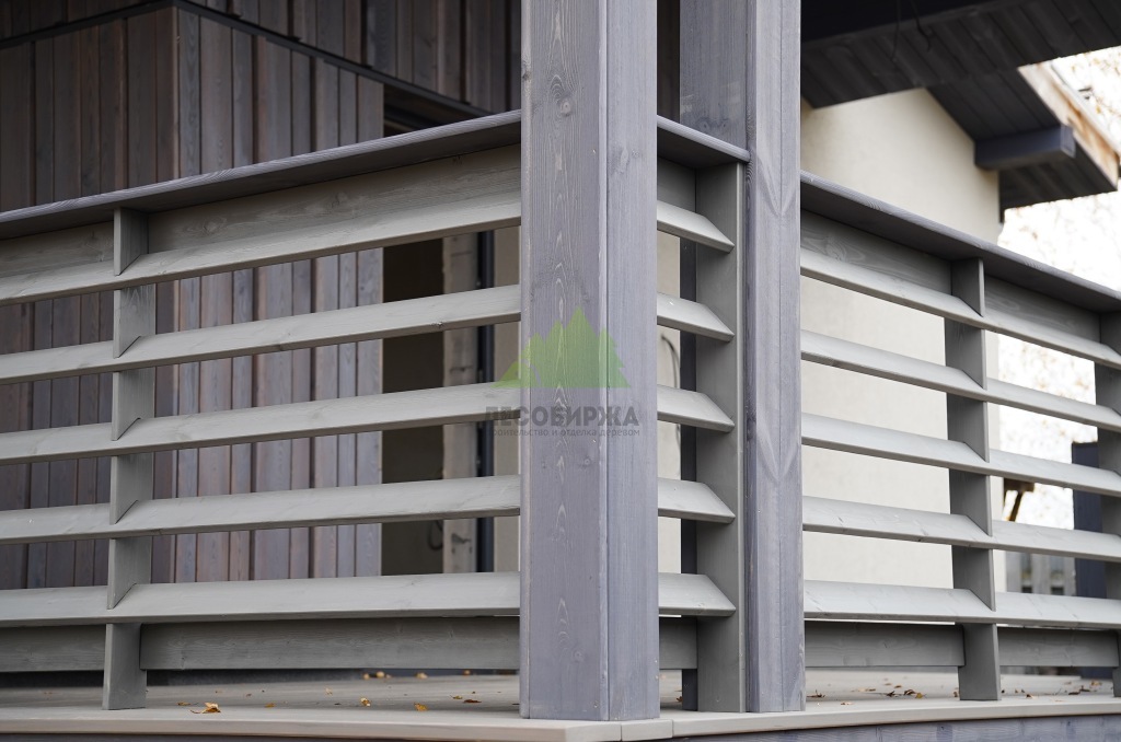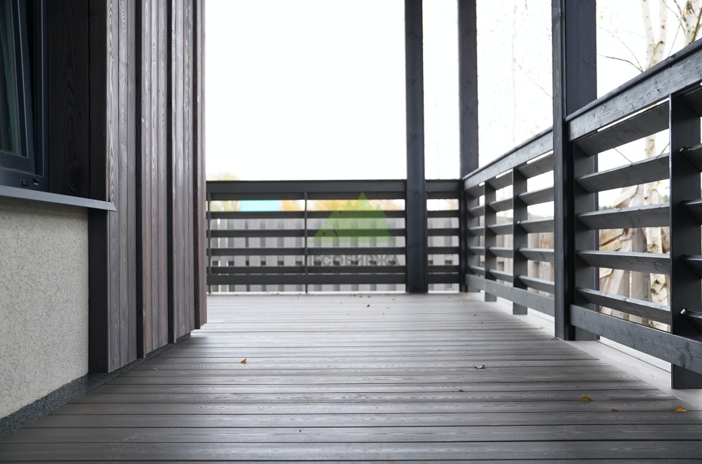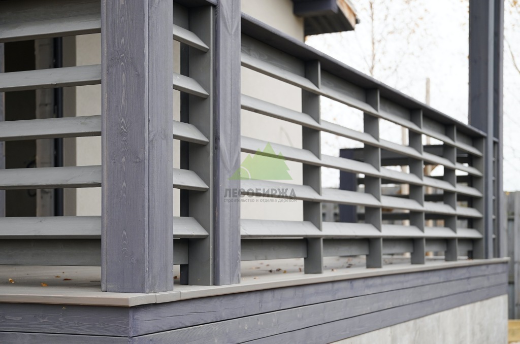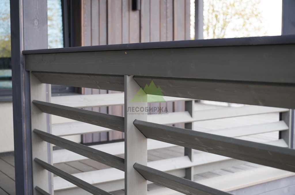 Особой изюминкой проекта стали ограждения террасы. Изготовленные в собственном столярном цехе "Лесобиржи-СПб", они выполнены из прямого планкена северной сосны сорта АВ, окрашенного маслом "Renner" М300 в цвет RAL 7006. Уникальный дизайн ограждений, с диагональным расположением планкена, напоминающим жалюзи, придает конструкции легкость и воздушность. Большое расстояние между элементами делает ограждения визуально невесомыми, не перегружая пространство, но при этом обеспечивая необходимую безопасность и приватность. Такая продуманная геометрия ограждений стала ярким акцентом, подчеркивающим индивидуальность проекта.