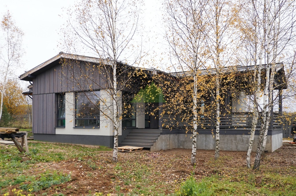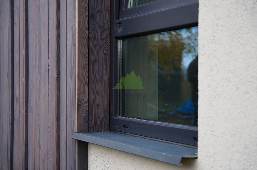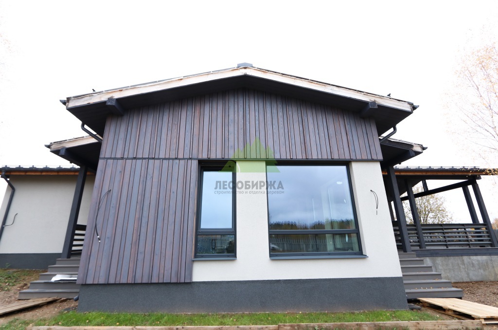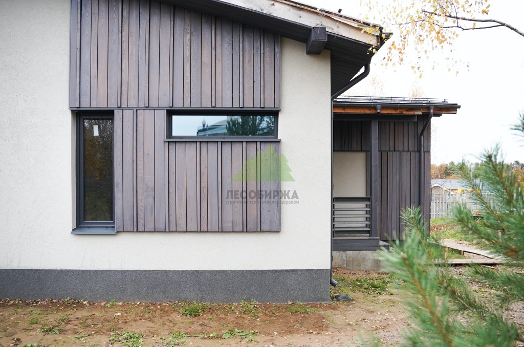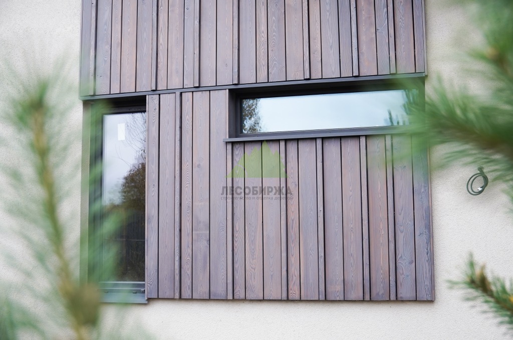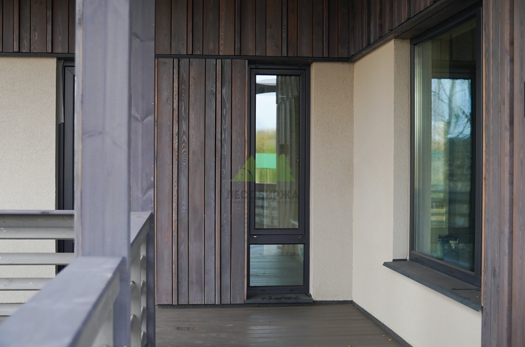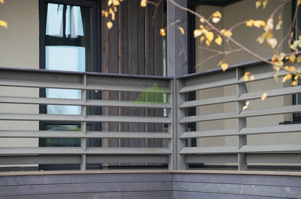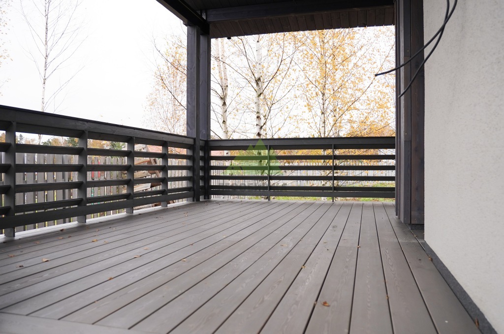 Особой изюминкой проекта стали ограждения террасы. Изготовленные в собственном столярном цехе "Лесобиржи-СПб", они выполнены из прямого планкена северной сосны сорта АВ, окрашенного маслом "Renner" М300 в цвет RAL 7006. Уникальный дизайн ограждений, с диагональным расположением планкена, напоминающим жалюзи, придает конструкции легкость и воздушность. Большое расстояние между элементами делает ограждения визуально невесомыми, не перегружая пространство, но при этом обеспечивая необходимую безопасность и приватность. Такая продуманная геометрия ограждений стала ярким акцентом, подчеркивающим индивидуальность проекта.