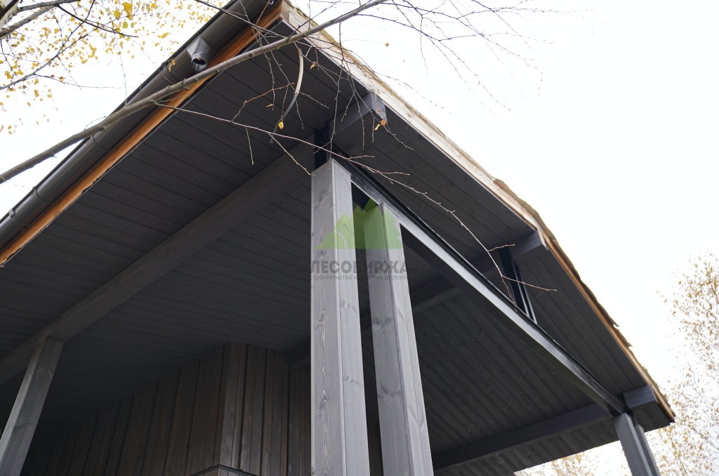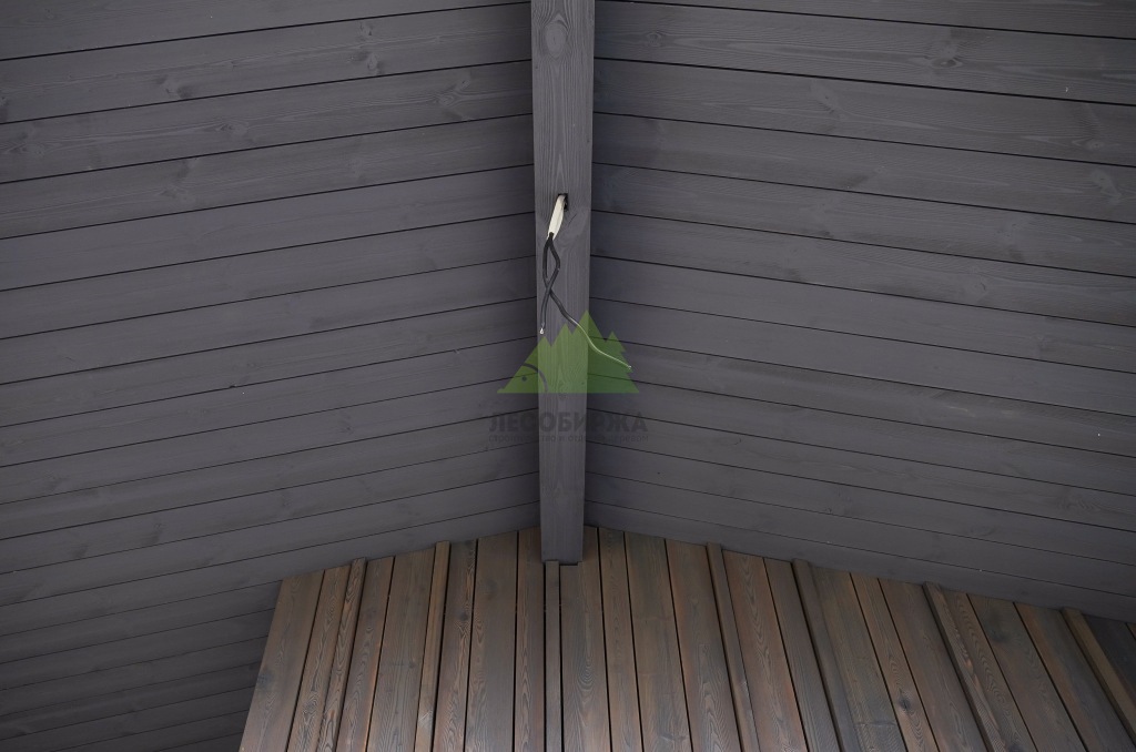 Поддерживающие навес над террасой столбы, а также свесы кровли и внутреннюю обшивку навеса мы обшили прямым планкеном из отборной "северной сосны" сорта АВ. Северная сосна, произрастающая в суровых условиях, отличается повышенной плотностью и прочностью по сравнению с древесиной из южных регионов. Этот факт подтверждают многочисленные исследования, включая фундаментальные труды академика Б.П. Уголева в области древесиноведения. Использование такой сосны гарантирует не только превосходный внешний вид, но и высокую эксплуатационную надежность конструкций.