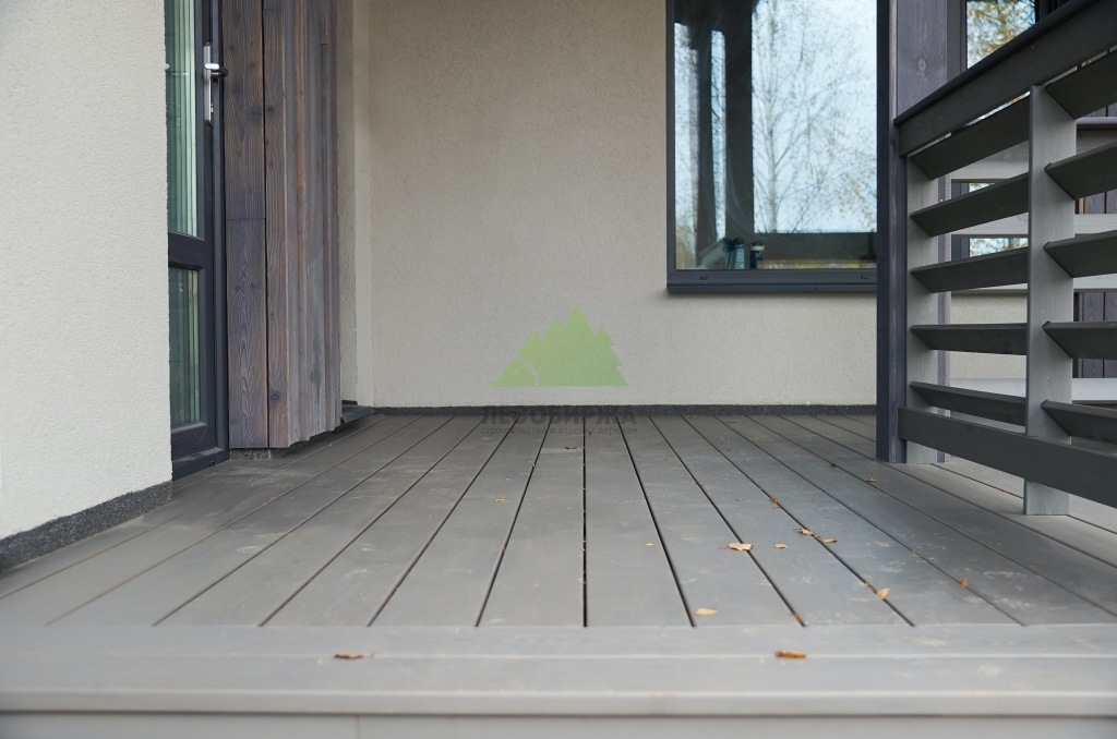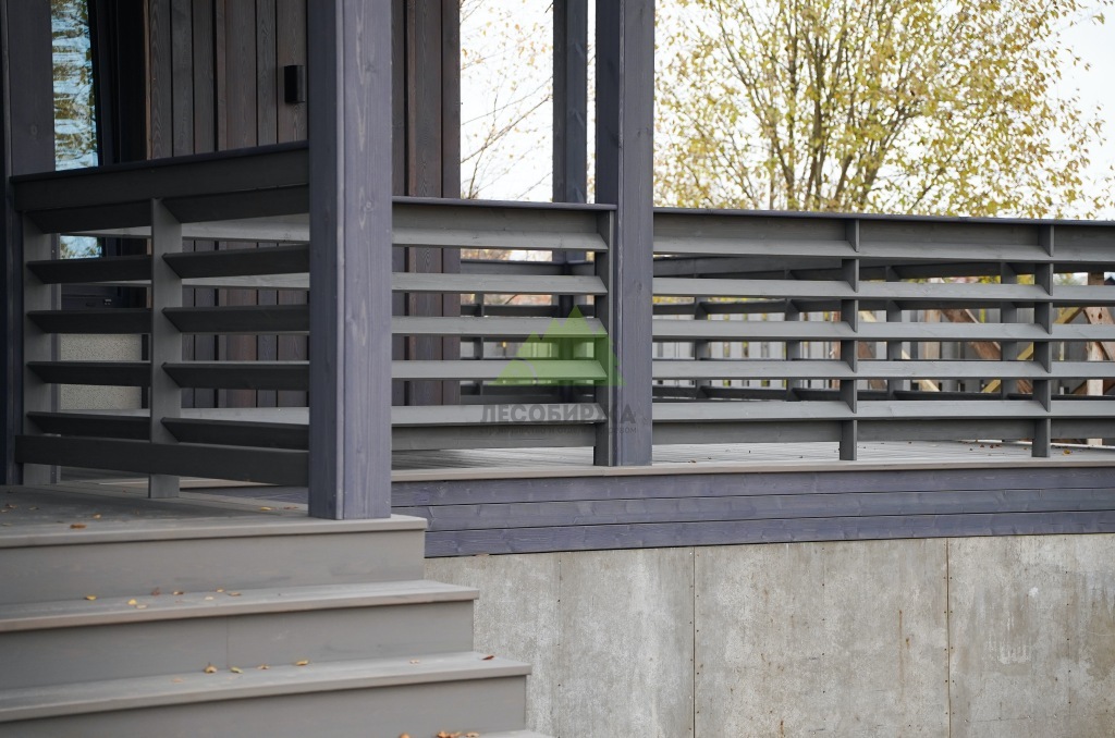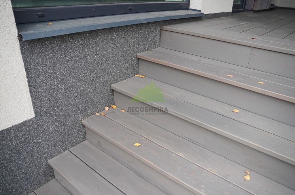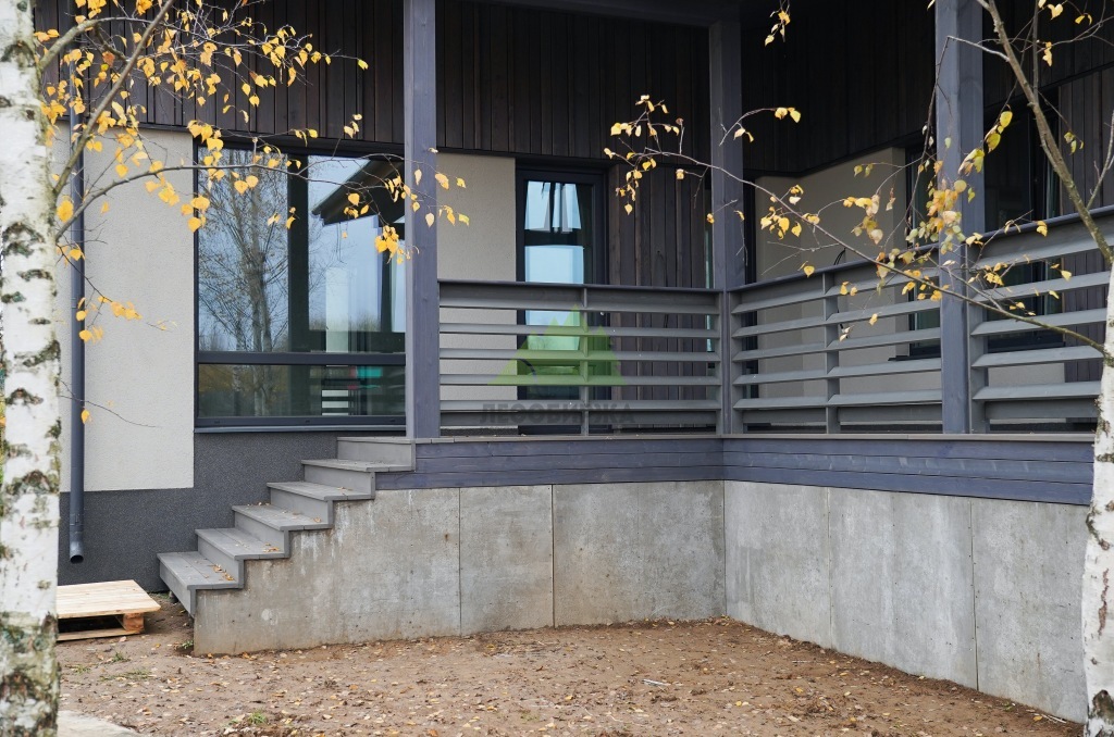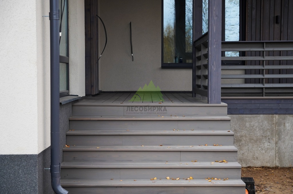 Особое внимание уделили входной группе. Была сооружена прочная бетонная лестница, которая затем была тщательно обшита той же палубной доской из лиственницы, что и основной настил террасы. Это обеспечило единство стиля и материалов, создав ощущение цельности и завершенности. Единый цвет настила и ступеней делает переход от дома к террасе плавным и гармоничным, подчеркивая продуманность каждой детали.