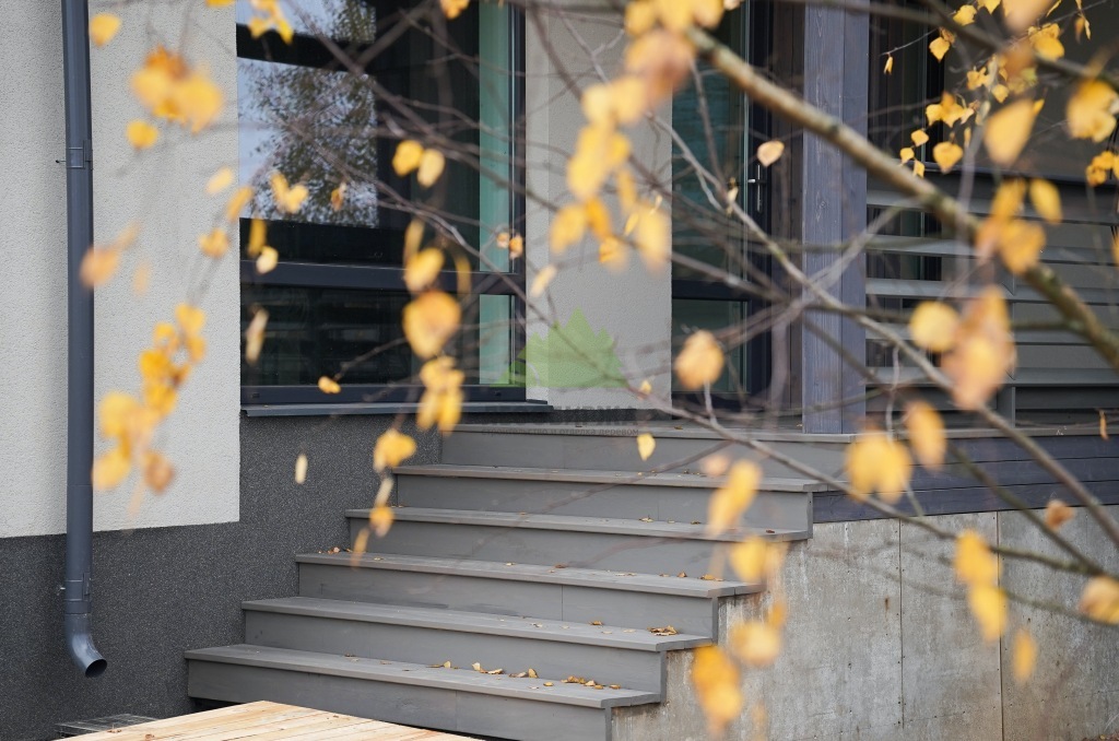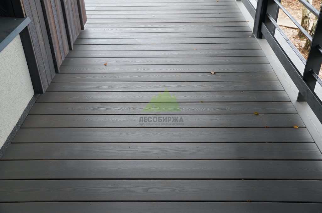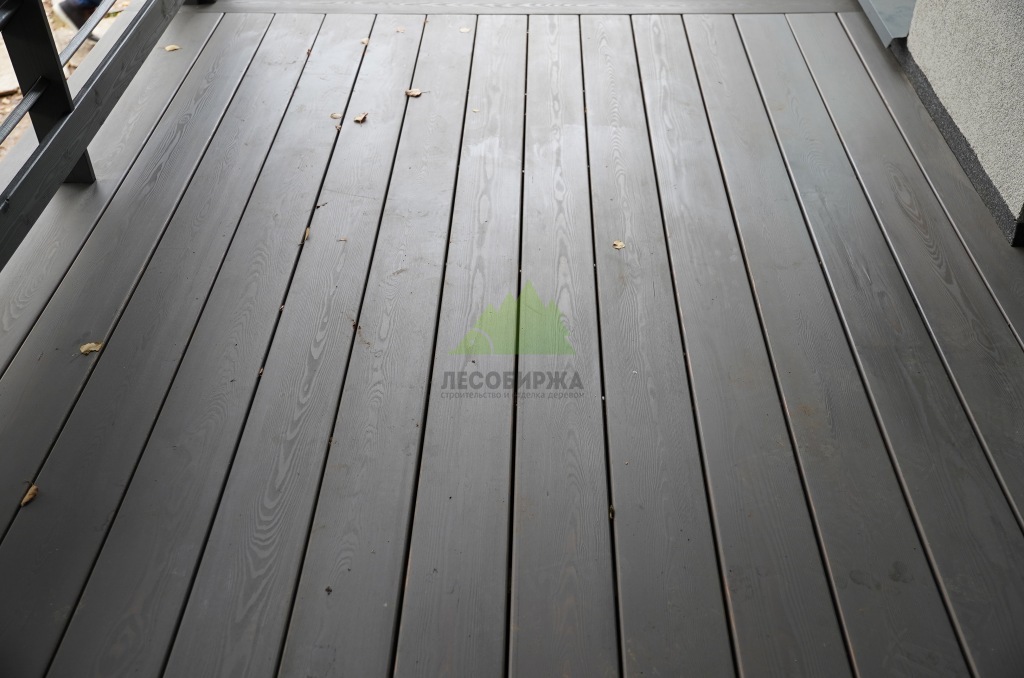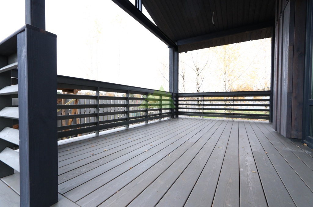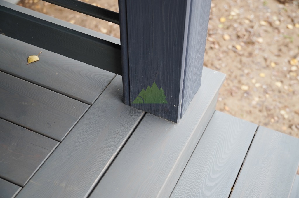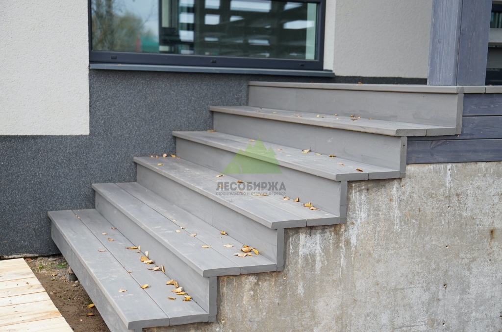 Особое внимание уделили входной группе. Была сооружена прочная бетонная лестница, которая затем была тщательно обшита той же палубной доской из лиственницы, что и основной настил террасы. Это обеспечило единство стиля и материалов, создав ощущение цельности и завершенности. Единый цвет настила и ступеней делает переход от дома к террасе плавным и гармоничным, подчеркивая продуманность каждой детали.