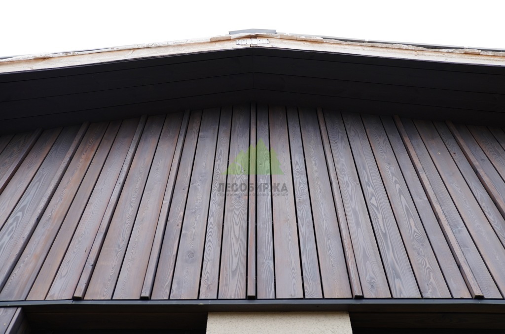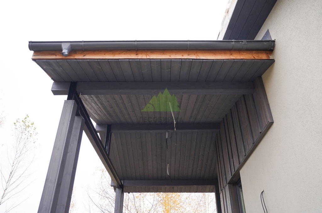 Для окраски планкена, как на столбах, так и на свесах, мы выбрали масло "Renner" M300 в цветовой гамме NCS 7005 – R80B. Этот оттенок был подобран таким образом, чтобы идеально сочетаться с основным цветом террасного настила, создавая единую, сбалансированную композицию. В результате, вся конструкция навеса выглядит органично и завершенно, дополняя общую эстетику дома.