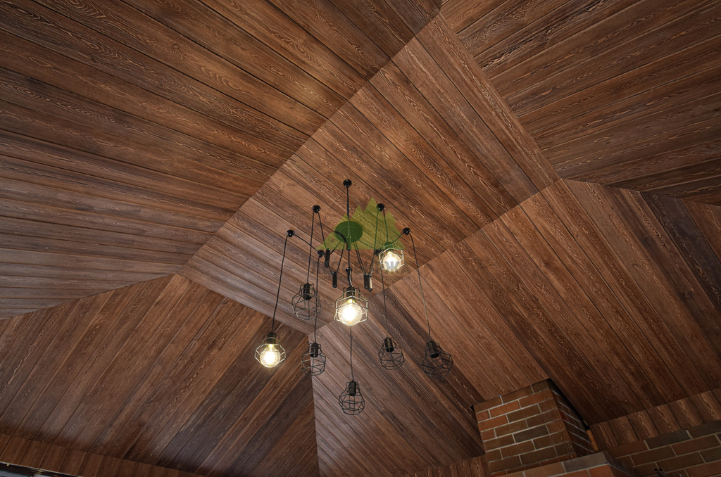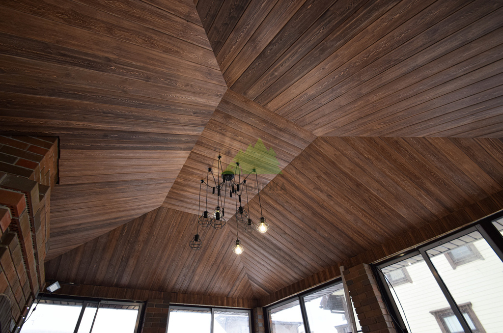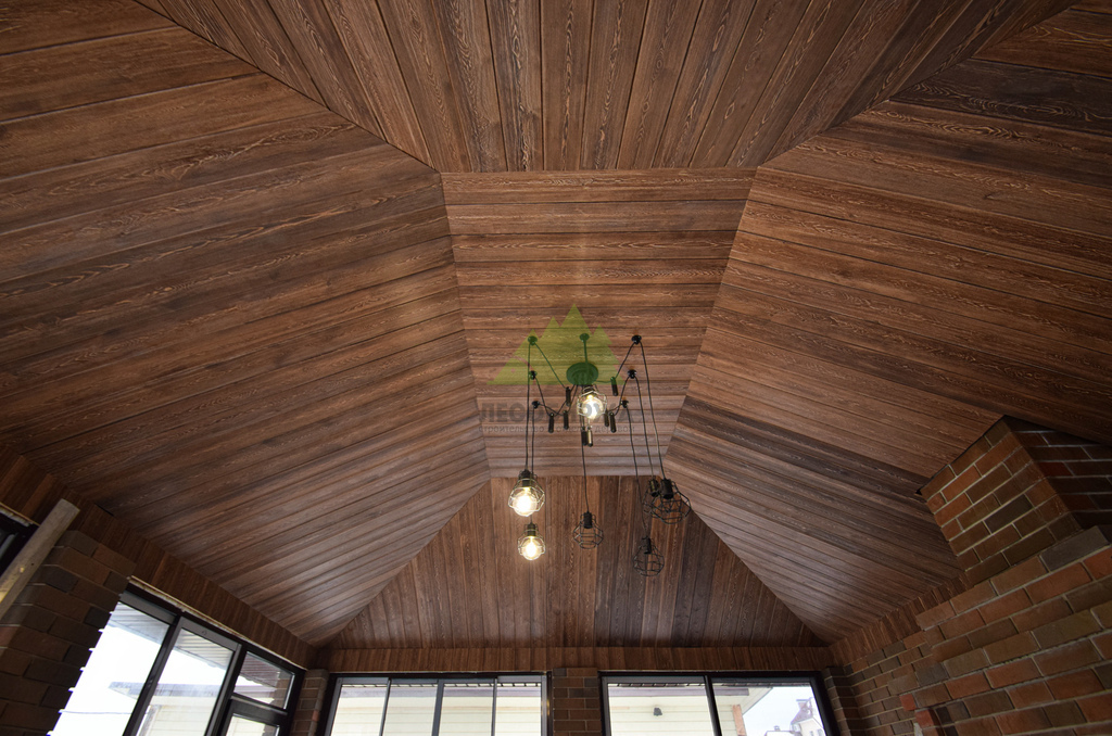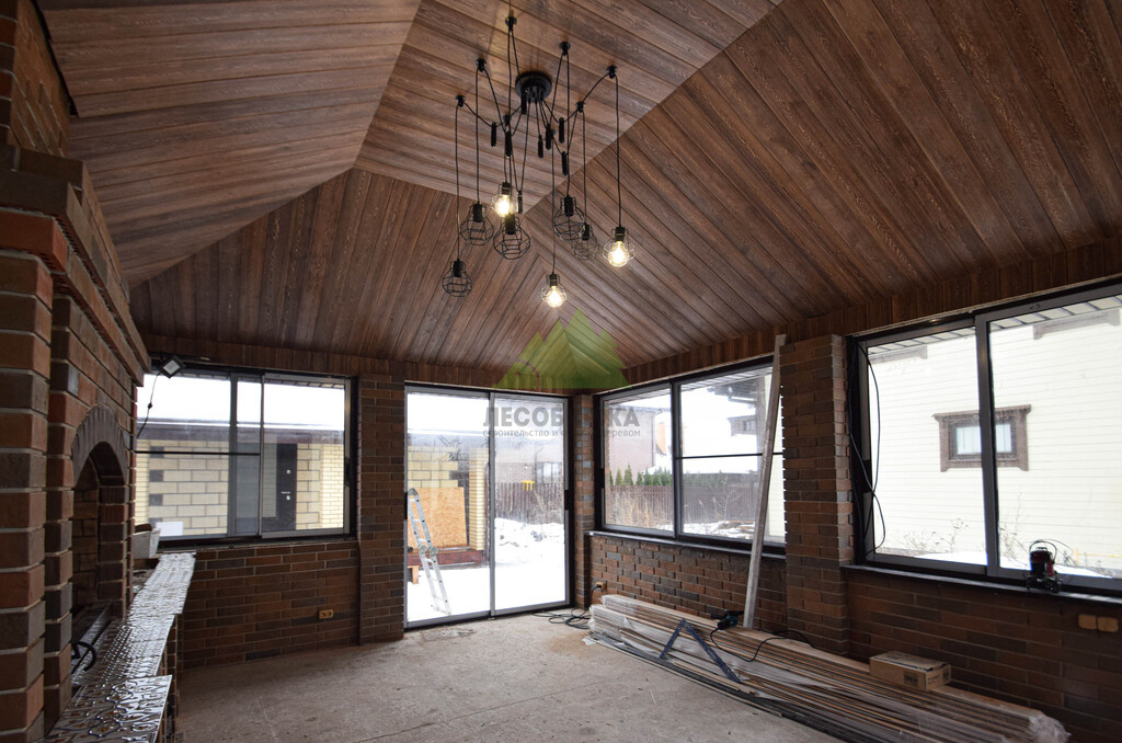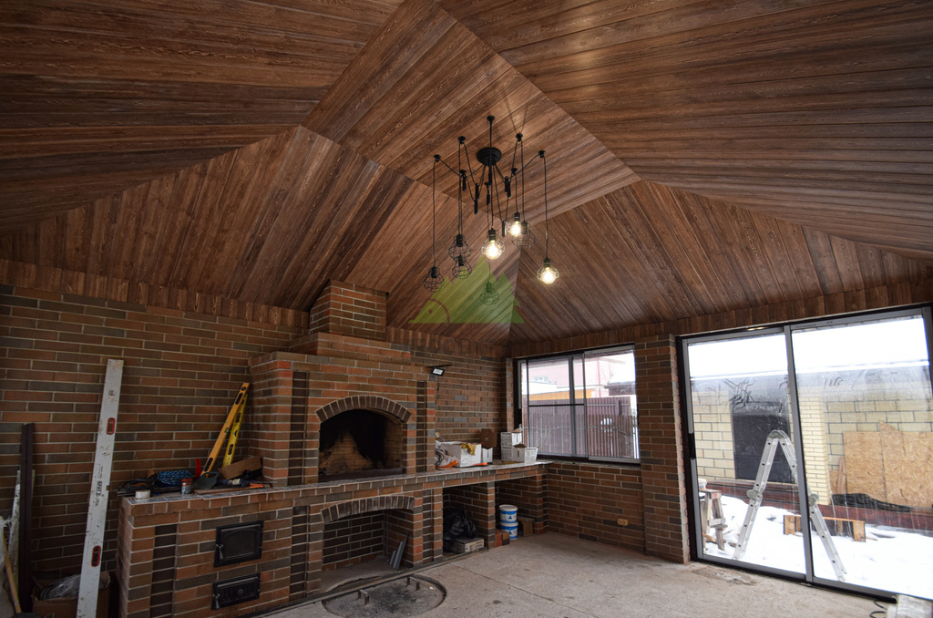 Заказ на отделку беседки поступил к нам из коттеджного поселка Ольшаники-2, где мы смогли создать не просто функциональное пространство, а настоящую архитектурную жемчужину. Это строение превзошло все ожидания. Перед нами предстала не просто беседка, а полноценная малая архитектурная композиция с панорамным остеклением и стеклянной раздвижной дверью, наполняющей пространство светом и воздухом. В центре интерьера – массивная, искусно сложенная печь, напоминающая произведение искусства. Ее кирпичная кладка, выполненная в насыщенных красновато-коричневых тонах, послужила отправной точкой для наших колористов и мастеров малярного цеха при выборе идеального оттенка для потолочной вагонки. Потолок беседки заслуживает особого внимания: он имеет сложную, "ломаную" форму, создающую эффект небольшого купола. Эта многоуровневая конструкция, состоящая из трапециевидных боковых сегментов и центрального прямоугольника, придала помещению уникальный, выразительный характер. Для его обшивки была выбрана вагонка из ангарской сосны сорта АВ(В).