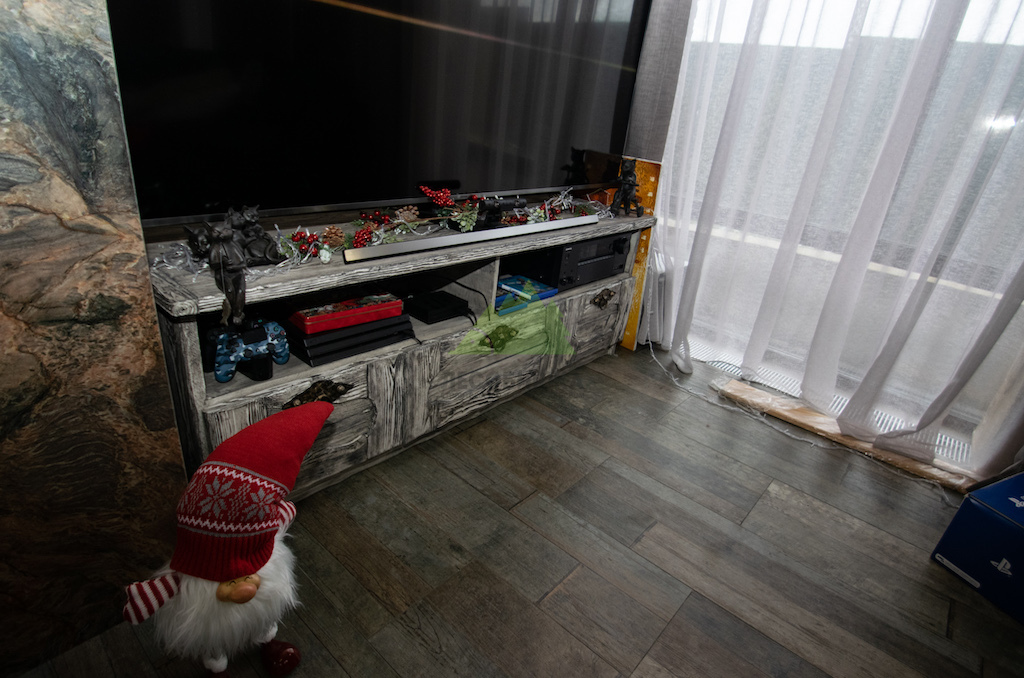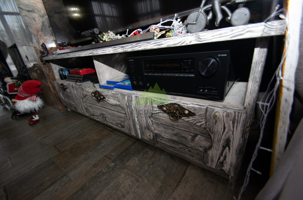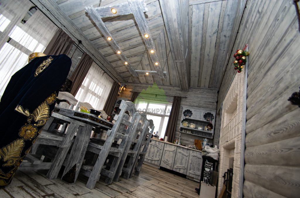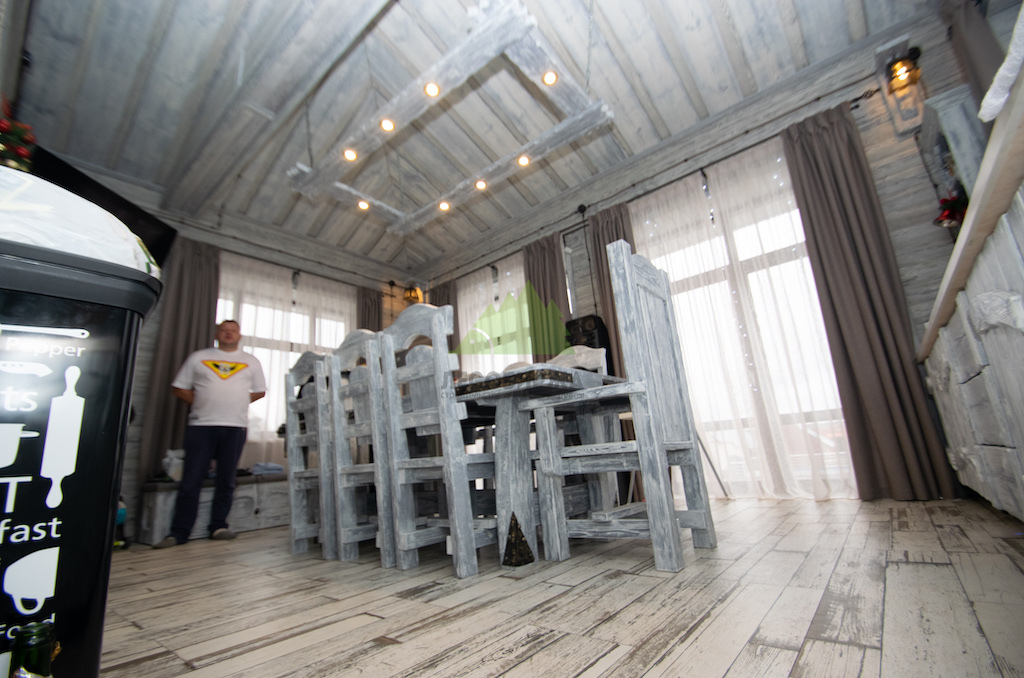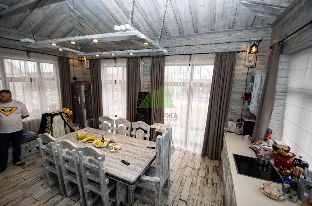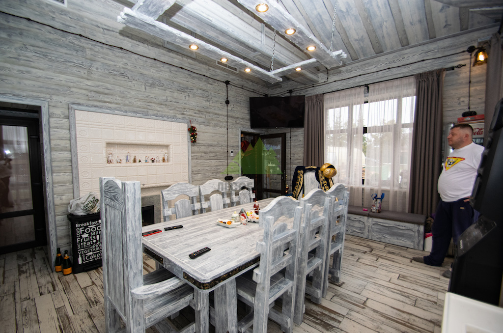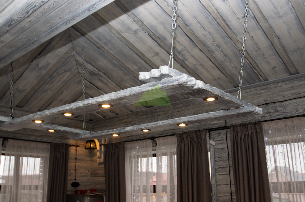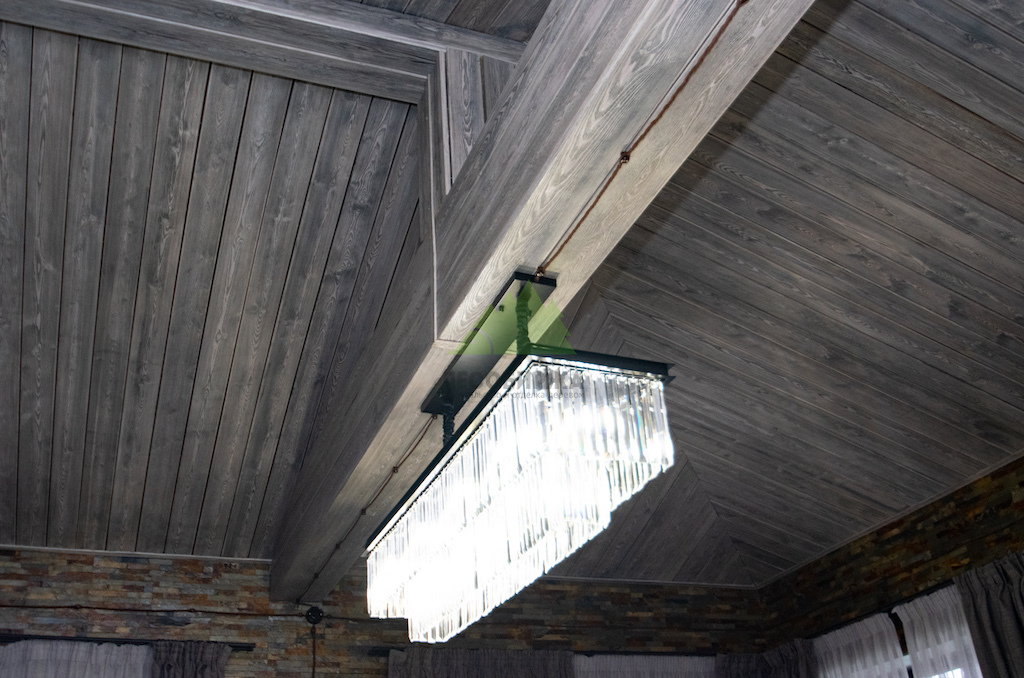 Для потолка мы разработали особенное решение — слэбы. Это продольно распиленные цельные части древесины, которые в интерьере выступают как самодостаточные и впечатляющие изделия. Такой способ распила позволяет максимально раскрыть всю красоту и благородство дерева, его неповторимый рисунок, богатую палитру оттенков и величественную мощь. При обработке слэбов мы стремились сохранить все особенности ствола: его естественные неровности, сучки, уникальные контуры, подчеркивая их природную красоту. Эти слэбы также были обработаны по технологии "Зимняя Сказка", что идеально вписалось в общую концепцию винтажного дома. Монтаж слэбов проводился внахлест, а в местах примыкания к стенам были установлены дополнительные стильные светильники, создающие мягкую подсветку и усиливающие эффект.
