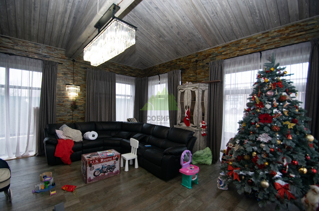 Комната отдыха в этом доме — это подлинное воплощение винтажного стиля. Здесь "старое" посеревшее дерево гармонично соседствует с кирпичной кладкой, а полы из специально подобранной плитки идеально вписываются в стилистику, заданную клиентом. Особенным шиком стала декоративная потолочная балка, которая не только визуально зонирует пространство, но и служит добротным основанием для великолепной люстры с множеством подвесок, стилизованных под хрусталь. Идентичные светильники, расположенные на стенах, поддерживают необходимую симметрию и создают равномерное, мягкое освещение, подчеркивающее уют. Наши дизайнеры тщательно продумали каждую деталь, чтобы интерьер не выглядел перегруженным, но при этом был функциональным и эстетически завершенным.